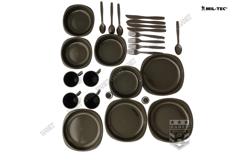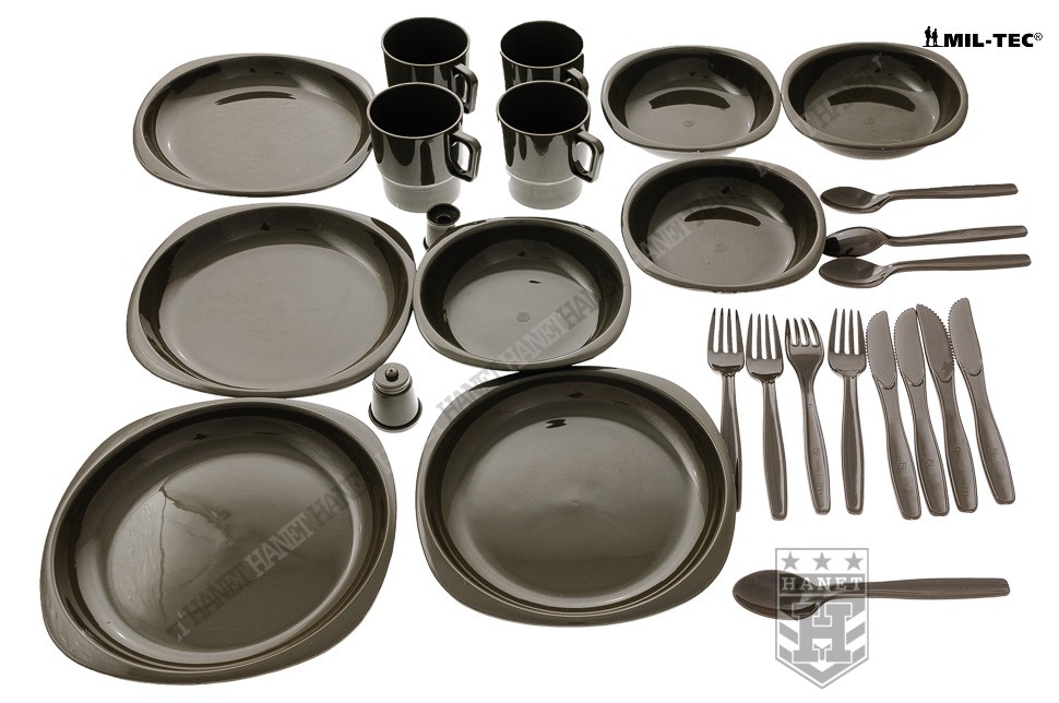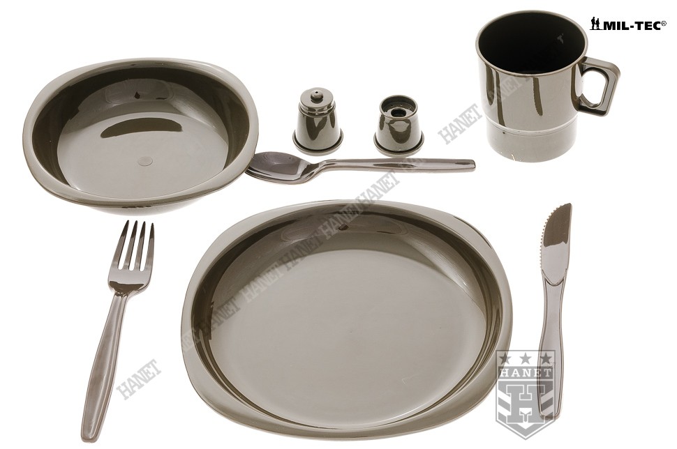 Zestaw naczyń turystycznych o specyfikacji militarnej. Produkt niemieckiej firmy Mil-Tec®. Doskonały na kemping, wycieczkę, letni piknik lub poligon. Zawiera kompletny zestaw naczyń obiadowych i sztućców. Bardzo lekki i kompaktowy. Można zabrać go w plecak bez obaw o stłuczenie lub uszkodzenie. Wykonany z niełamliwego, niezwykle wytrzymałego tworzywa. Nietoksyczne tworzywo, dopuszczone do kontaktu z żywnością i wodą - brak obcych smaków. Naczynia są przystosowane do ciepłych posiłków i napojów. Dzięki ultra gładkiej powierzchni przypominającej szkło jest łatwy do utrzymania w czystości. W skład zestawu naczyń wchodzą duże talerze obiadowe, głębokie miseczki, oraz kubki z wygodnym uchwytem. Komplet sztućców wykonany z utwardzonego tworzywa. Sztućce pełnowymiarowe: widelec, łyżka oraz ostry nóż z ząbkami. Zestaw dodatkowo wzbogacony w solniczkę i pieprzniczkę. Bardzo estetyczny i klasyczny wygląd, kolor maskujący. Zestaw zapakowany w wygodną walizkę z tworzywa.