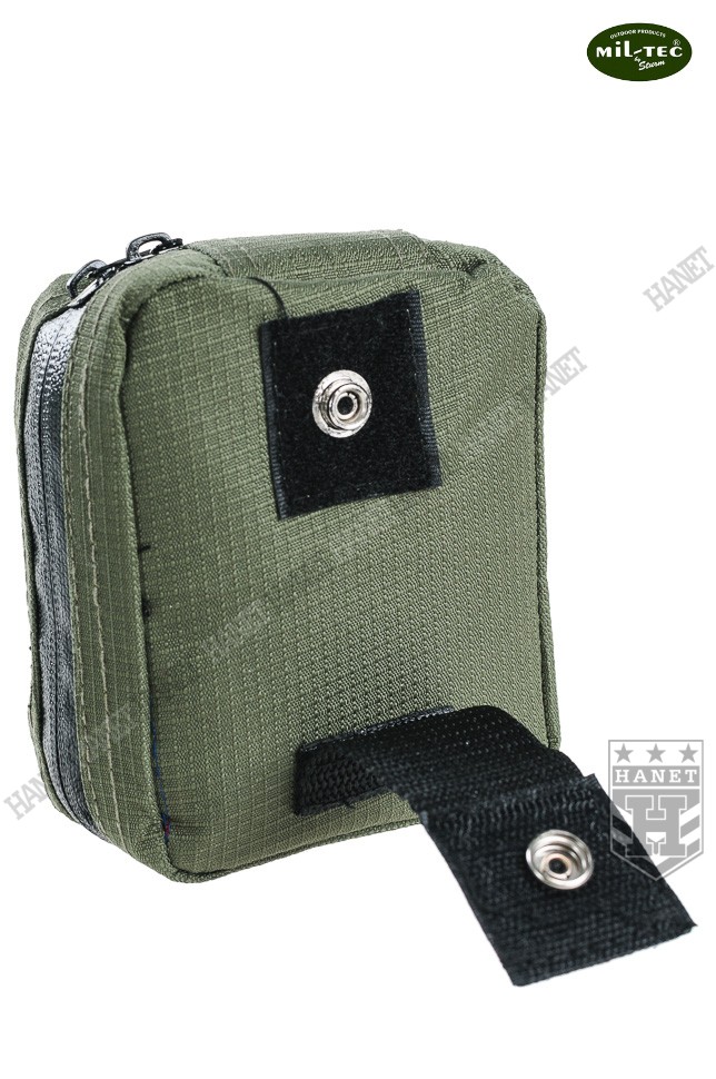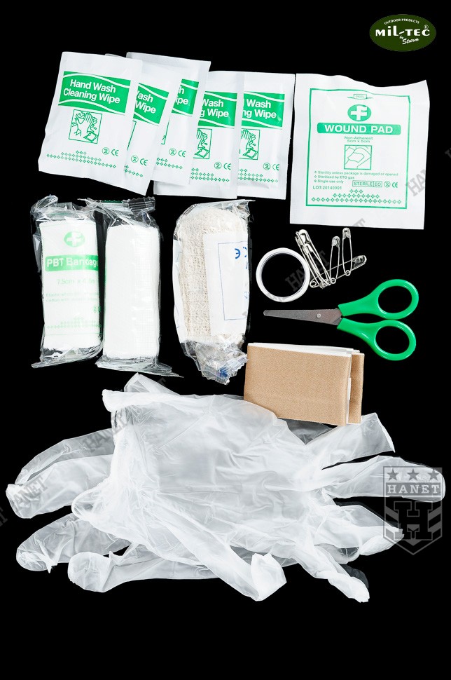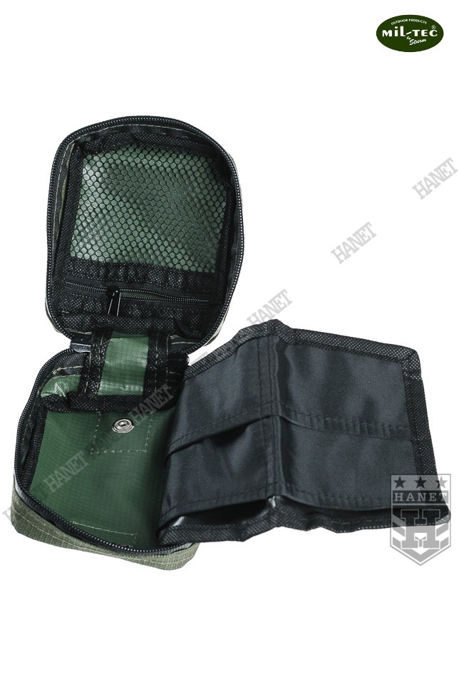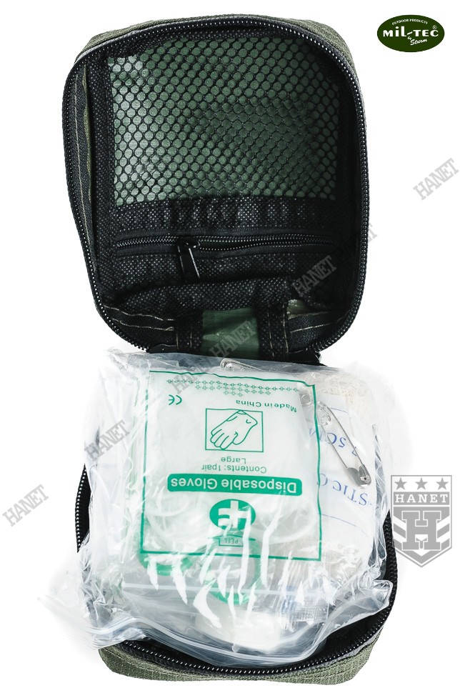 Nowoczesna apteczka indywidualna - zestaw pierwszej pomocy. Produkt niemieckiej marki Mil-Tec®. Przeznaczona dla ludzi aktywnie spędzających czas - sportowców, turystów i amatorów górskich wędrówek. Niewielkie gabaryty i masa pozwalają nosić ją nawet w damskiej torebce. Na wyposażeniu znajduję się niezbędny zestaw opatrunków i narzędzi do udzielania pierwszej pomocy. Wygodna kieszeń wykonana z grubego nylonu Rip-Stop z wodoodporną powłoką PU od wewnątrz. Pokrowiec posiada odpinaną szlufkę na pas, która umożliwia przytroczenie także do plecaka. Apteczka zapinana na wodoodporny zamek z dwoma suwakami. Szerokie otwarcie upraszcza dojście do potrzebnego przedmiotu, bez konieczności zdejmowania z pasa czy plecaka. System wewnętrznych kieszonek i przegród do organizacji umieszczonych w apteczce opatrunków. Kieszenie wszyte na rolowanym materiale, który po rozłożeniu gwarantuje łatwy dostęp do pełnej zawartości. Cztery duże przegrody, każdy element znajdzie swoje miejsce. Wnętrze apteczki uszyte ze skóry syntetycznej, odporne na krew i łatwe w myciu. Duża kieszeń na zamek, idealna na leki i materiały opatrunkowe. Ściana dużej kieszeni wykonana z siatki, która ułatwia szybkie odszukanie potrzebnej rzeczy. Apteczka oznakowana standardowym białym krzyżem. Możliwość założenia smyczy i zawieszenia na szyi.