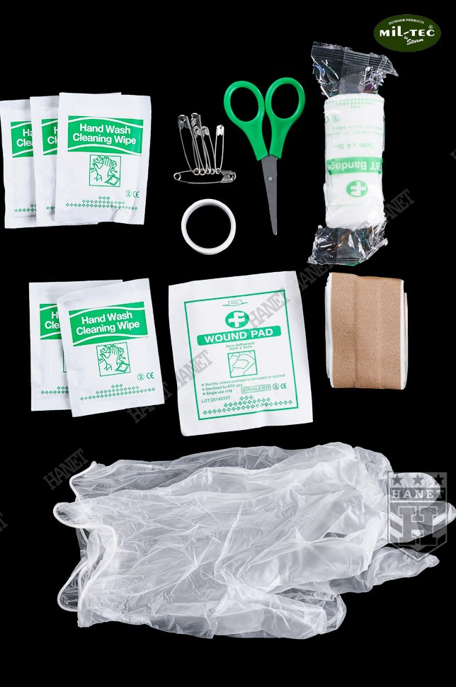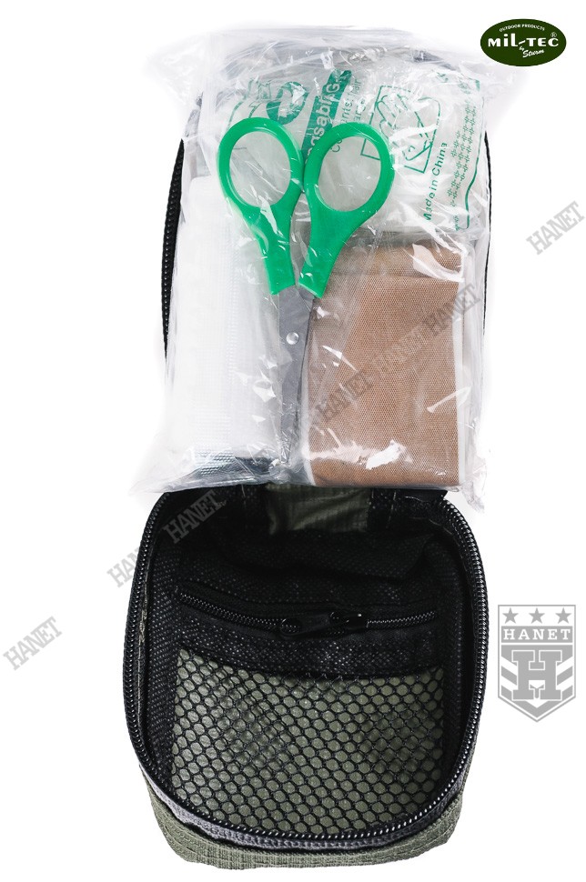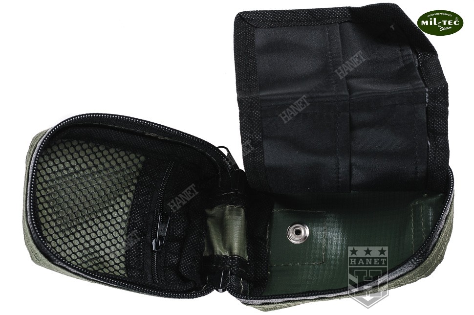 Nowoczesna apteczka indywidualna - zestaw pierwszej pomocy. Produkt niemieckiej marki Mil-Tec®. Przeznaczona dla ludzi aktywnie spędzających czas - sportowców, turystów i amatorów górskich wędrówek. Niewielkie gabaryty i masa pozwalają nosić ją nawet w kieszeni. Na wyposażeniu znajduję się niezbędny zestaw opatrunków i narzędzi do udzielania pierwszej pomocy. Wygodna kieszeń wykonana z grubego nylonu Rip-Stop z wodoodporną powłoką PU od wewnątrz. Pokrowiec posiada odpinaną szlufkę na pas, która umożliwia przytroczenie także do plecaka. Apteczka zapinana na wodoodporny zamek z dwoma suwakami. Szerokie otwarcie upraszcza dojście do potrzebnego przedmiotu, bez konieczności zdejmowania z pasa czy plecaka. System wewnętrznych kieszeni i przegród do organizacji umieszczonych w apteczce opatrunków. Kieszenie wszyte na rolowanym materiale, który po rozłożeniu gwarantuje łatwy dostęp do pełnej zawartości. Cztery duże przegrody, każdy element znajdzie swoje miejsce. Wnętrze apteczki uszyte ze skóry syntetycznej, odporne na krew i łatwe w myciu. Duża kieszeń na zamek, idealna na leki i materiały opatrunkowe. Jej ściana wykonana jest z siatki, która ułatwia szybkie odszukanie potrzebnej rzeczy. Apteczka oznakowana standardowym białym krzyżem. Możliwość założenia smyczy i zawieszenia apteczki na szyi.