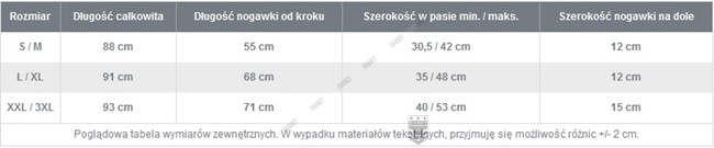 | Rozmiar | Długość całkowita | Długość nogawki od kroku | Szerokość w pasie min. / maks. | Szerokość nogawki na dole |