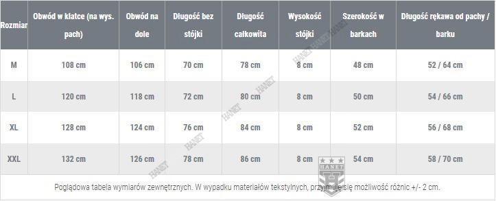 | Rozmiar | Obwód w klatce [cm] | Długość [cm] | Obwód kołnierza [cm] | Długość rękawa od barku [cm] |