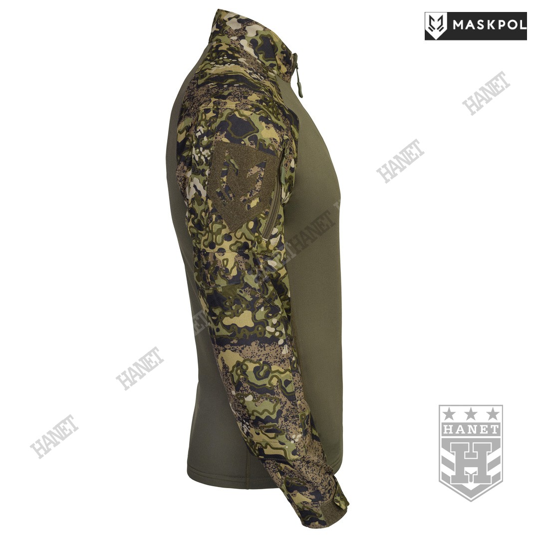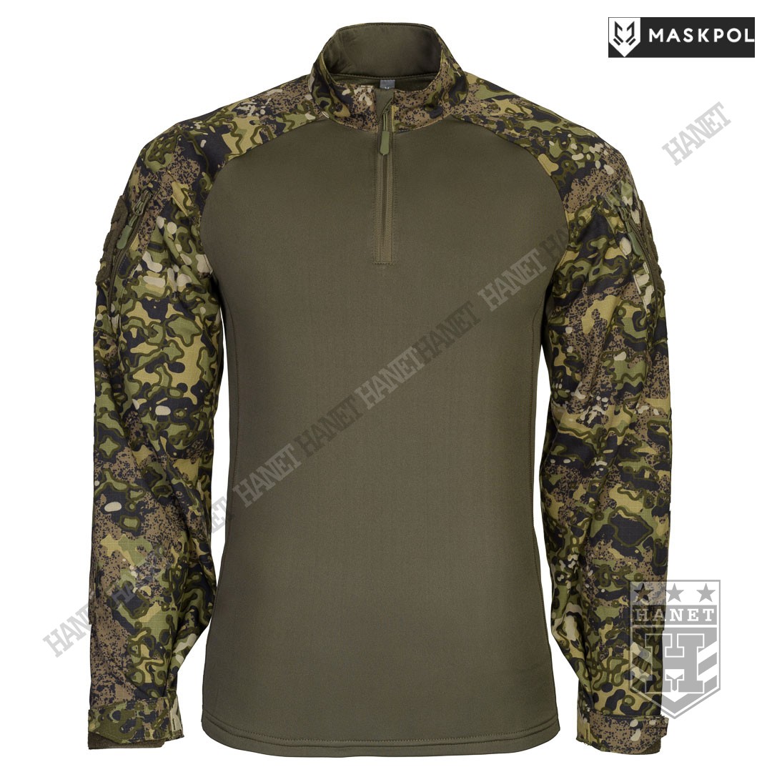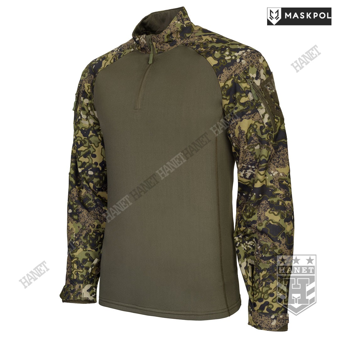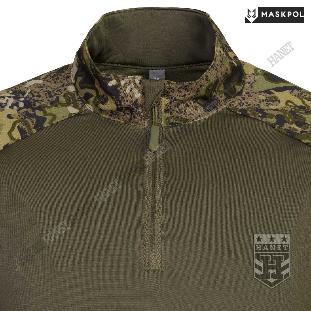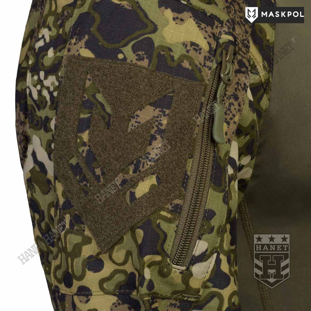 Praktyczny Combat Shirt przeznaczony do noszenia pod kamizelkami taktycznymi, do treningów fizycznych oraz na lato zamiast bluzy. Hybrydowy krój z tkaniną termoaktywną na korpusie zapewnia maksymalny komfort i lepszą wymianę ciepła. Rękawy wyposażone we wzmocnienia (podwójny materiał) na łokciach. Łaty wzmacniające na łokciach pełną rolę kieszeni na miękkie ochraniacze. Kieszonki na wkłady zamykane na rzepy. Mankiety z regulacją na rzepy umożliwiają założenie rękawic pod rękaw. Zamek pod szyją dla wygodnego zakładania bluzy. Do rozpinania bluzy użyto solidnego zamka elementem ułatwiającym obsługę przy suwaku. Zamek od strony ciała i brody chroniony patką z podwójnego materiału. Wysoka stójka obszyta od wewnątrz tkaniną, która chroni szyję przed obtarciami od zawieszenia broni. Dolna krawędź bluzy wzmacniania. Kilkukrotne szwy i dodatkowe przeszycia w newralgicznych miejscach.