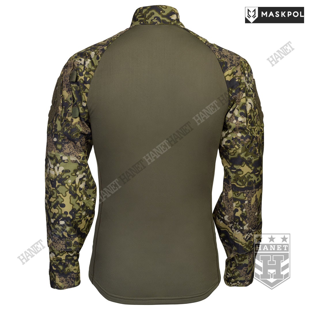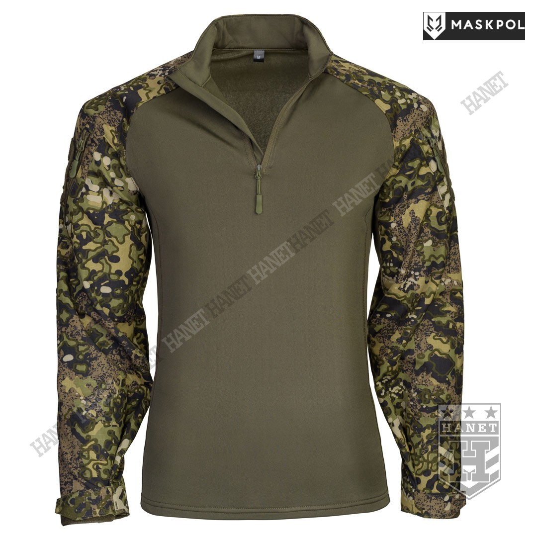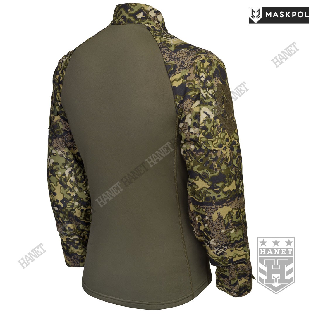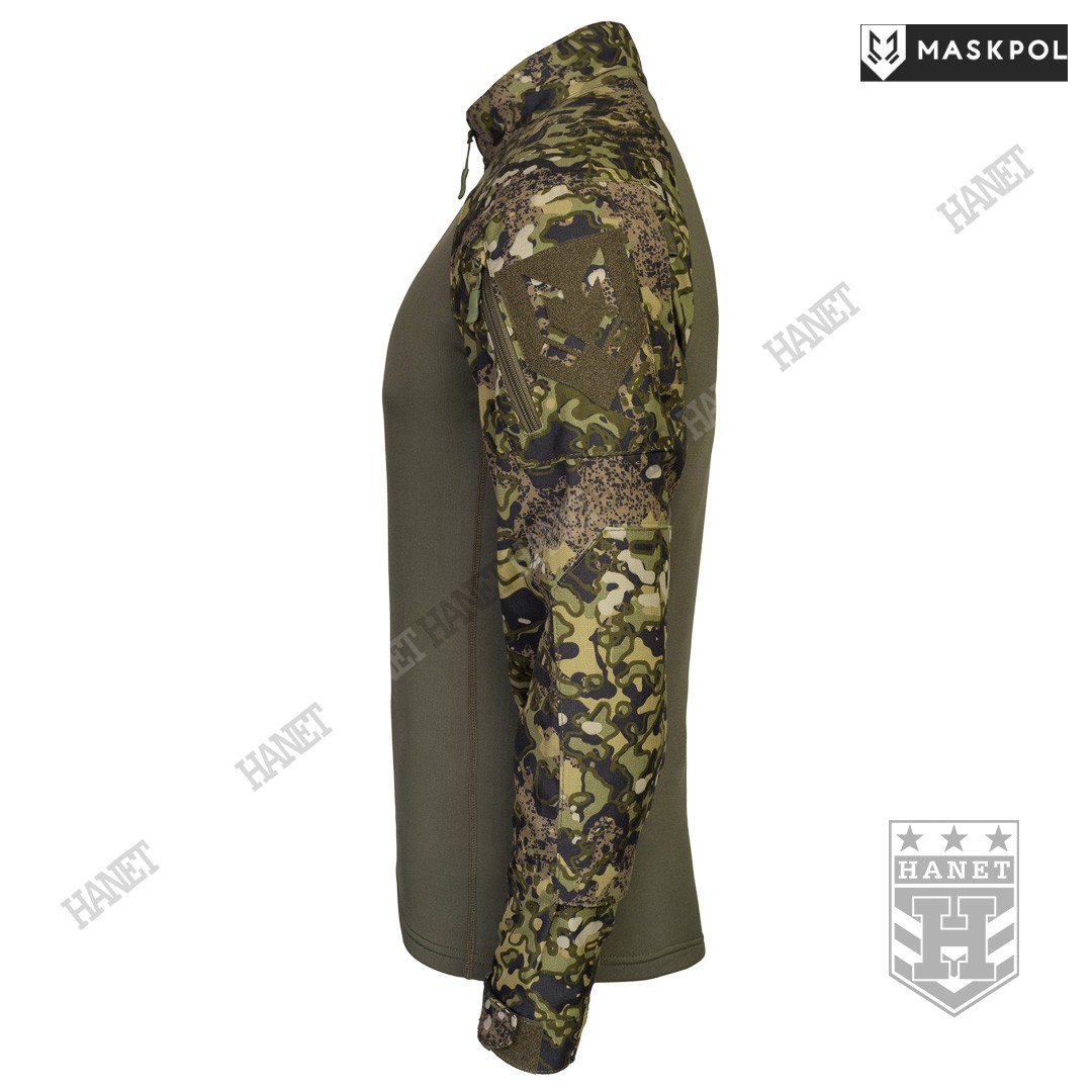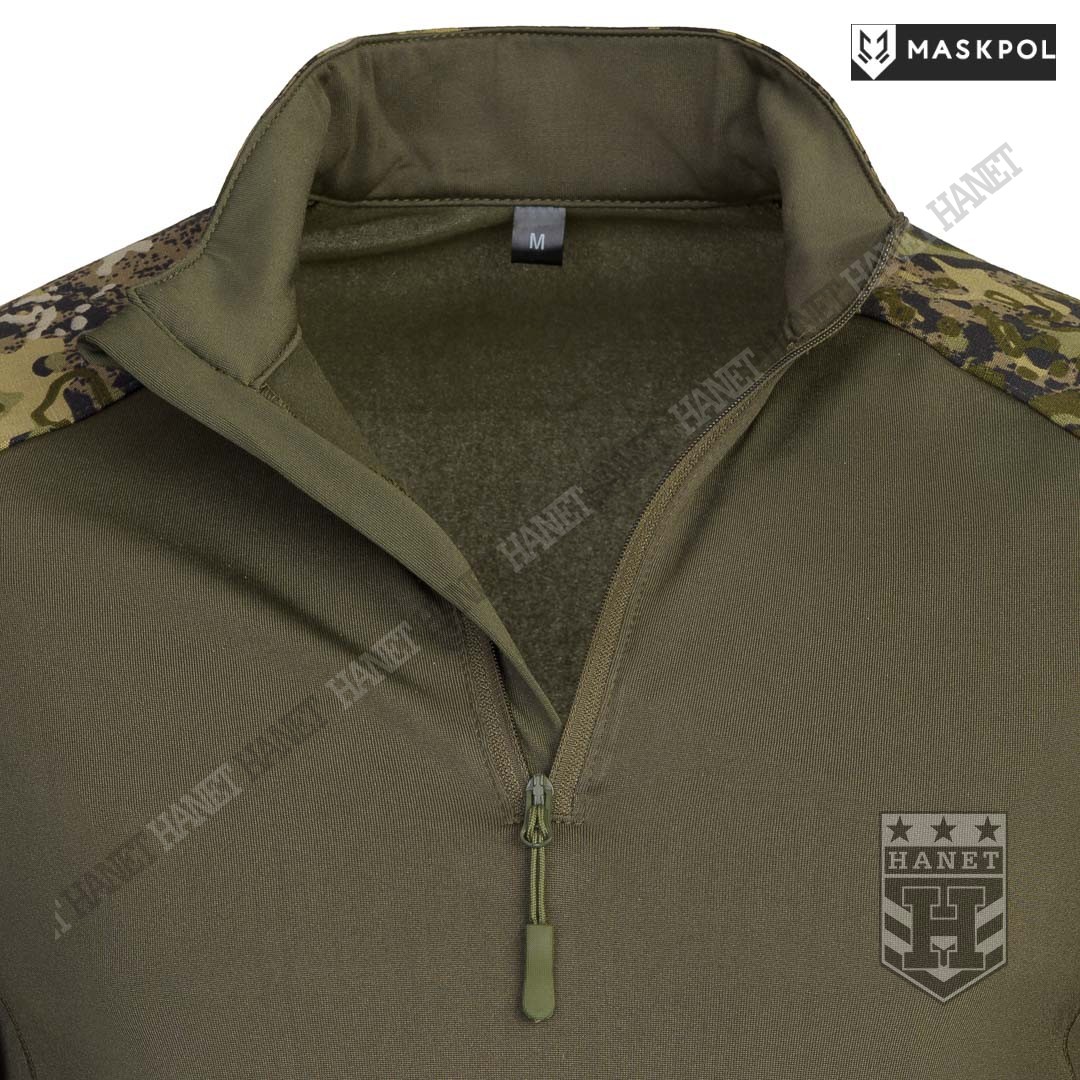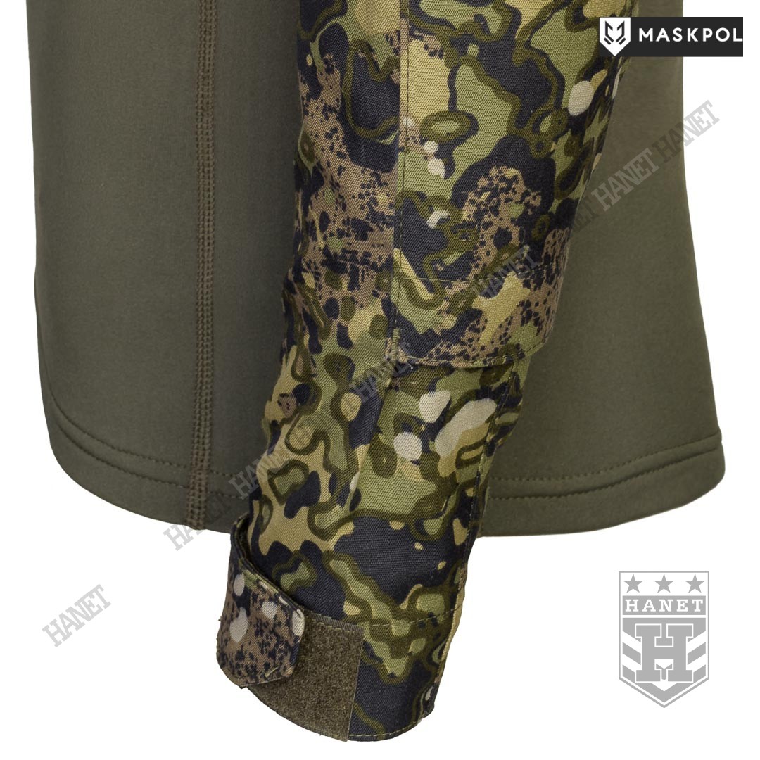 Praktyczny Combat Shirt przeznaczony do noszenia pod kamizelkami taktycznymi, do treningów fizycznych oraz na lato zamiast bluzy. Hybrydowy krój z tkaniną termoaktywną na korpusie zapewnia maksymalny komfort i lepszą wymianę ciepła. Rękawy wyposażone we wzmocnienia (podwójny materiał) na łokciach. Łaty wzmacniające na łokciach pełną rolę kieszeni na miękkie ochraniacze. Kieszonki na wkłady zamykane na rzepy. Mankiety z regulacją na rzepy umożliwiają założenie rękawic pod rękaw. Zamek pod szyją dla wygodnego zakładania bluzy. Do rozpinania bluzy użyto solidnego zamka elementem ułatwiającym obsługę przy suwaku. Zamek od strony ciała i brody chroniony patką z podwójnego materiału. Wysoka stójka obszyta od wewnątrz tkaniną, która chroni szyję przed obtarciami od zawieszenia broni. Dolna krawędź bluzy wzmacniania. Kilkukrotne szwy i dodatkowe przeszycia w newralgicznych miejscach.