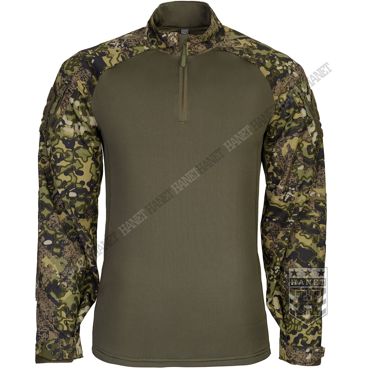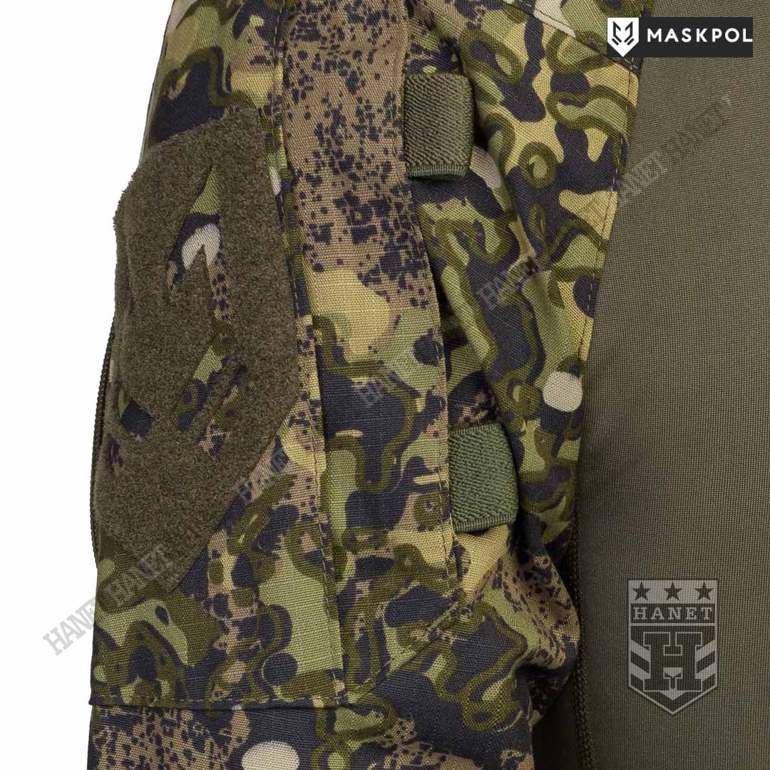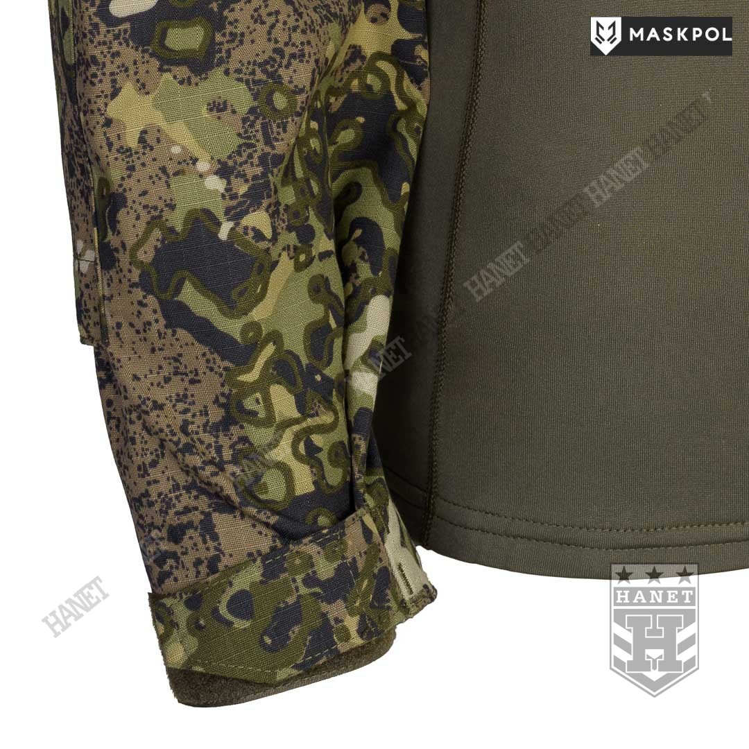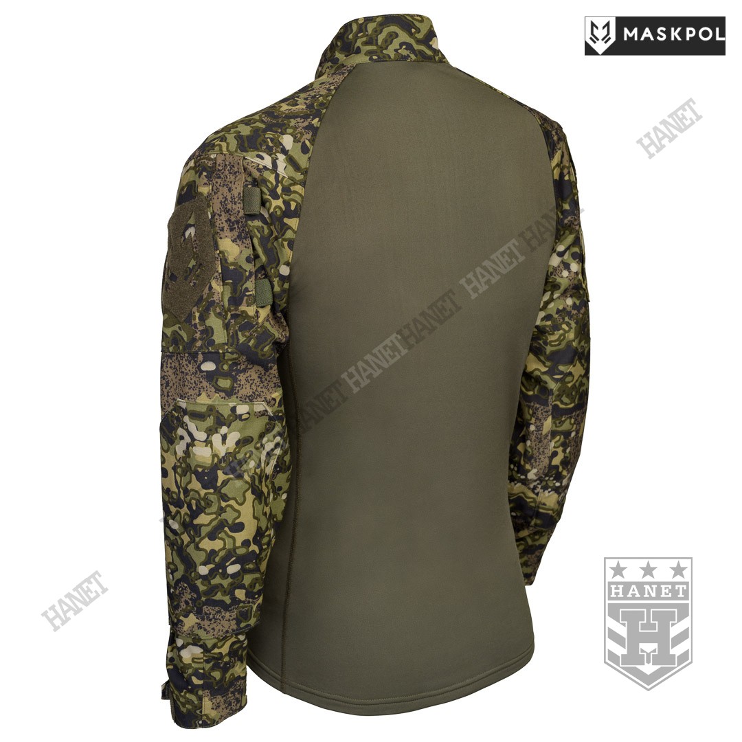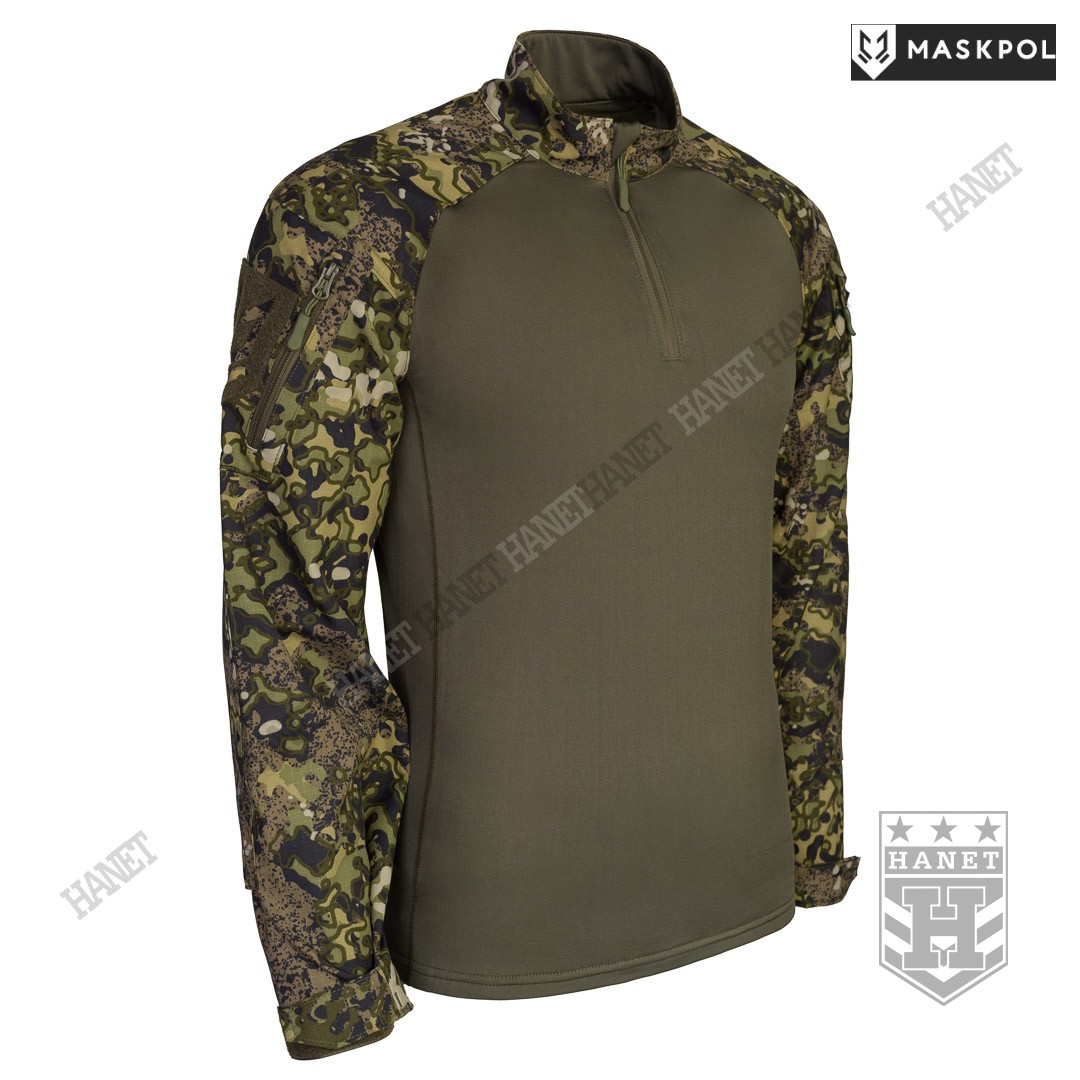 Praktyczny Combat Shirt przeznaczony do noszenia pod kamizelkami taktycznymi, do treningów fizycznych oraz na lato zamiast bluzy. Hybrydowy krój z tkaniną termoaktywną na korpusie zapewnia maksymalny komfort i lepszą wymianę ciepła. Rękawy wyposażone we wzmocnienia (podwójny materiał) na łokciach. Łaty wzmacniające na łokciach pełną rolę kieszeni na miękkie ochraniacze. Kieszonki na wkłady zamykane na rzepy. Mankiety z regulacją na rzepy umożliwiają założenie rękawic pod rękaw. Zamek pod szyją dla wygodnego zakładania bluzy. Do rozpinania bluzy użyto solidnego zamka elementem ułatwiającym obsługę przy suwaku. Zamek od strony ciała i brody chroniony patką z podwójnego materiału. Wysoka stójka obszyta od wewnątrz tkaniną, która chroni szyję przed obtarciami od zawieszenia broni. Dolna krawędź bluzy wzmacniania. Kilkukrotne szwy i dodatkowe przeszycia w newralgicznych miejscach.