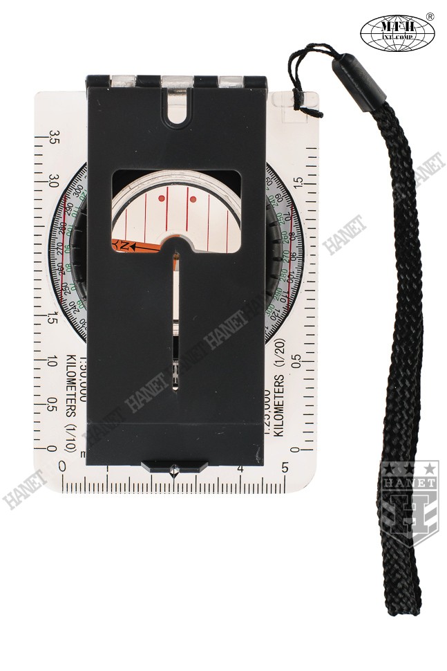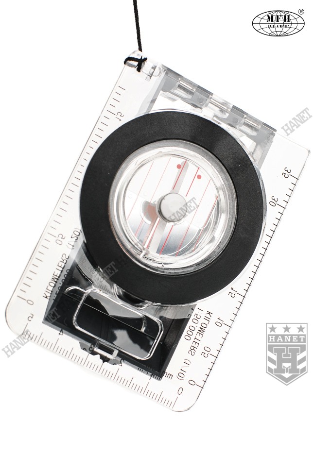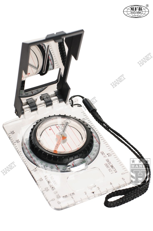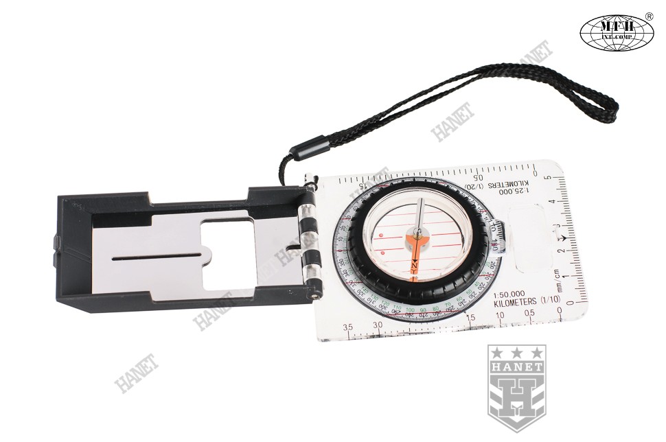 Zaawansowana busola płytkowa. Produkt niemieckiej firmy MFH Int. Comp. Doskonała dla amatorów pieszych wędrówek, traperów, trekkingowców i żeglarzy. Busola umożliwia wyznaczenie kierunku magnetycznego oraz kierunków pośrednich. Solidny korpus wykonany z lekkiego i wytrzymałego tworzywa - odporny na wilgoć i uszkodzenia mechaniczne. System składanych przyrządów celowniczych do wyznaczania azymutu w terenie. Duże lusterko umożliwia odczyt i jednoczesne celowanie. Lusterko spełnia też rolę heliografu (lusterko sygnalizacyjne). Ruchoma tarcza z precyzyjnymi podziałkami 360° i rewersem skali. Szkło powiększające ułatwia odczyt podziałki. Igła magnetyczna zawieszona swobodnie w środowisku cieczy - bardzo dokładna. Przeźroczysta płytka z poliwęglanu umożliwia korzystanie z mapą i kreślenie. Płytka z dwiema skalami 1:50000 i 1:25000 ułatwiającymi szybką ocenę odległości rzeczywistej na mapie. Dodatkowa podziałka centymetrowa. Duża lupa do odczytu znaków topograficznych. W komplecie smycz nadgarstkowa. Busola zapakowana w schludny blister.