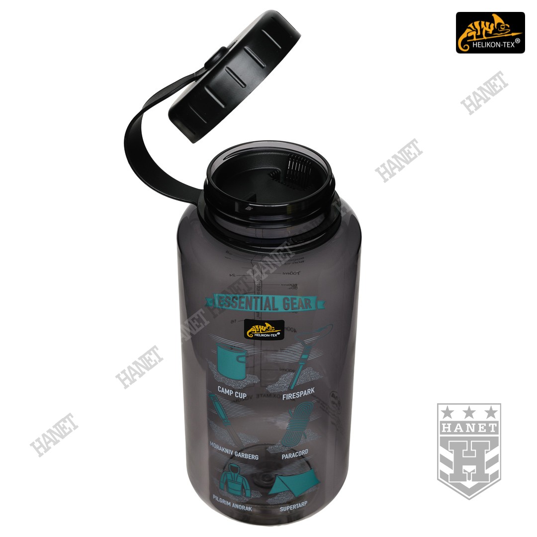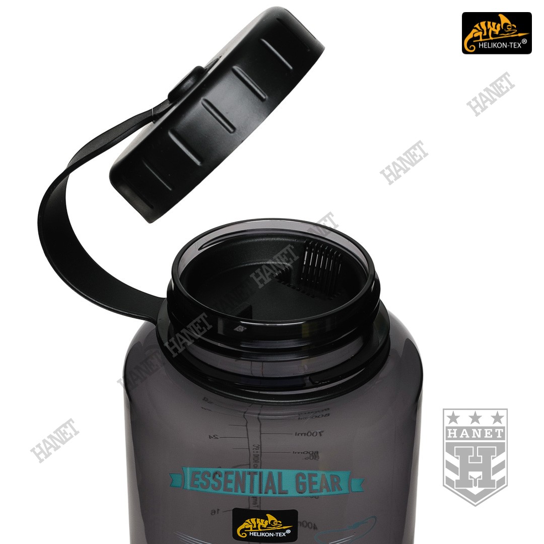 Duża butelka na wodę o pojemności 1l. Lekka i wytrzymała, jest idealna na wyprawy bushcraftowe, do outdooru oraz do uprawiania sportu - znacznie wygodniejsza niż standardowy bidon lub manierka. Butelka posiada szeroką szyjkę, wlew o średnicy aż 54mm ułatwia szybkie napełnianie oraz wygodne mycie wnętrza. Duża średnica wlewu pozwala na przygotowanie w butelce i spożycie z niej gorącego posiłku (np. zupa instant). Tworzywo TRITAN™ jest przeznaczone dla płynów o temperaturze nieco niższej niż wrzątek, tj. <90°C. Zakrętka wykonana z solidnego tworzywa, konstrukcja bezuszczelkowa wykorzystująca kołnierz uszczelniający (jak w butelce PET) gwarantuje długowieczność użytkowania. Zakrętka posiada element zabezpieczający przed zgubieniem. Zabezpieczenie zakrętki przydaje się jako uchwyt napełnienia wody np. ze strumienia - pomaga zachować suche rękawice. Szeroki gwint zapobiega zacięciom podczas zakręcania i daje odporność na zalodzenie. Wyciągany dławik / sitko pozwala ograniczyć ilość wypływającej wody, umożliwia na wygodne picie w ruchu. Dławik posiada odpowietrznik dla niezakłóconego przepływu płynów. Sitko dodatkowo filtruje większe zanieczyszczenia stałe podczas napełniania butelki.