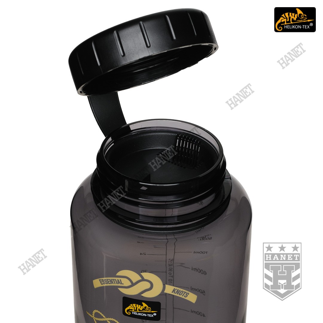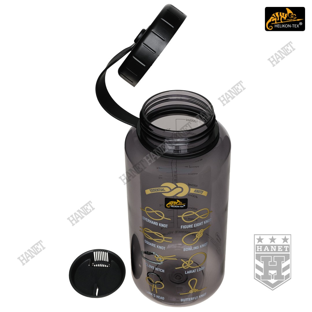 Duża butelka na wodę o pojemności 1l. Lekka i wytrzymała, jest idealna na wyprawy bushcraftowe, do outdooru oraz do uprawiania sportu - znacznie wygodniejsza niż standardowy bidon lub manierka. Butelka posiada szeroką szyjkę, wlew o średnicy aż 54mm ułatwia szybkie napełnianie oraz wygodne mycie wnętrza. Duża średnica wlewu pozwala na przygotowanie w butelce i spożycie z niej gorącego posiłku (np. zupa instant). Tworzywo TRITAN™ jest przeznaczone dla płynów o temperaturze nieco niższej niż wrzątek, tj. <90°C. Zakrętka wykonana z solidnego tworzywa, konstrukcja bezuszczelkowa wykorzystująca kołnierz uszczelniający (jak w butelce PET) gwarantuje długowieczność użytkowania. Zakrętka posiada element zabezpieczający przed zgubieniem. Zabezpieczenie zakrętki przydaje się jako uchwyt napełnienia wody np. ze strumienia - pomaga zachować suche rękawice. Szeroki gwint zapobiega zacięciom podczas zakręcania i daje odporność na zalodzenie. Wyciągany dławik / sitko pozwala ograniczyć ilość wypływającej wody, umożliwia na wygodne picie w ruchu. Dławik posiada odpowietrznik dla niezakłóconego przepływu płynów. Sitko dodatkowo filtruje większe zanieczyszczenia stałe podczas napełniania butelki.
