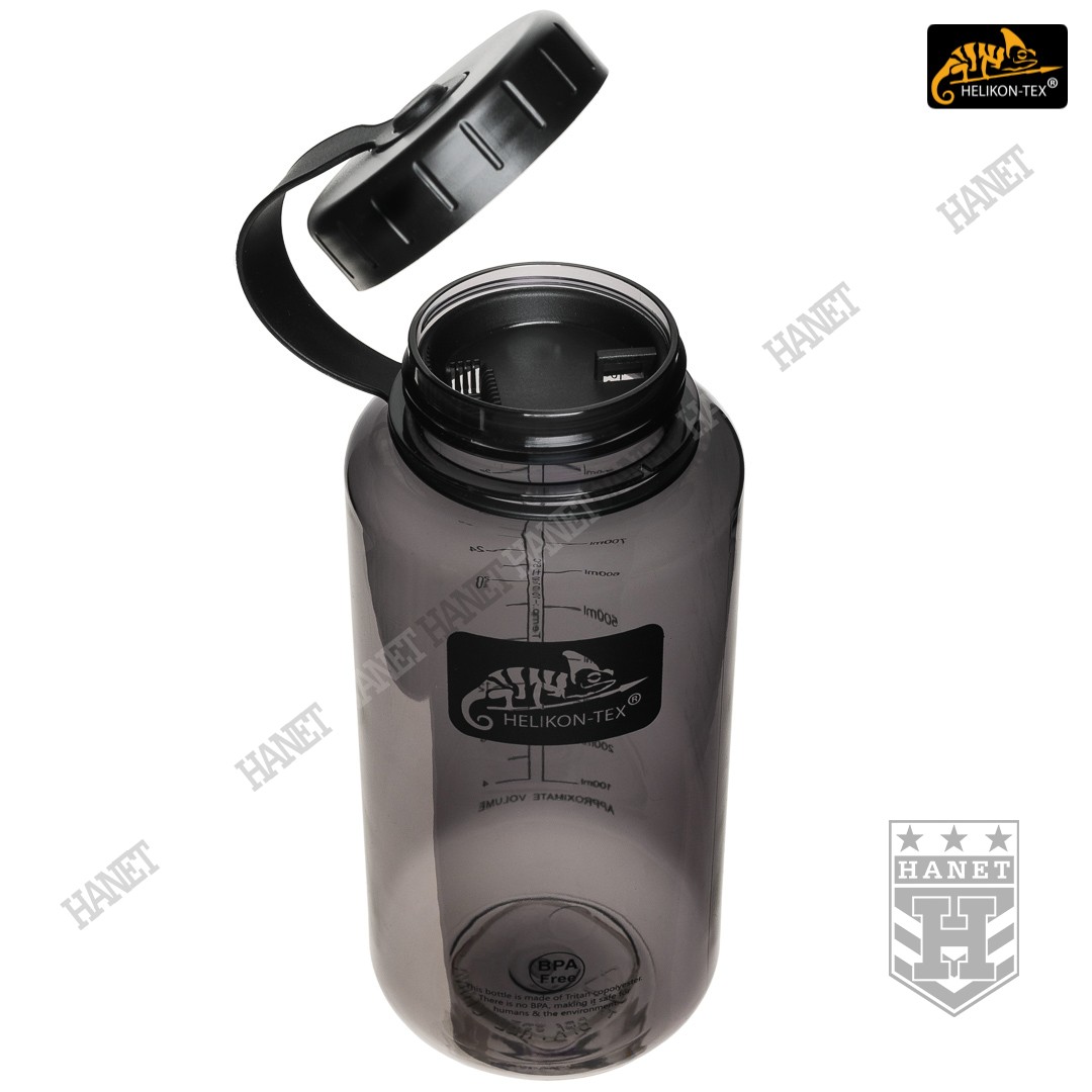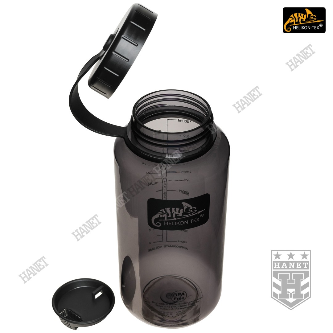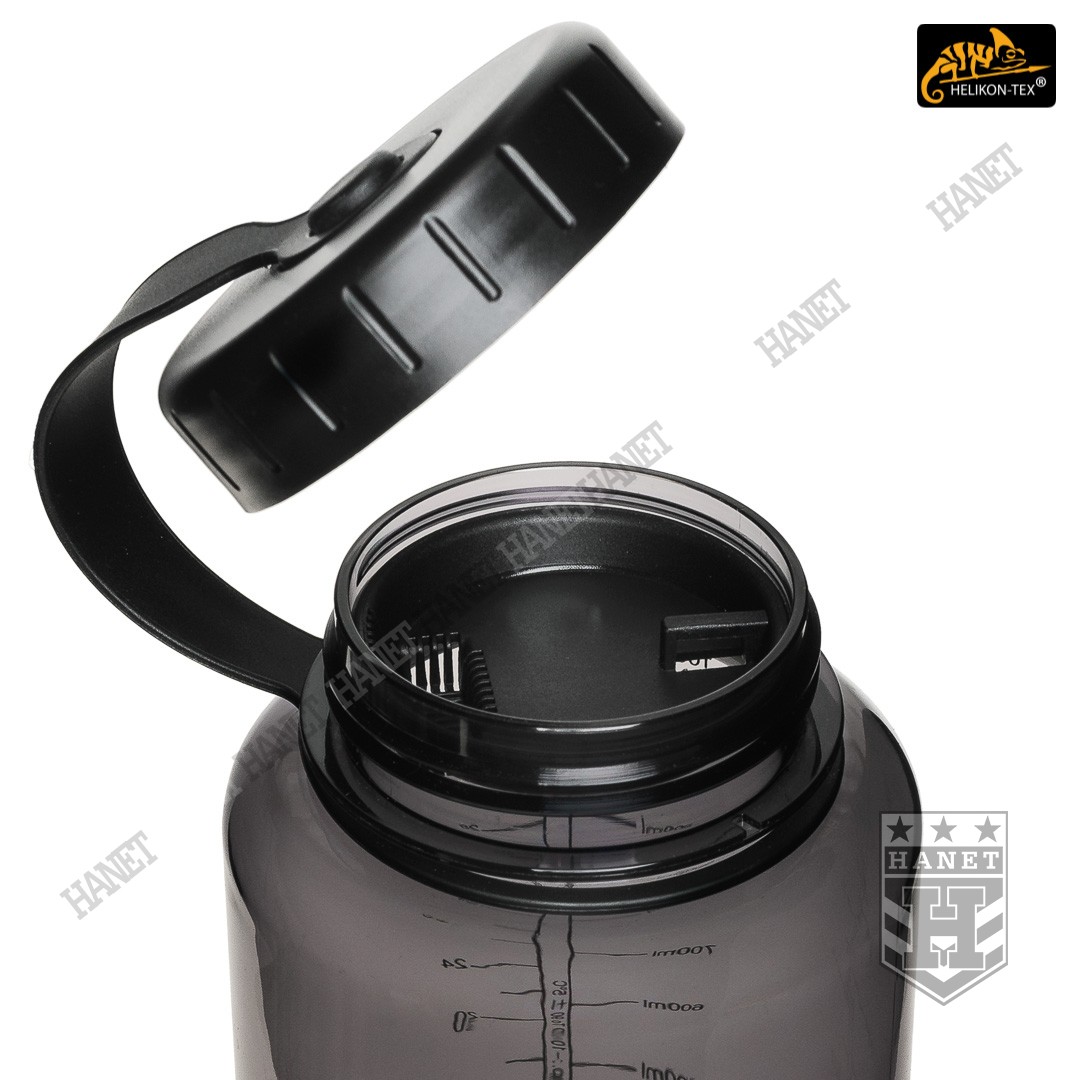 Duża butelka na wodę o pojemności 1l. Lekka i wytrzymała, jest idealna na wyprawy bushcraftowe, do outdooru oraz do uprawiania sportu - znacznie wygodniejsza niż standardowy bidon lub manierka. Butelka posiada szeroką szyjkę, wlew o średnicy aż 54mm ułatwia szybkie napełnianie oraz wygodne mycie wnętrza. Duża średnica wlewu pozwala na przygotowanie w butelce i spożycie z niej gorącego posiłku (np. zupa instant) - tworzywo TRITAN™ jest przeznaczone dla płynów o temperaturze nieco niższej niż wrzątek, tj. <90°C. Zakrętka wykonana z solidnego tworzywa, konstrukcja bezuszczelkowa wykorzystująca kołnierz uszczelniający (jak w butelce PET) gwarantuje długowieczność użytkowania. Zakrętka posiada element zabezpieczający przed zgubieniem. Zabezpieczenie zakrętki przydaje się jako uchwyt napełnienia wody np. ze strumienia - pomaga zachować suche rękawice. Szeroki gwint zapobiega zacięciom podczas zakręcania i daje odporność na zalodzenie. Wyciągany dławik / sitko pozwala ograniczyć ilość wypływającej wody, umożliwia na wygodne picie w ruchu. Dławik posiada odpowietrznik dla niezakłóconego przepływu płynów. Sitko dodatkowo filtruje większe zanieczyszczenia stałe podczas napełniania butelki.