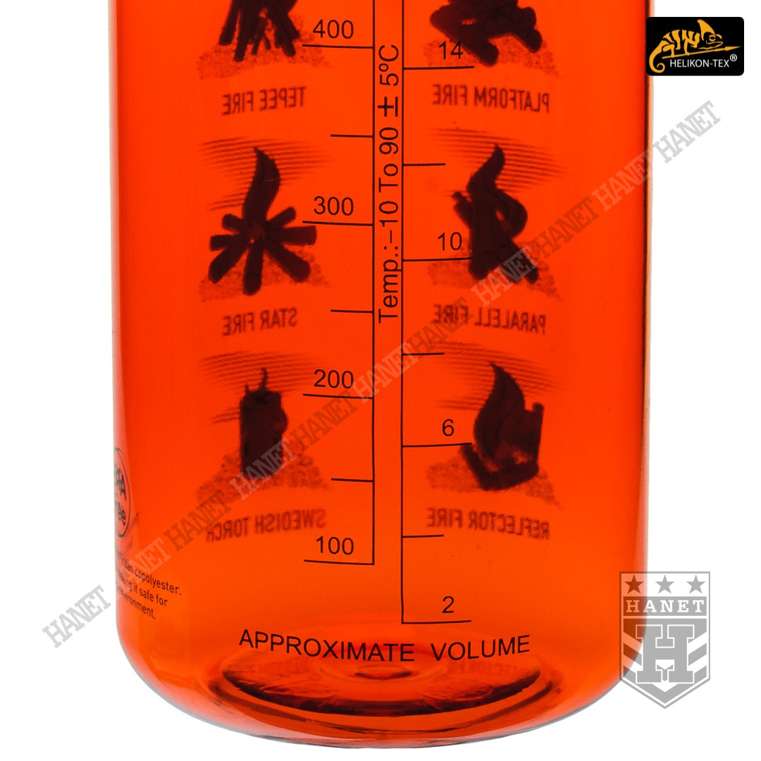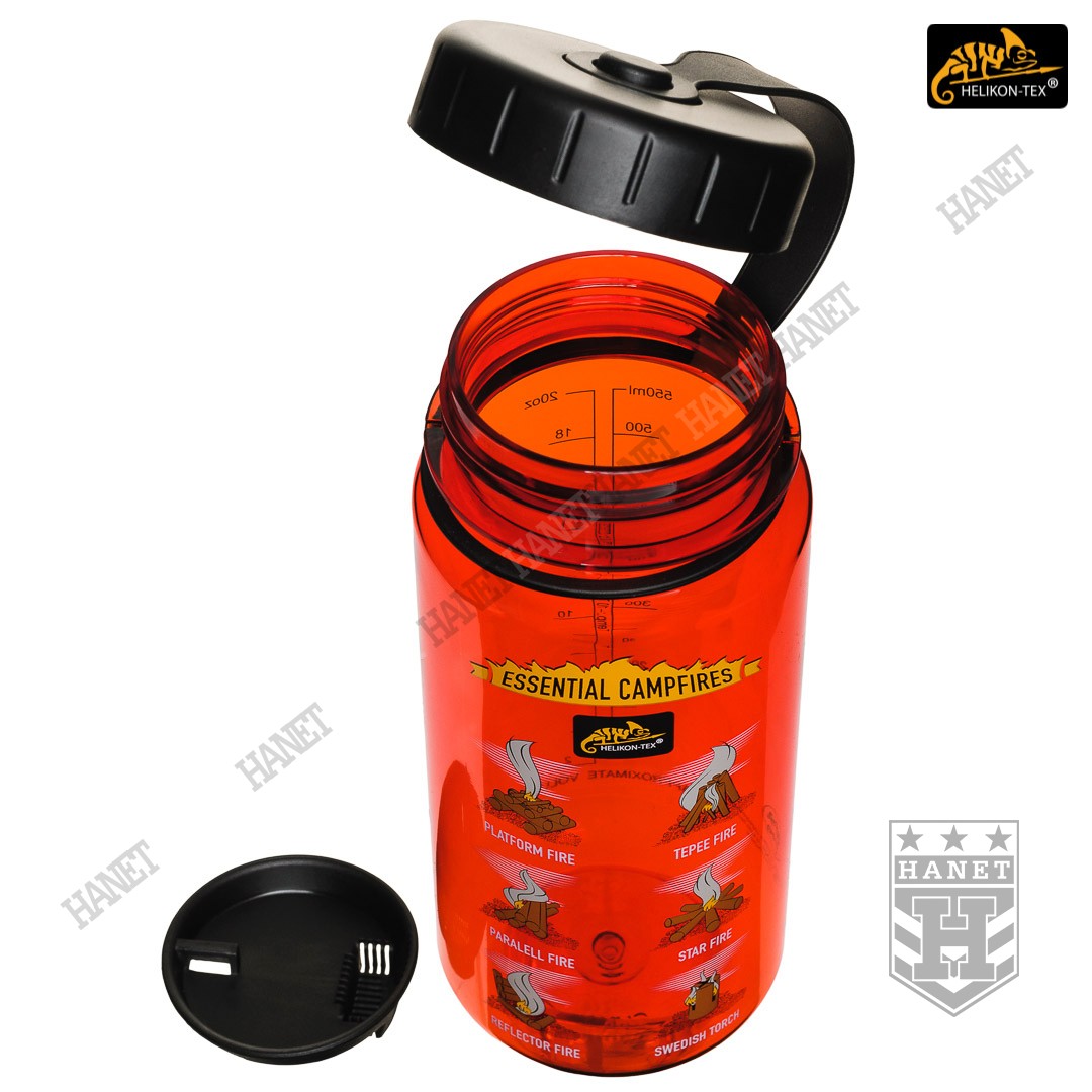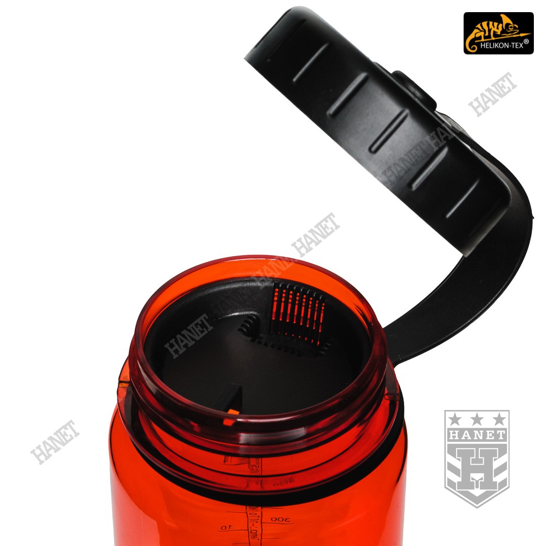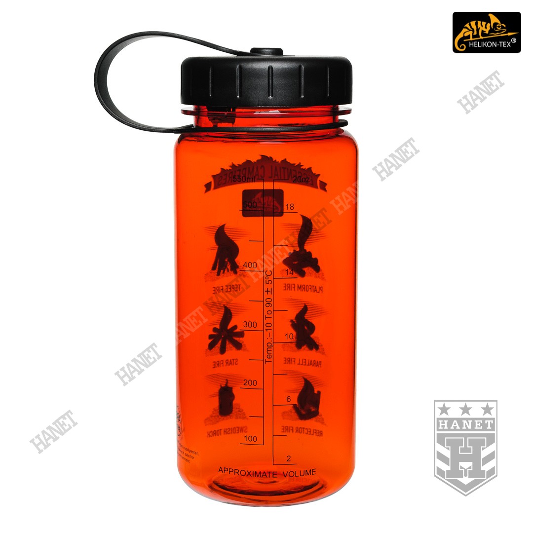 Butelka na wodę o pojemności 550ml. Lekka i wytrzymała, jest idealna na wyprawy bushcraftowe, do outdooru oraz do uprawiania sportu - znacznie wygodniejsza niż standardowy bidon lub manierka. Butelka posiada szeroką szyjkę, wlew o średnicy aż 55 mm ułatwia szybkie napełnianie oraz wygodne mycie wnętrza. Duża średnica wlewu pozwala na przygotowanie w butelce i spożycie z niej gorącego posiłku (np. zupa instant) - tworzywo TRITAN™ jest przeznaczone dla płynów o temperaturze nieco niższej niż wrzątek, tj. <90°C. Zakrętka wykonana z solidnego tworzywa, konstrukcja bezuszczelkowa wykorzystująca kołnierz uszczelniający (jak w butelce PET) gwarantuje długowieczność użytkowania. Zakrętka posiada element zabezpieczający przed zgubieniem. Zabezpieczenie zakrętki przydaje się jako uchwyt napełnienia wody np. ze strumienia - pomaga zachować suche rękawice. Szeroki gwint zapobiega zacięciom podczas zakręcania i daje odporność na zalodzenie. Wyciągany dławik / sitko pozwala ograniczyć ilość wypływającej wody, umożliwia na wygodne picie w ruchu. Dławik posiada odpowietrznik dla niezakłóconego przepływu płynów. Sitko dodatkowo filtruje większe zanieczyszczenia stałe podczas napełniania butelki.