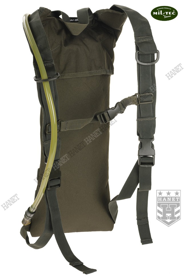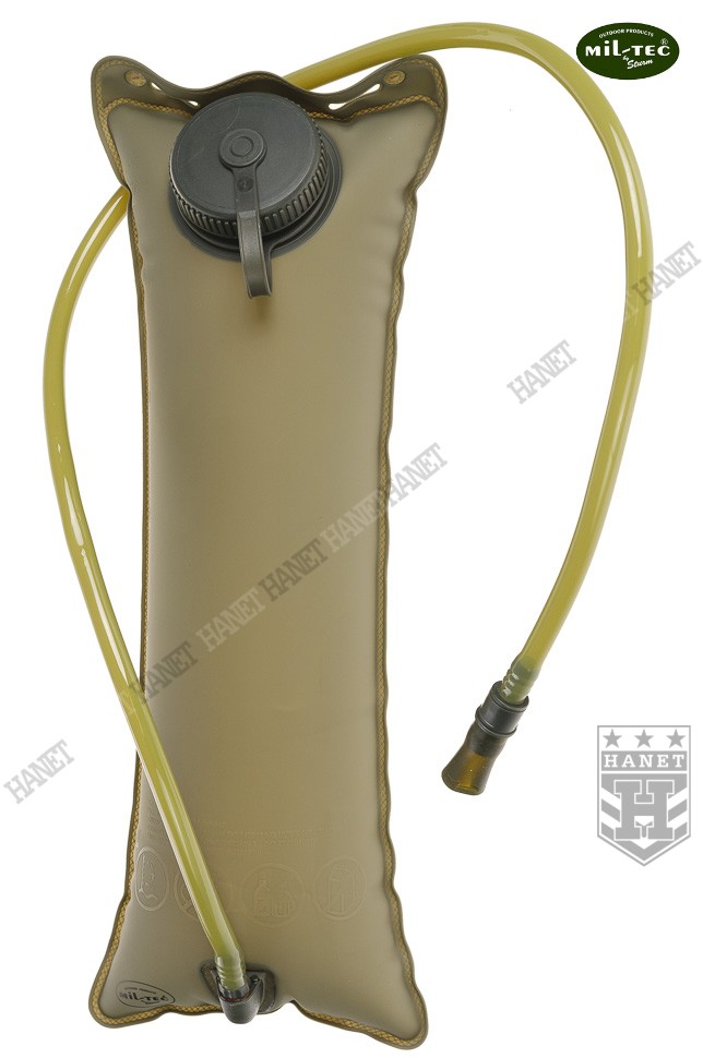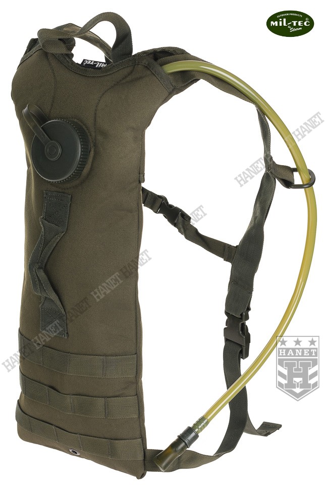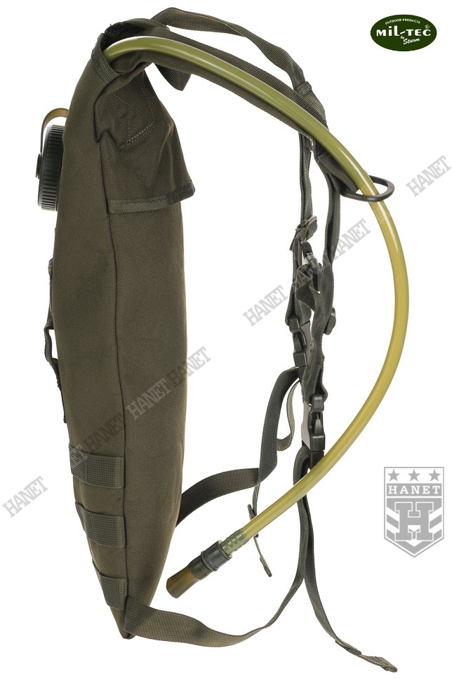 System hydracyjny w plecaku / pokrowcu modularnym. Produkt niemieckiej firmy Mil-Tec. Specyfikacja militarna gwarantuje solidność i niezawodność. Camelbak zapewnia stały i łatwy dostęp do wody podczas marszu, patroli, taktyki, jazdy na rowerze lub podczas innych absorbujących i męczących zajęć gdy trzeba często uzupełniać płyny. Polecany miłośnikom sportów ekstremalnych i każdemu kto aktywnie spędza czas. Nowoczesna konstrukcja, szczelna i wytrzymała. Bukłak na wodę o pojemności 3,0 L - posiadający 12 patentów w 4 krajach. Wkład WATER BLADER wykonany z mocnego i elastycznego tworzywa - antybakteryjnego i nie pozostawiającego obcych smaków. Półprzeźroczysty, z podziałką dzięki której można kontrolować dokładną ilość pozostałej cieczy. Duży wlew zapewnia łatwe napełnienie wodą i możliwość mycia. Możliwość noszenia kostek lodu. Rurka o długości 115 cm z nowatorskim zaworkiem (kranikiem) i dodatkowym ustnikiem gumowym. Kranik łatwy i szybki w obsłudze, wystarczy go wysunąć (jak w bidonie). Duża średnica rurki zapewnia dobry przepływ wody a grube ścianki zapobiegają jej ściskaniu. Pokrowiec wykonany z prasowanego NEOPRENU pokrytego warstwą mocnego nylonu. Neopren daje izolację termiczną, zabezpiecza płyn przed nagrzaniem lub zamarzaniem. Panel montażowy w systemie MOLLE 25 mm do mocowania dodatkowych kieszeni. Niezwykle wygodny system nośny: regulowane, oddychające szelki wzmocnione taśmą. Taśma piersiowa daje stabilności podczas biegu, wyposażona w regulację wysokości i długości. System szybkiego zrzutu plecaka QR - klamry w szelkach. Uchwyty do rurki - D-ring mocowane na obu szelkach. Dla lewo i prawo ręcznych. Wygodny uchwyt transportowy od frontu oraz ucho do zawieszenia. Specjalna kieszeń przeznaczona na wkład hydracyjny, wyposażona w wewnętrzne sznurki do montażu. U dołu nabity nit - otwór do odprowadzania wody z wnętrza camelbaka przydatny w wypadku zalania, możliwość mycia pokrowca. Dla lewo i prawo ręcznych.