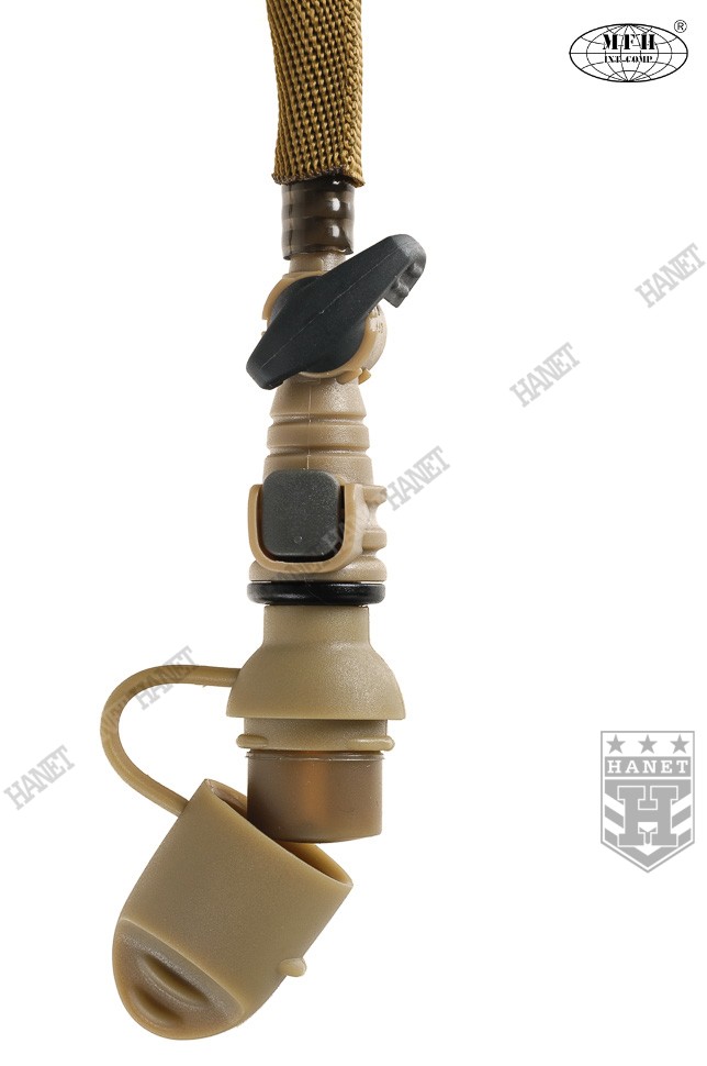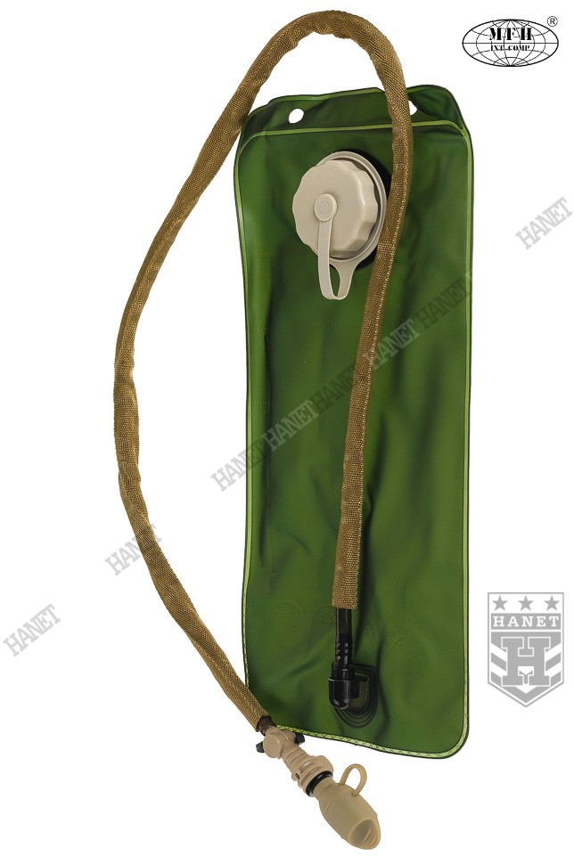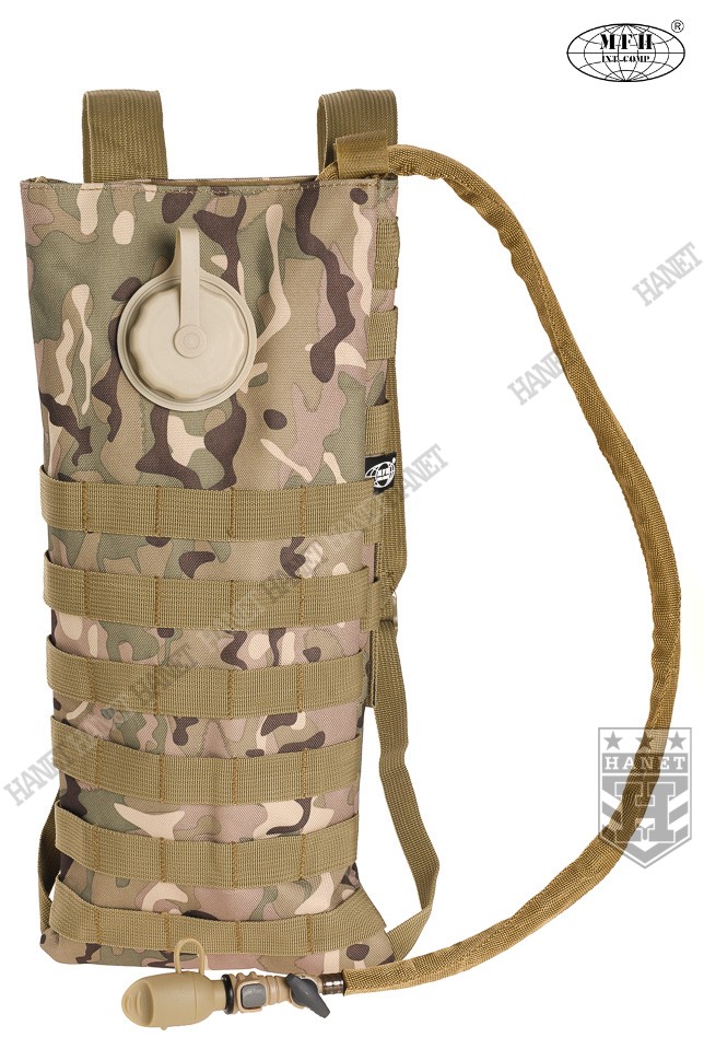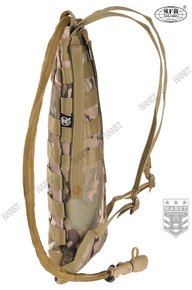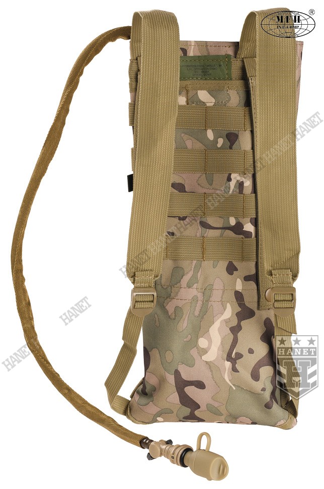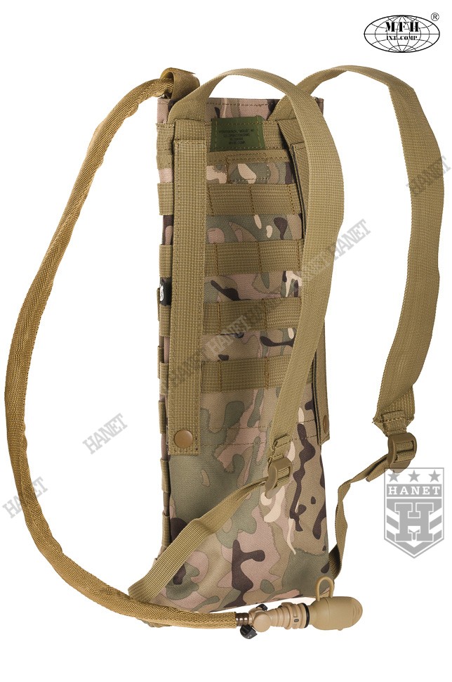 Profesjonalny system hydracyjny w plecaku / pokrowcu modularny wzór US ARMY. Produkt niemieckiej firmy MFH Int. Comp. Sprawdzony na misjach pokojowych w Iraku i Afganistanie, zyskał uznanie kontyngentu międzynarodowego. Camelbak zapewnia stały i łatwy dostęp do wody podczas marszu, patroli, taktyki, jazdy na rowerze lub podczas innych absorbujących i męczących zajęć gdy trzeba często uzupełniać płyny. Wyposażony w system montażowy MOLLE 25 mm który jest integralną częścią modularnego oporządzenia taktycznego (kamizelki, panele, plecaki itp.). Nowoczesna konstrukcja, szczelna i wytrzymała. Wygodny plecak/pokrowiec transportowy o niewielkich gabarytach. Całość wykonana z mocnego i wodoodopornego nylonu 600D. Regulowane szelki umożliwiają noszenie bez nośnika montażowego. Plecak/pokrowiec wyposażony w dodatkową kieszeń doskonałą na. Taśmy sytemu MOLLE 25mm usztywniane co znacznie poprawiają stabilność pokrowca. Uniwersalny wkład - pasuje do plecaków i kamizelek taktycznych. Bukłak na wodę o pojemności 2,5l wykonany z mocnego i elastycznego tworzywa. Półprzeźroczysty, podziałka dzięki której można kontrolować dokładną ilość pozostałej cieczy. Duży wlew zapewnia łatwe napełnienie wodą i możliwość mycia. Rurka o długości 105 cm z nowatorskim systemem zamknięcia wygodnym zaworkiem (kranikiem). Dodatkowy ustnik gumowy (smoczek) z nakładką antybakteryjną. Szybkowymienny ustnik, za naciśnięciem blokady można wyjąć cały ustnik - możliwość użytkowania camelbaka przez kilka osób oraz dokładnego mycia ustnika. Rurka została osłonięta rękawem nylonowym dla wzmocnienia i lepszej osłony termicznej. Duża średnica rurki zapewnia dobry przepływ wody a grube ścianki zapobiegają jej ściskaniu. Dla lewo i prawo ręcznych.