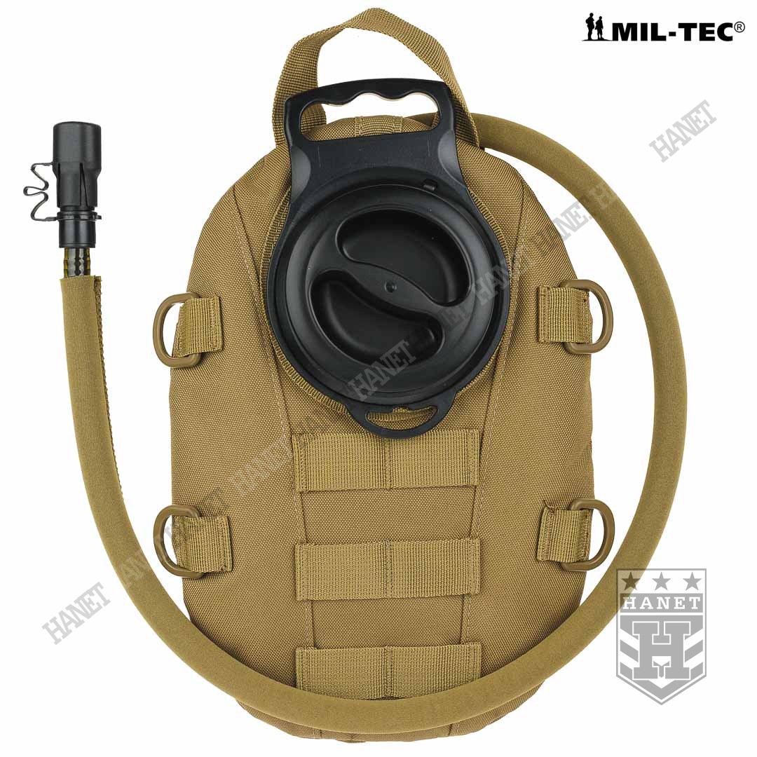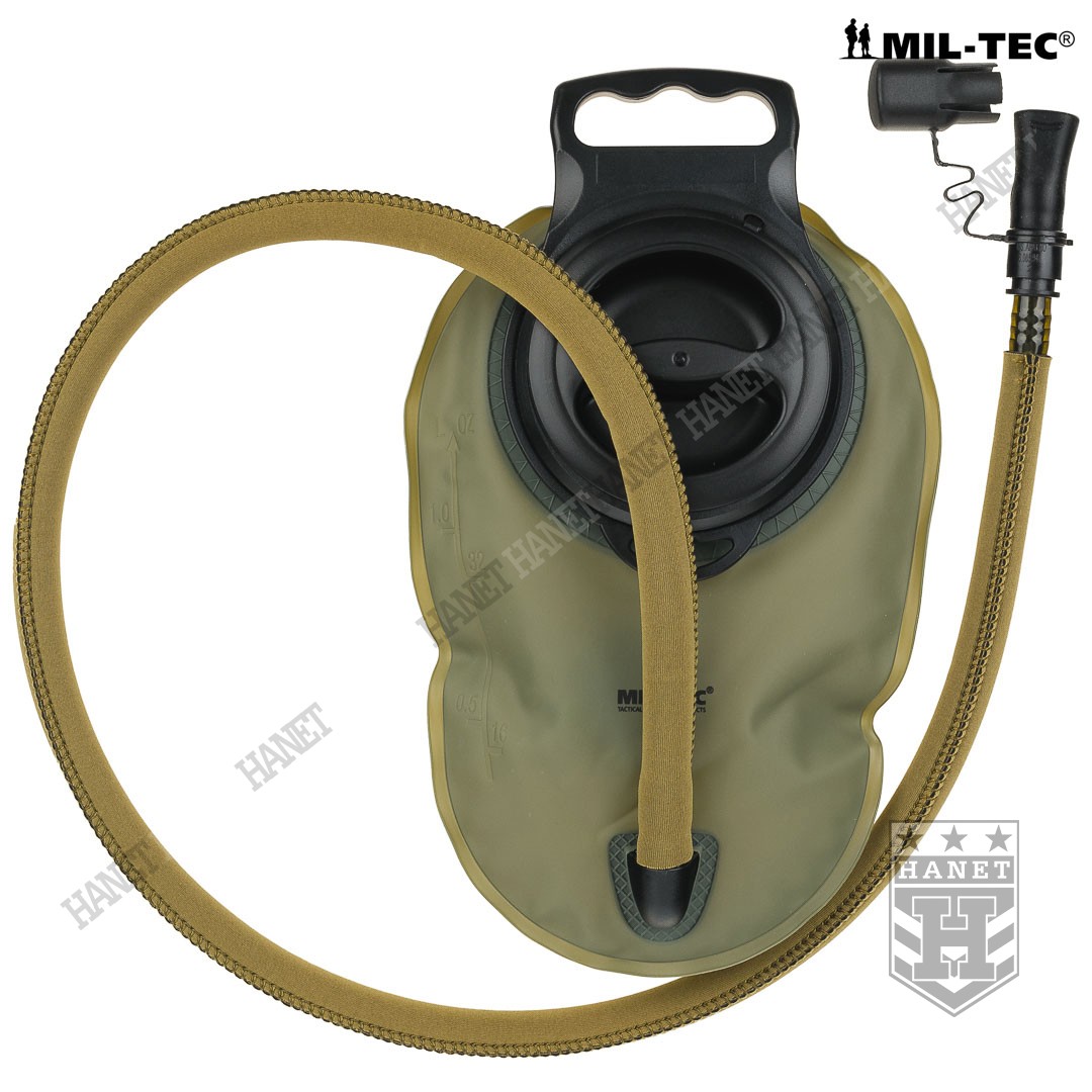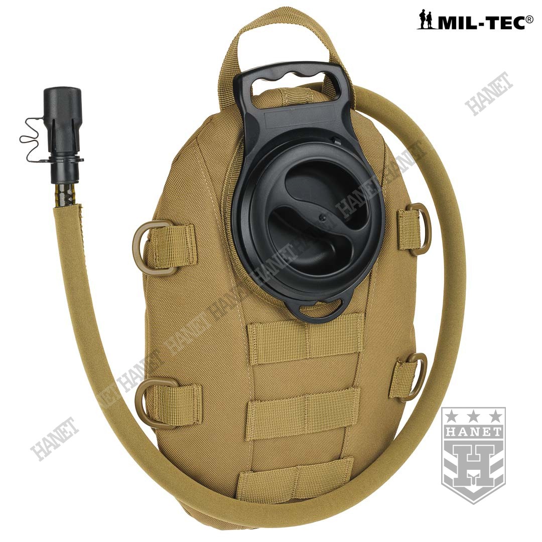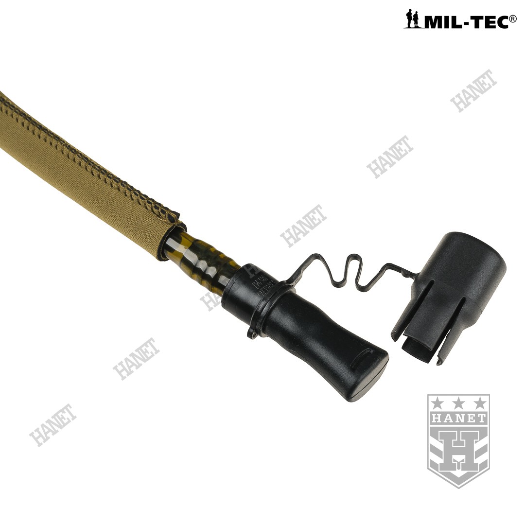 Taktyczny system hydracyjny w zasobniku / pokrowcu modularnym. Camelbak zapewnia stały i łatwy dostęp do wody podczas marszu, patroli, taktyki, jazdy na rowerze lub podczas innych absorbujących i męczących zajęć gdy trzeba często uzupełniać płyny. Produkt niemieckiej firmy Mil-Tec, linia Professional. Model opracowany na podstawie doświadczeń żołnierzy jednostek specjalnych. Pokrowiec z systemem montażowym MOLLE 25 mm, jest integralną częścią modularnego oporządzenia taktycznego (kamizelki, panele, plecaki itp.). Niezwykle lekki i kompaktowy - przystosowany do taktyki czarnej (Anty Terrorystycznej) i MOUT (Military Operations on Urban Terrain). Polecany także graczom ASG i paintballowcom. Pojemność 1,5 L - idealna na kilkugodzinne akcje, patrole lub strzelanki. Nowoczesna konstrukcja, szczelna i wytrzymała. Pokrowiec wykonany z mocnego nylonu 600D, usztywniany i profilowany pianką termo-izolacyjną która zapobiega nadmiernemu nagrzewaniu lub zamarzaniu wody. Pianka stanowi dodatkową osłonę wkładu hydracyjnego przed uszkodzeniem mechanicznym. Cztery D-ringi do podczepiania elementów wyposażenia umożliwiają również zamocowanie szelek i noszenie jak plecak. U dołu otwór do odprowadzania wody z wnętrza camelbaka przydatny w wypadku zalania, możliwość mycia pokrowca pod bieżącą woda. Uniwersalny wkład - pasuje do plecaków i kamizelek taktycznych. Bukłak na wodę o pojemności 1,5 L wykonany z wytrzymałego i elastycznego tworzywa. Duży i sztywny wlew umożliwia włożenie ręki do środka, bardzo łatwe mycie i ułatwione suszenie. Element mocujący wkład do pokrowca wyposażony w uchwyt i zawieszkę która daje opcję użycia bukłaku np. w plecaku. Czarny kolor wkładu daje ewentualność podgrzania wodny na słońcu. Rurka o długości 105 cm osłonięta rękawem neoprenowym dla wzmocnienia i osłony termicznej, z dodatkową szybkozłączką. Duża średnica rurki zapewnia dobry przepływ wody a grube ścianki zapobiegają jej ściskaniu. Kranik Hi-Flow łatwy i szybki w obsłudze, wystarczy przekręcić dźwigienkę zaworu, pozycje ON i OFF. Gumowy ustnik szczelinowy zabezpiecza przed wylaniem cennej wody, wyposażony w nakładkę antybakteryjną. System szybkiej wymiany ustnika umożliwia korzystanie z jednego camelbaka kilku osobom. Dla lewo i prawo ręcznych. Usztywniane taśmy montażowe.