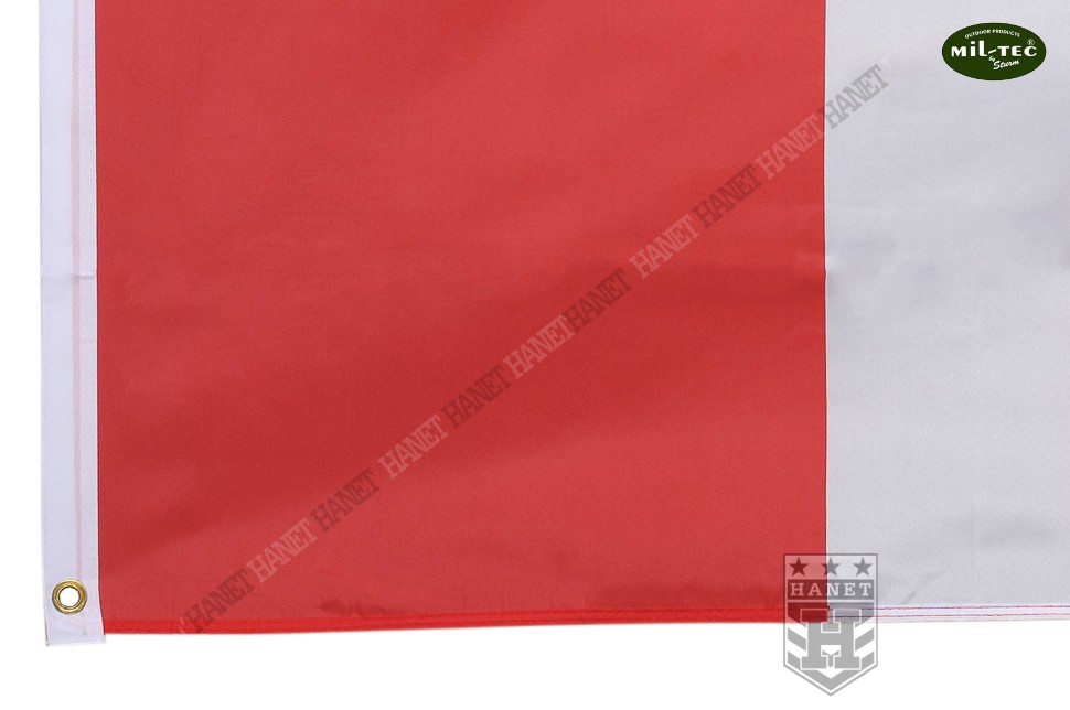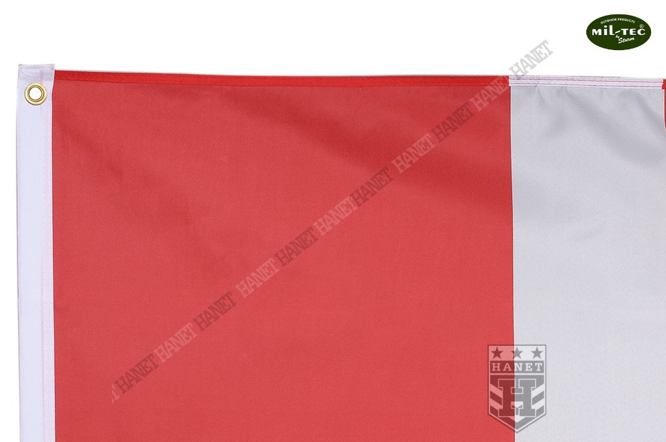 Uniwersalna flaga na maszt lub drzewiec o standardowych wymiarach 90 x 150 cm. Najwyższa, niemiecka jakość wykonania i wyselekcjonowane materiały gwarantują długowieczność użytkowania, nawet w bardzo niekorzystnych warunkach silnego wiatru, częstych opadów i destrukcyjnego działania słońca. Wytrzymały materiał poliestrowy przeznaczony specjalnie do flag. Wszystkie krawędzie boczne z potrójną zakładką i dodatkowo przeszywane podwójnymi szwami - zabezpieczone przed pruciem materiału szarpanego przez wiatr. Barwy narodowe naniesione specjalną techniką drukarską, kolory nie płowieją, flaga zachowuje pożądany wygląd. Lekkość tkaniny ułatwia łopotanie flagi na wietrze. Do poliestru nie przywiera brud i łatwo go doprać, jest szybkoschnący. Dwa nierdzewne, miedziane oczka do montażu na maszcie lub do drzewca, gwarantują solidne zaczepienie. Krawędź flagi na której przynitowane są oczka wzmocniony dwiema warstwami grubego materiału. Dwustronna, na rewersie lustrzane odbicie awersu.