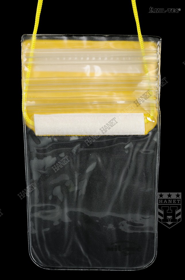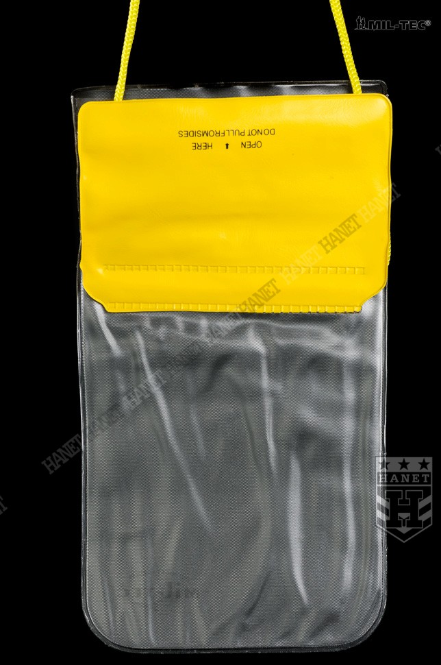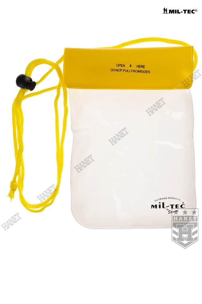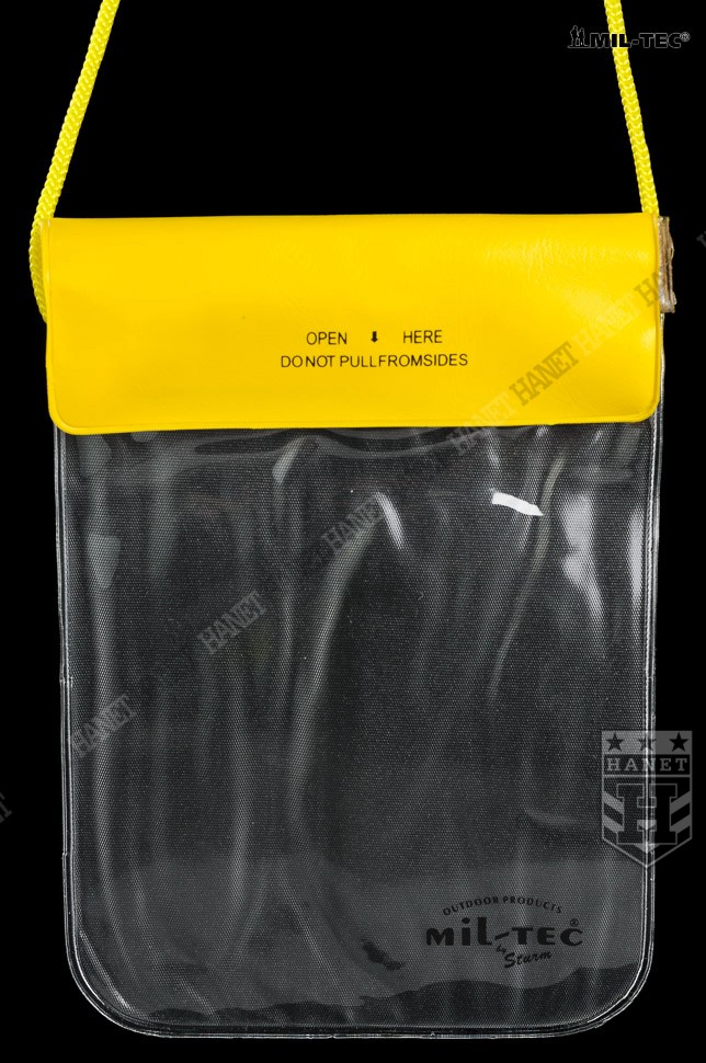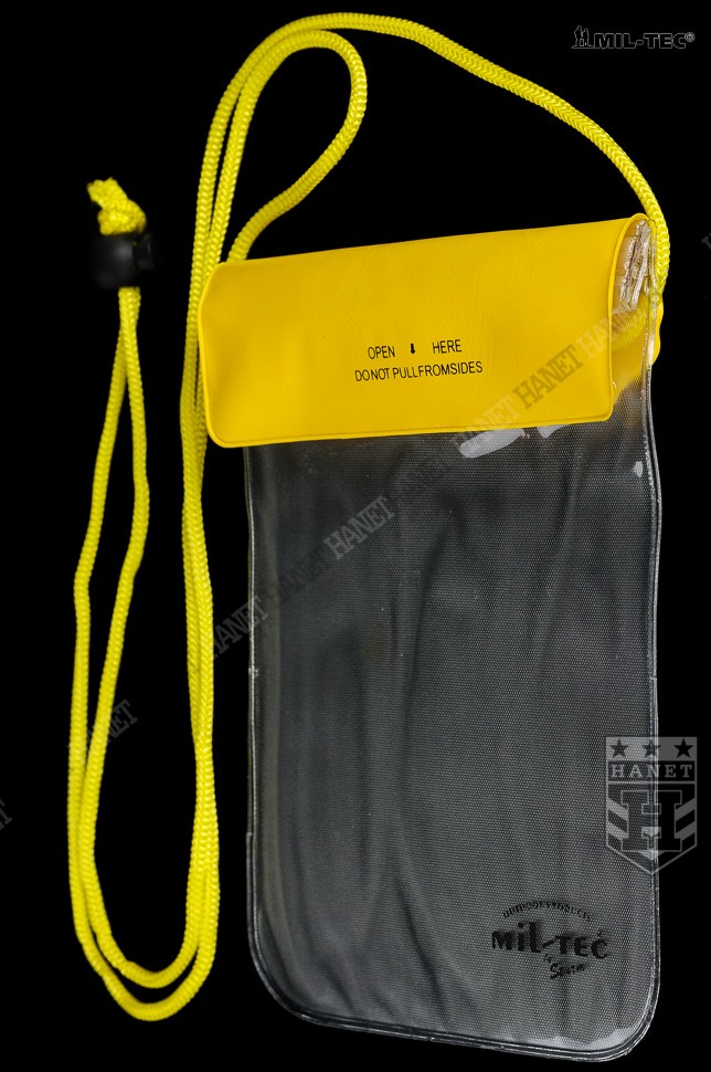 Uniwersalny pokrowiec wodoszczelny. Przeznaczony do ochrony cennych przedmiotów przed zmoknięciem lub zalaniem. Produkt renomowanej niemieckiej firmy Mil-Tec. Polecany miłośnikom trekingu, rowerów, spływów, żeglarzom, wędkarzom i każdemu, kto aktywnie spędza czas. Wykonany z grubego, wytrzymałego a jednocześnie elastycznego tworzywa. Przednia ściana całkowicie przeźroczysta co ułatwia np. korzystanie z telefonu lub nawigacji bez wyciągania z pokrowca. Szczelne i łatwe w obsłudze zamknięcie. Etui zamykane za pomocą potrójnego zapięcia strunowego które jest dodatkowo zwijane i zamykane klapą na rzep. Długa, regulowana smycz do zawieszania na szyi. Jaskrawe elementy przyciągają wzrok i ułatwiają odnalezienie pokrowca. Brzegi łączone solidnym, szerokim zgrzewem, zaokrąglone rogi zwiększają wytrzymałość. Rozmiar uniwersalny, pasuje do wszystkich telefonów komórkowych, nawigacji, portfeli, doskonały na dokumenty lub pieniądze.