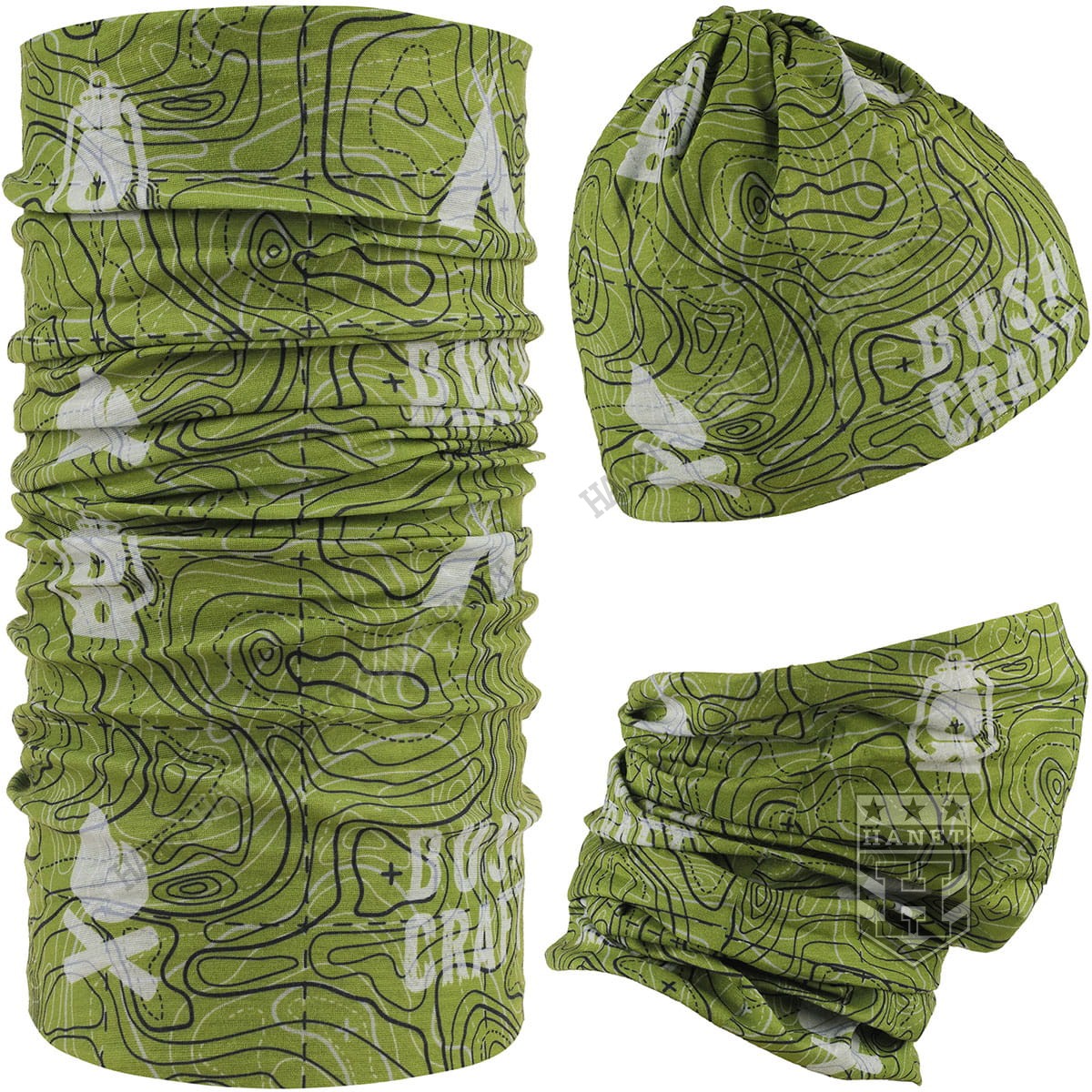 Uniwersalny komin - szalokominiarka. Przeznaczony dla alpinistów, amatorów sportów zimowych, jazdy na rowerze, trekkingowców i miłośników outdooru. Niezbędny element odzieży w każdej szafie. Komin jest bardzo praktyczny, można wykorzystać go jako czapkę (jedno bądź dwu warstwową), szal, kominiarkę, maskę, balaclavę, opaskę na uszy, gumkę do włosów, bandamkę, a nawet jako skarpetę. Osłania szyję, twarz lub głowę przed wiatrem i mrozem. W ciepłe dni chroni przed palącym słońcem, jest przewiewny i termoaktywny, szybko odparowuje wilgoć. Bezszwowy krój w kształcie rękawa, dostosowuje się do anatomii ciała. Grafika Bushcraft nawiązująca do poziomic na mapach topograficznych.