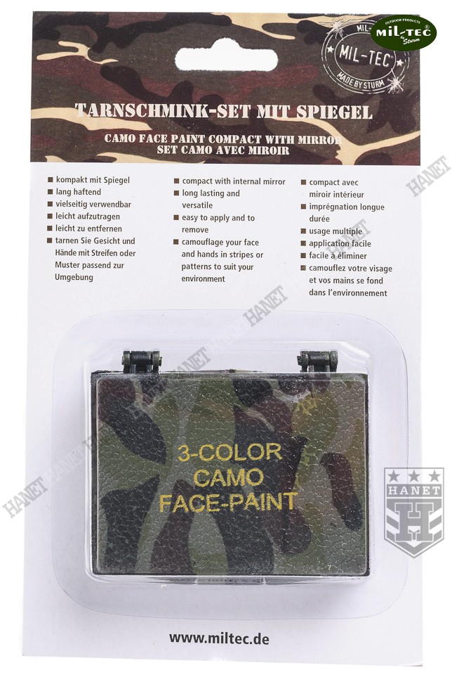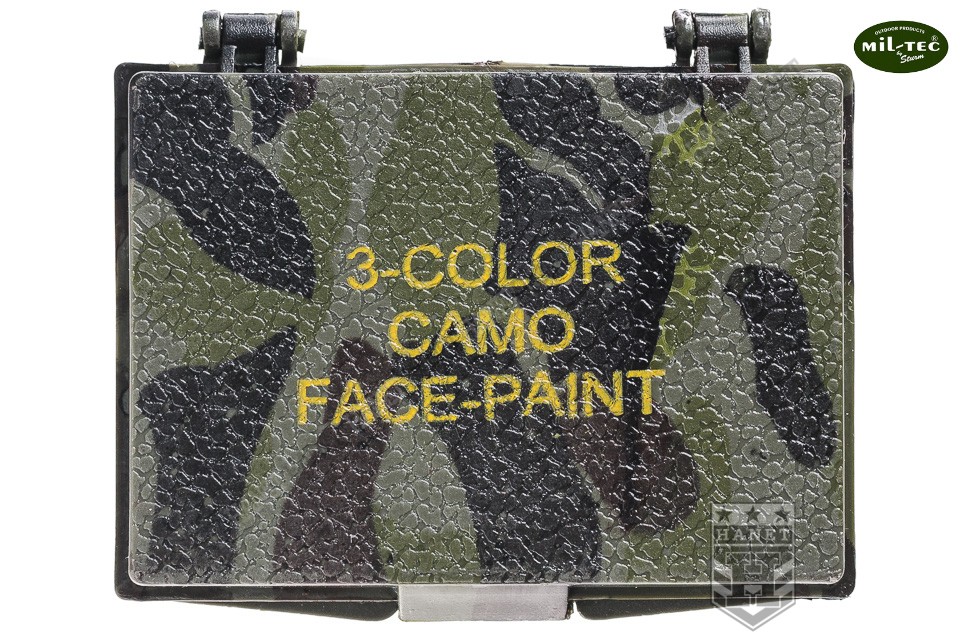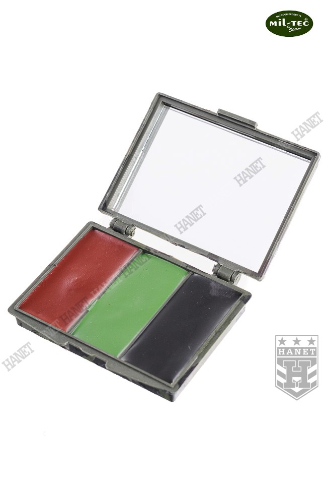 Profesjonalna farba do kamuflażu. Produkt niemieckiej firmy Mil-Tec®. Doskonała do maskowania twarzy i rąk. Funkcjonalne pudełko z wytrzymałego tworzywa mieszczące 3 przegrody z farbą w kolorach na różne pory roku i różne rodzaje terenu. Lusterko ułatwiające dokładne pokrycie twarzy z dodatkowymi zastosowaniami w technikach przetrwania. Dobrze kryje i jest odporna na działanie wody i potu - doskonale maskuje. Opatentowany skład pielęgnuje i nawilża skórę, odstrasza insekty, ma właściwości bakteriobójcze - całkowicie nietoksyczny. Zawiera składniki często używane do produkcji kosmetyków. Do stosowania na twarz, dłonie, szyję oraz za uszami. Zapakowana w fabryczny blister.
