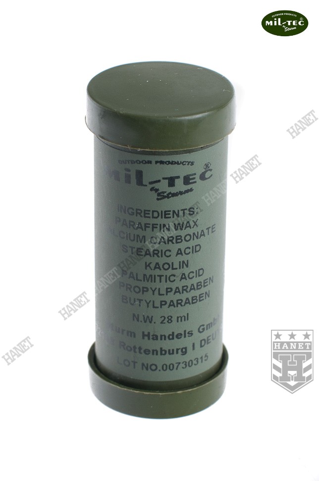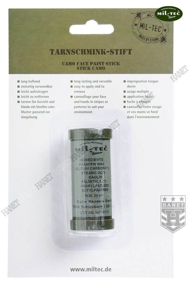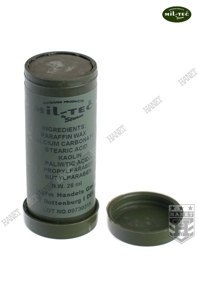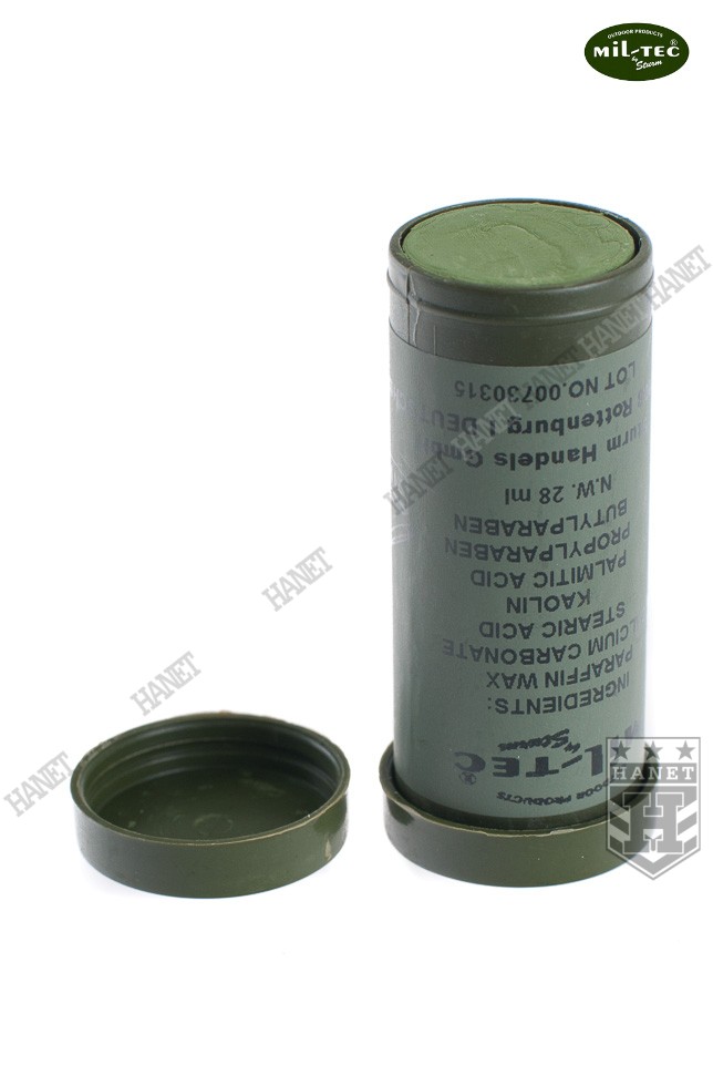 Farba maskująca do ciała w sztyfcie. Specyfikacja militarna gwarantuje wysoką jakość. Popularny sztyft zyskał uznanie wśród jednostek z całego świata. Polecana przez profesjonalistów dla myśliwych, survivalowców, miłośników paintballu i ASG. Dobrze kryje i jest odporna na działanie wody i potu - doskonale maskuje. Wygodny i łatwy w użyciu sztyft. Dwukolorowa - farby wysuwane osobno z tuby. Opatentowany skład pielęgnuje i nawilża skórę, odstrasza insekty, ma właściwości bakteriobójcze - całkowicie nietoksyczny. Zawiera składniki często używane do produkcji kosmetyków. Farba jest bardzo wydajna, sztyft starcza na wiele użyć. Do stosowania na twarz, dłonie, szyję i za uszami. Odcienie naturalnie występujące w przyrodzie.