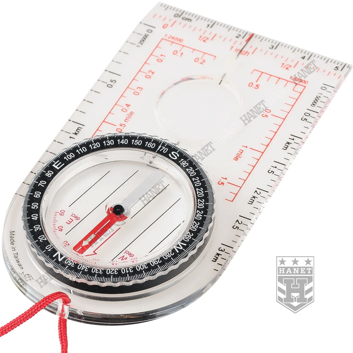 - Miarki odległości na mapie: Na płaskich bokach płytki naniesiono skale do szybkiego odczytywania odległości w metrach na mapach w skali 1:25 000 i 1:50 000. Dodatkowe skale w systemie imperialnym: 1:62 500, 1:24 000.