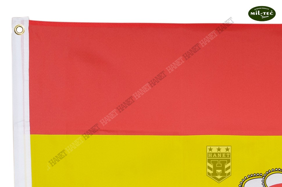 Uniwersalna flaga na maszt lub drzewiec o standardowych wymiarach 90 x 150 cm. Najwyższa, niemiecka jakość wykonania i wyselekcjonowane materiały gwarantują długowieczność użytkowania, nawet w bardzo niekorzystnych warunkach silnego wiatru, częstych opadów i destrukcyjnego działania słońca. Wytrzymały materiał poliestrowy przeznaczony specjalnie do flag. Wszystkie krawędzie boczne z potrójną zakładką i dodatkowo przeszywane podwójnymi szwami - zabezpieczone przed pruciem materiału szarpanego przez wiatr. Barwy narodowe naniesione specjalną techniką drukarską, kolory nie płowieją, flaga zachowuje pożądany wygląd. Lekkość tkaniny ułatwia łopotanie flagi na wietrze. Do poliestru nie przywiera brud i łatwo go doprać, jest szybkoschnący. Dwa nierdzewne, miedziane oczka do montażu na maszcie lub do drzewca, gwarantują solidne zaczepienie. Krawędź flagi na której przynitowane są oczka wzmocniony dwiema warstwami grubego materiału. Dwustronna, na rewersie lustrzane odbicie awersu.