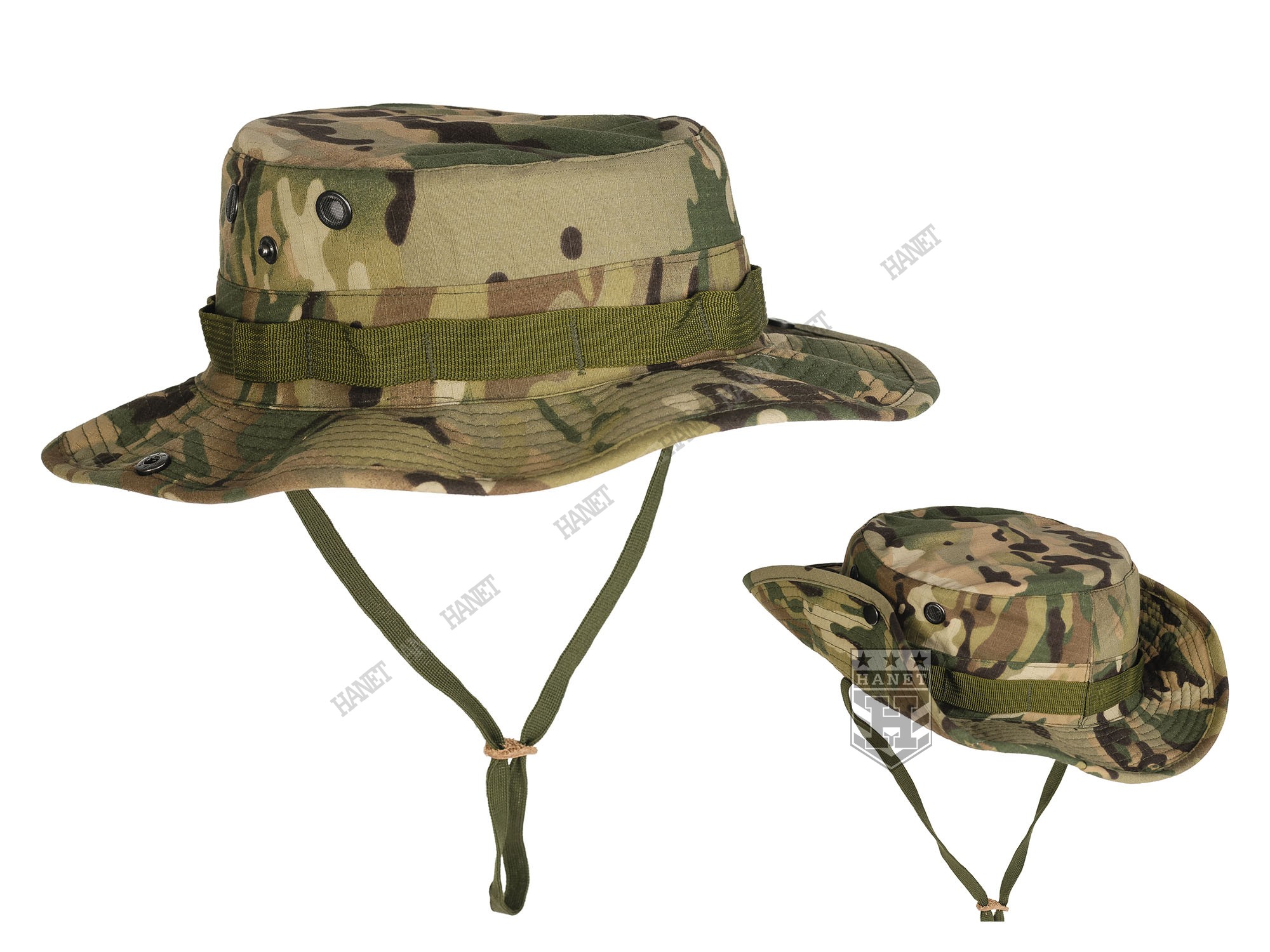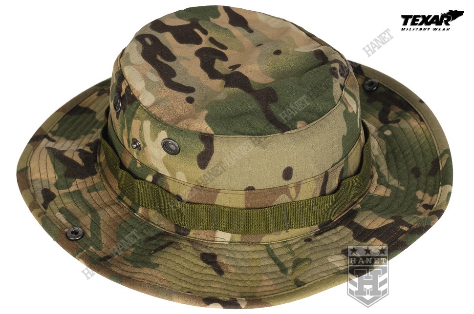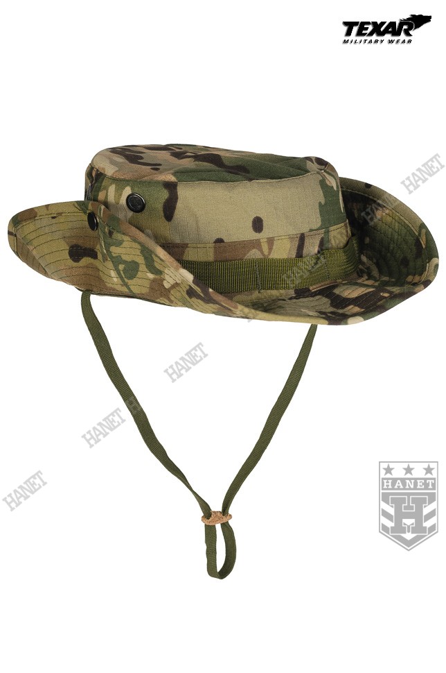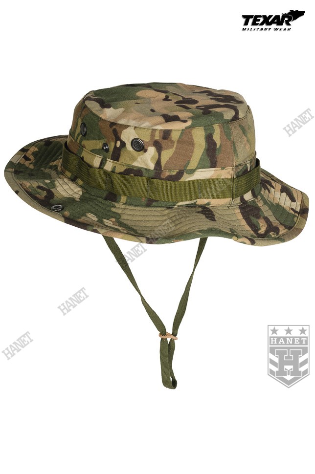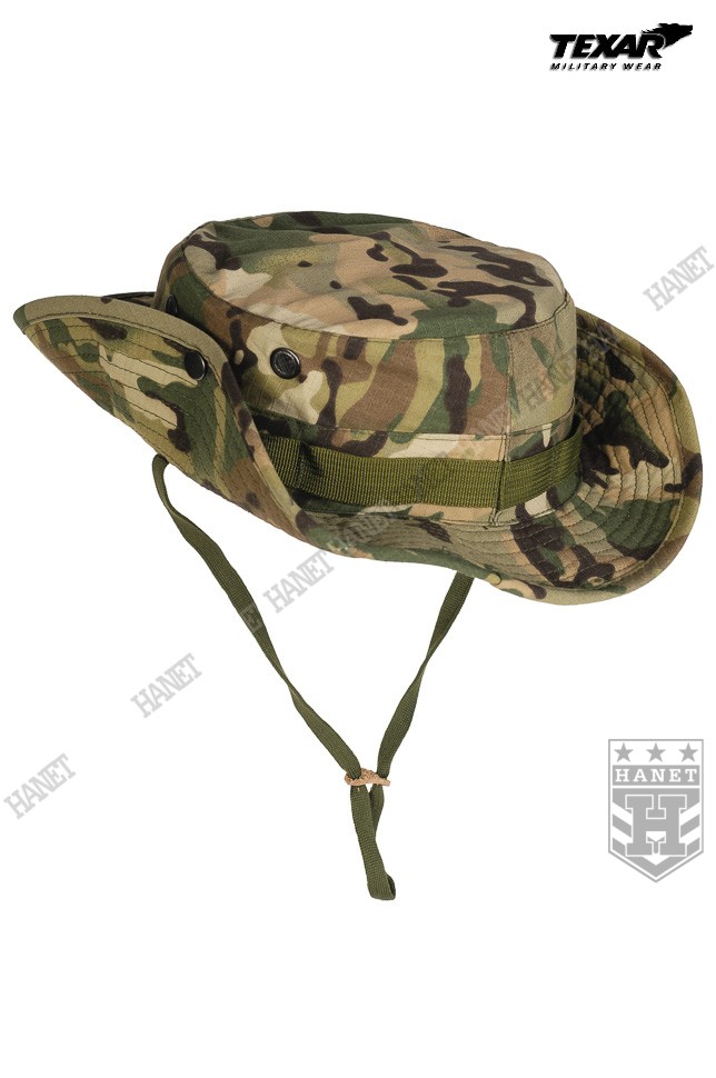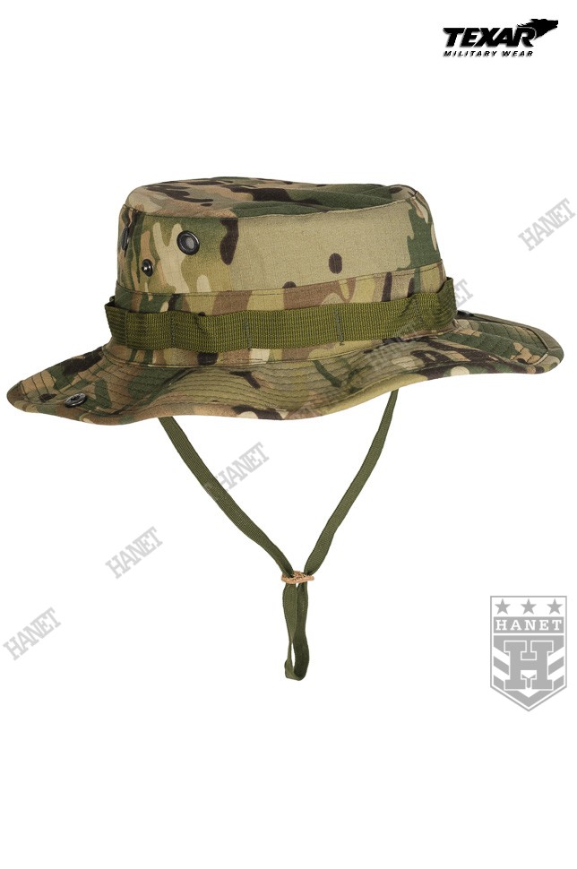 Kapelusz wzór US Army, zaadoptowany min. przez Wojsko Polskie. Chroni głowę przed warunkami atmosferycznymi. Doskonały w maskowaniu, rozmywa sylwetkę i zasłania głowę i twarz. Dobry krój gwarantuje, że kapelusz zawsze dobrze leży. Uszyty z materiału Rip-Stop (60% bawełna Rip-stop, 40% poliester). Rip-Stop to specjalna technologia wzmacniania materiału poprzez dodanie w splot tkaniny mocniejszych włókien - charakterystyczna kratka. Materiał solidny i trwały, a jednocześnie przewiewny, szybkoschnący oraz oddychający. Szerokie, usztywniane rondo chroni przed słońcem i deszczem. Możliwość uniesienia boków ronda i przyczepienie ich za pomocą metalowych nap. Kapelusz został obszyty nylonową taśmą okalającą, która jest przeznaczona do mocowania maskowania, podręcznych przedmiotów lub moskitiery. Duże wywietrzniki zabezpieczone gęstą siateczką, chronią przed insektami. Elastyczny sznurek pod brodę, wyposażony w skórzany stoper. Ścianki boczne uszyte z podwójnego materiału. Solidne, nylonowe szwy gwarantują wytrzymałość.