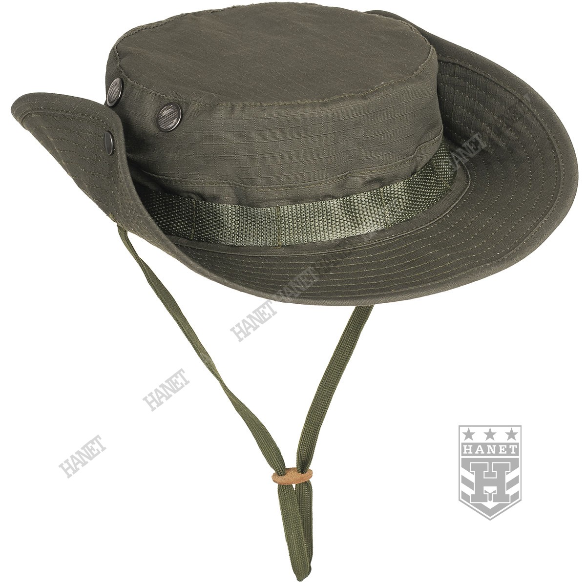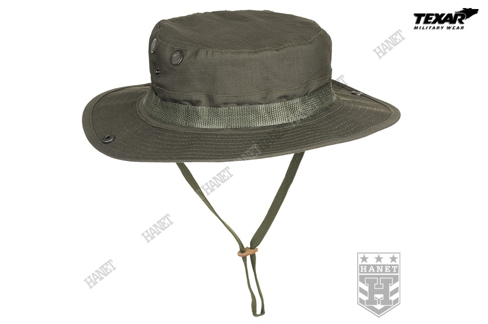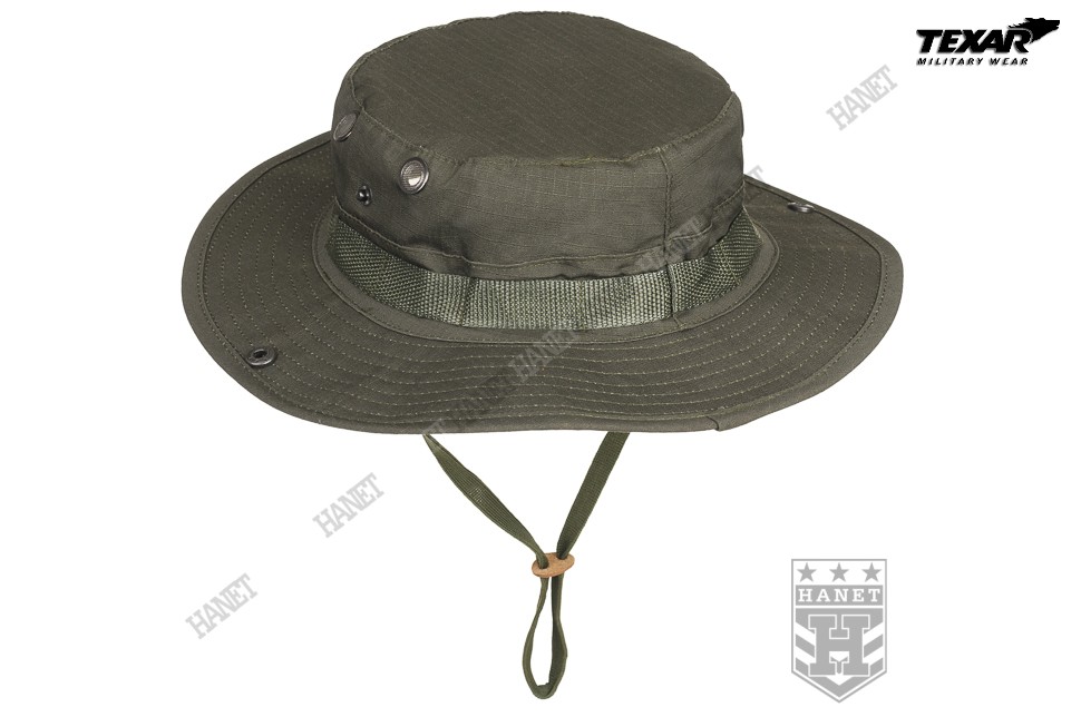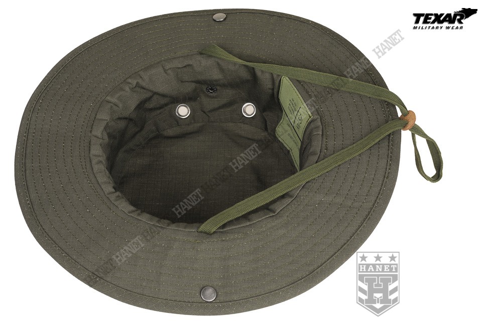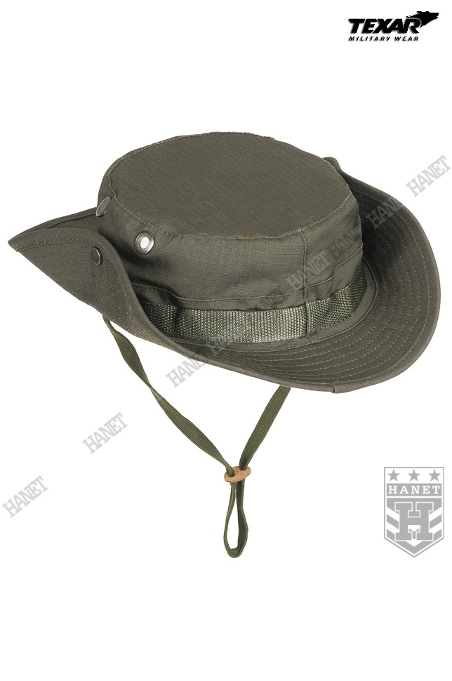 Kapelusz wzór US Army, zaadoptowany min. przez Wojsko Polskie. Chroni głowę przed warunkami atmosferycznymi. Doskonały w maskowaniu, rozmywa sylwetkę i zasłania głowę i twarz. Dobry krój gwarantuje, że kapelusz zawsze dobrze leży. Uszyty z materiału Rip-Stop (60% bawełna Rip-stop, 40% poliester). Rip-Stop to specjalna technologia wzmacniania materiału poprzez dodanie w splot tkaniny mocniejszych włókien - charakterystyczna kratka. Materiał solidny i trwały, a jednocześnie przewiewny, szybkoschnący oraz oddychający. Szerokie, usztywniane rondo chroni przed słońcem i deszczem. Możliwość uniesienia boków ronda i przyczepienie ich za pomocą metalowych nap. Kapelusz został obszyty nylonową taśmą okalającą, która jest przeznaczona do mocowania maskowania, podręcznych przedmiotów lub moskitiery. Duże wywietrzniki zabezpieczone gęstą siateczką, chronią przed insektami. Elastyczny sznurek pod brodę, wyposażony w skórzany stoper. Ścianki boczne uszyte z podwójnego materiału. Solidne, nylonowe szwy gwarantują wytrzymałość.