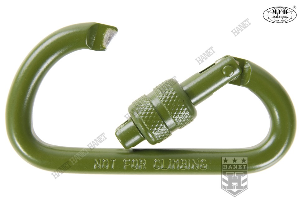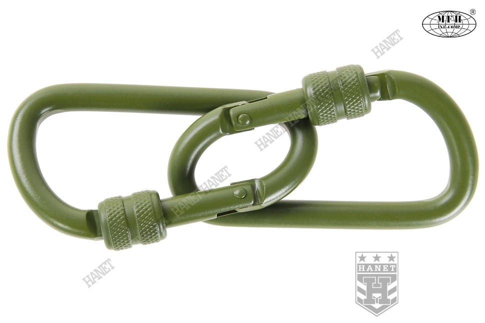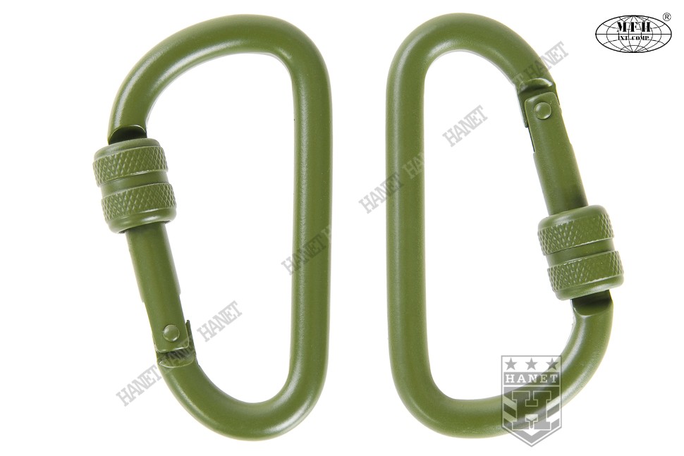 Para lekkich karabinków pomocniczych o specyfikacji militarnej. Produkt niemieckiej firmy MFH Int. Comp. Doskonałe do podczepiania części oporządzenia, zawieszeń taktycznych lub jako brelok. Budowa typu HMS, najbardziej uniwersalna. Zamknięcie typu SCREW LOCK, wyposażone w zakręcaną blokadę - pewne i wygodne. Wykonany z lekkiego i wytrzymałego stopu aluminium. Nierdzewny i odporny na mikropęknięcia. Pokryty warstwą farby epoksydowej w kolorze maskującym. Karabinek nie jest przeznaczony do wspinaczki.