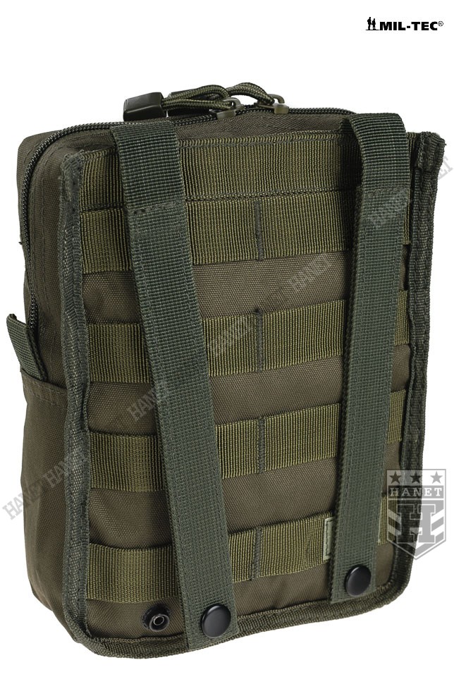 Duża kieszeń modularna w systemie montażowym MOLLE. Produkt niemieckiej marki Mil-Tec®. Integralna część oporządzenia, montowana zazwyczaj do kamizelki taktycznej, plecaka lub pasa. Możliwość wykorzystania jako apteczkę, kieszeń na sprzęt lub rację żywnościową. Wykonana z wytrzymałego i jednocześnie lekkiego materiału - 100% Poliester 600D Oxford Fabric. Materiał jest wodoodporny, odporny na przetarcia i zużycie. Kieszeń w ograniczonym stopniu chroni zawartość przed deszczem i rozbryzgami cieczy. Wnętrze obszyte śliskim materiałem nylonowym. Krawędzie materiału zabezpieczone lamówką. Solidne szycia nylonowymi nićmi oraz dodatkowe przeszycia w newralgicznych miejscach.