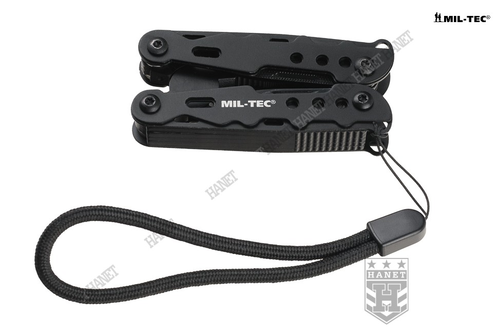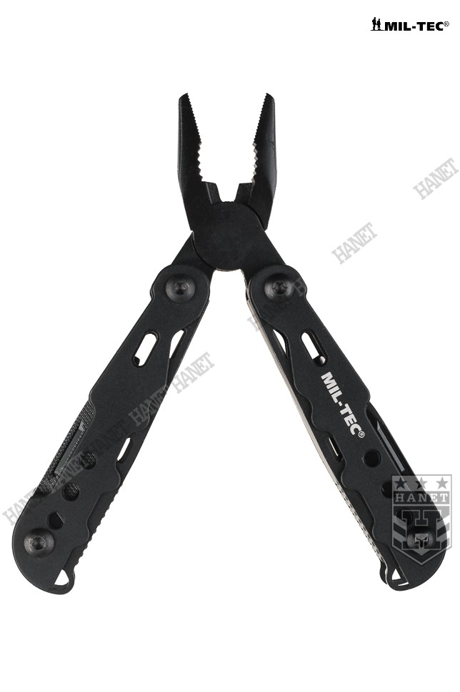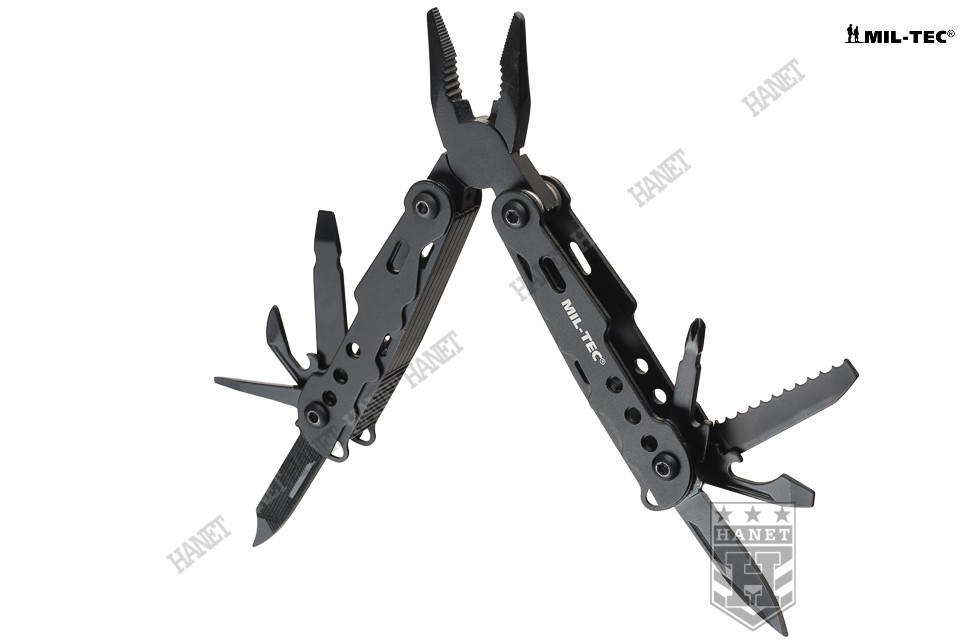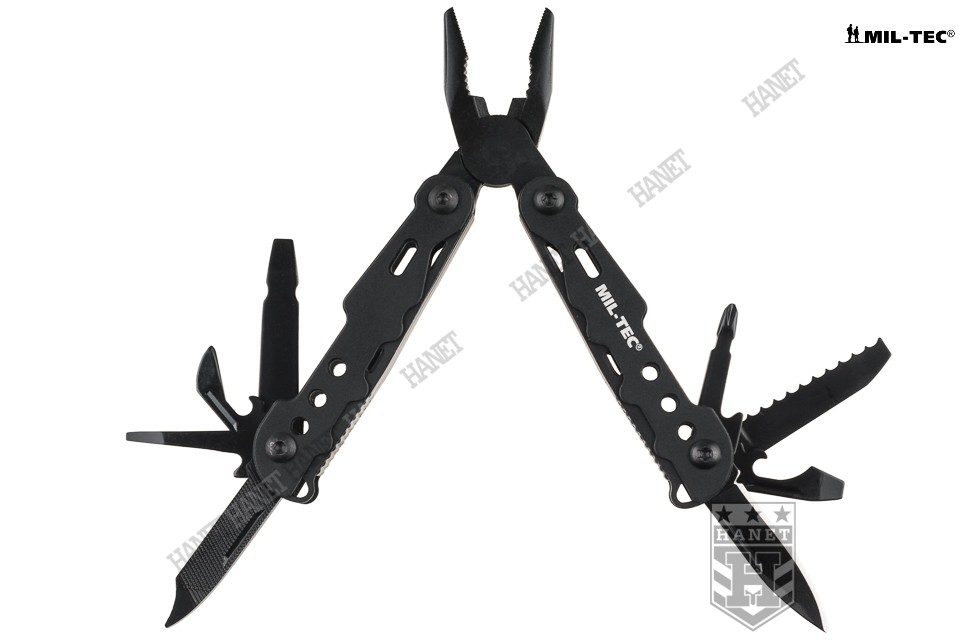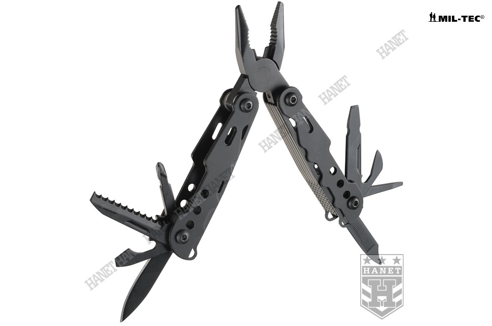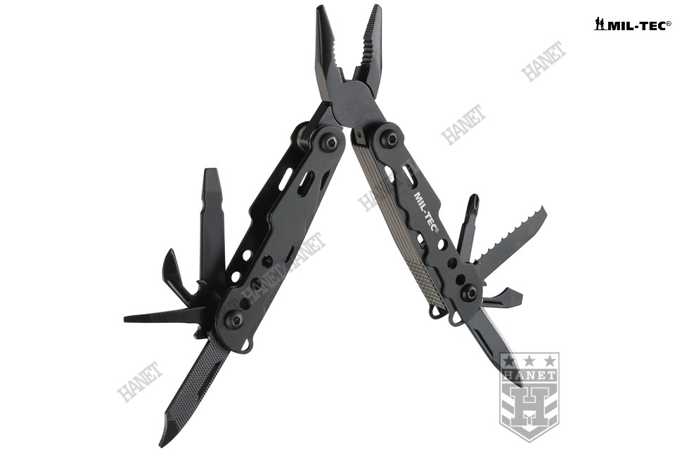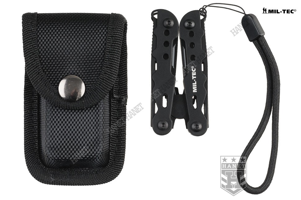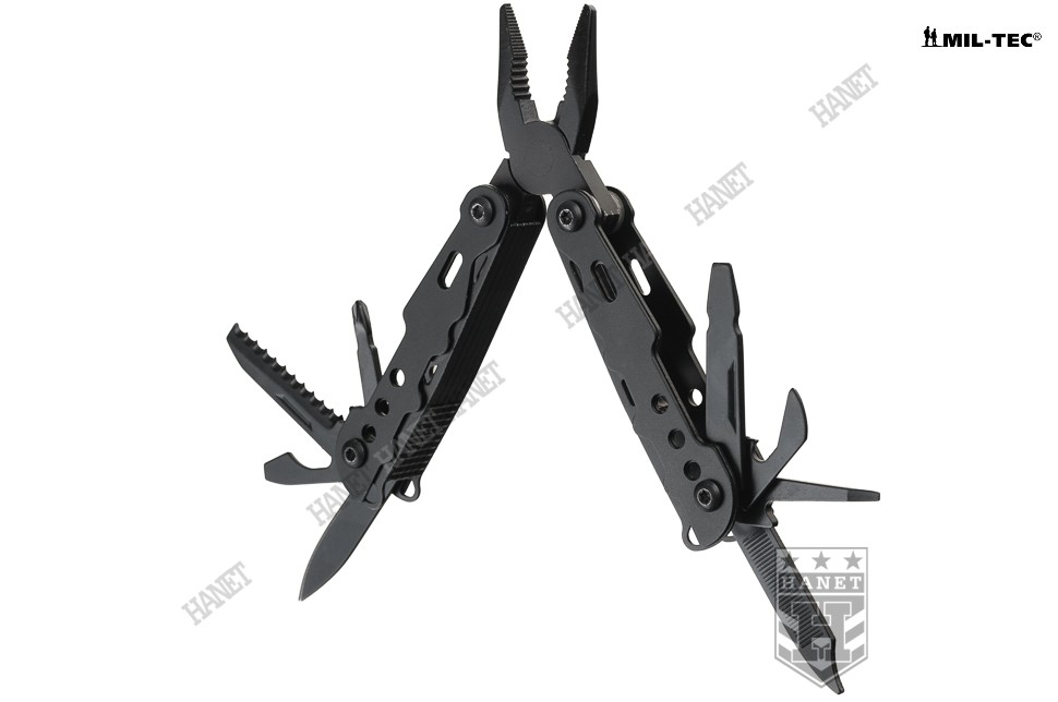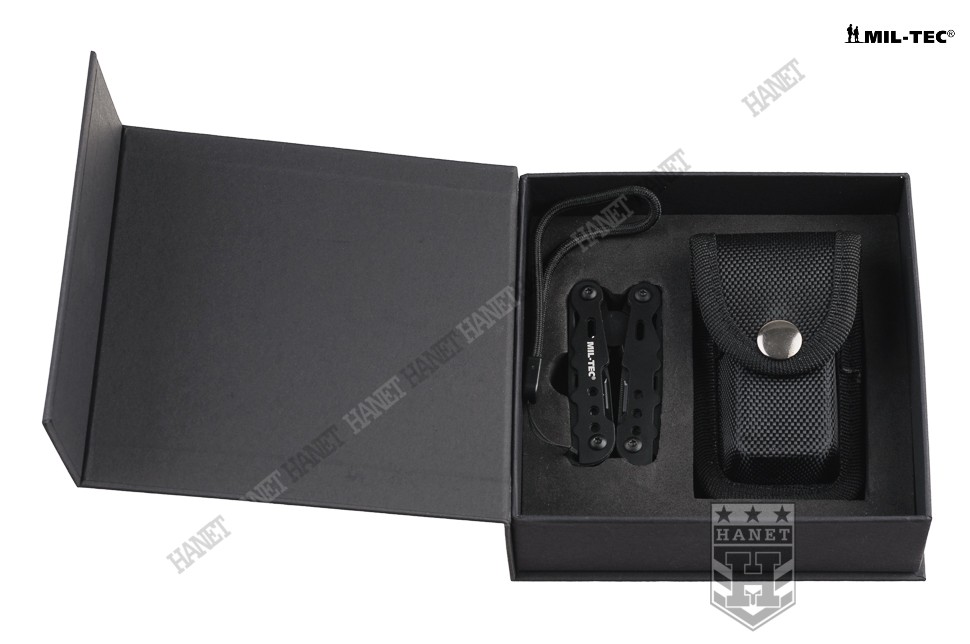 Nowoczesny multitool kieszonkowy. Produkt niemieckiej marki Mil-Tec®. Multitool to zestaw dziewięciu praktycznych narzędzi i kilkunastu funkcji w jednym - kieszonkowy warsztat. Zaprojektowany tak, by maksymalnie ułatwić obsługę, mechanizmy sprężynowe powodują, że użytkowanie multitoola jest proste i przyjemne. Liczne perforacje, wycięcia i nawiercenia pozwalają znacznie zmniejszyć wagę przy zachowaniu sztywności konstrukcji. W komplecie sztywne etui z nylonu i smycz nadgarstkowa. Multitool został zapakowany w estetyczne pudełko, doskonały na prezent.