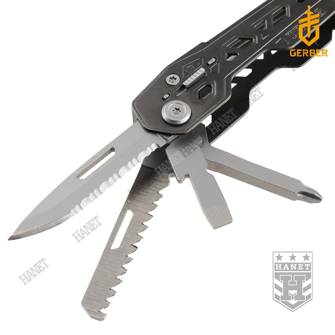 Uzupełnieniem funkcji są narzędzia chowane w szkielecie (rękojeściach) i otwierane z zewnątrz. Ostry i precyzyjny nóż z klingą Drop Point, ze spiczastym czubkiem i gładką krawędzią (FE) - idealny do precyzyjnego cięcia, obróbki drewna, siekania, skrobania, obierania, cięcia warzyw i owoców, folii lub otwierania kartonów. Nóż z ostrzem ząbkowanym (SE) jest doskonały do szybkiego cięcia linek, taśm, tkanin lub krojenia mięsa oraz pieczywa. Nożyczki wyposażone w mechanizm sprężynowy i powiększoną dźwignię są wygodnie obsługiwane jednym palcem. Nożyczki spisują się w cięciu papieru, włosów, paznokci i miękkich materiałów. Dwurzędowa piła z ostrymi zębami umieszczonymi naprzemiennie, gwarantuje szybkie piłowanie i brak zakleszczeń. Piła jest przystosowana do cięcia drewna, tworzyw, a nawet lodu. Pełnowymiarowy śrubokręt krzyżowy pozwala na bezproblemowe wkręcanie śrub i wkrętów. Wkrętak na długim kwadratowym trzpieniu, po rozłożeniu znajduje się blisko osi multitoola zapewniając łatwiejsze korzystanie z narzędzia. Duży śrubokręt płaski pełniący również funkcję narzędzia do podważania. U jego nasady znajduje się duże trójkątne ostrze do ściągania izolacji z kabli elektrycznych, mogące również pełnić funkcję ostrza do cięcia linek lub żyłki. Otwieracz do konserw zintegrowany z otwieraczem do kapsli. Na czubku podwójnego otwieracza znajduje się mały śrubokręt płaski. Szydło do przebijania skóry i grubych tkanin (żagli, plandek, gumy), ostrze szydła pełni również funkcję skrobaka i rozwiertaka. Pilnik do drewna i tworzyw, dobry do paznokci lub dopasowania do siebie elementów. Na czubku pilnika znajduje się średni śrubokręt płaski, a na odwrocie naniesiono miarkę calową i centymetrową.
