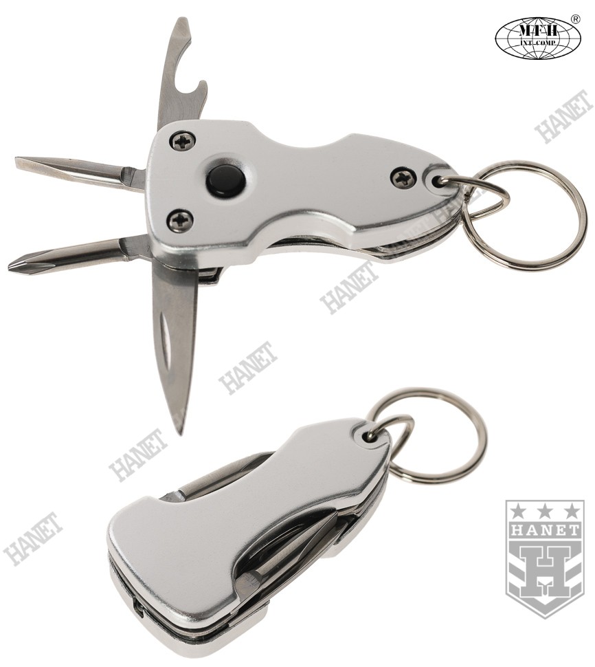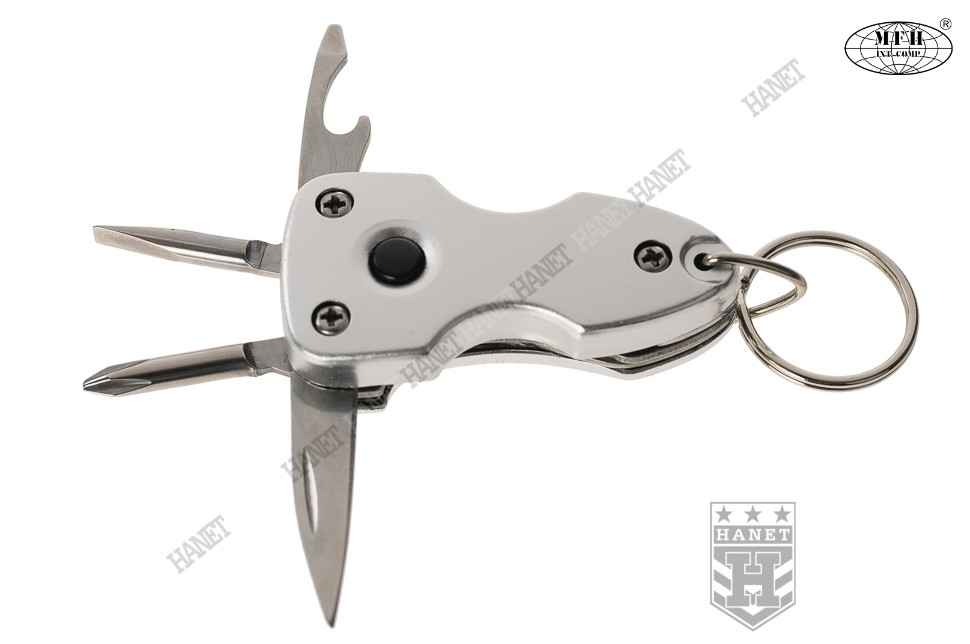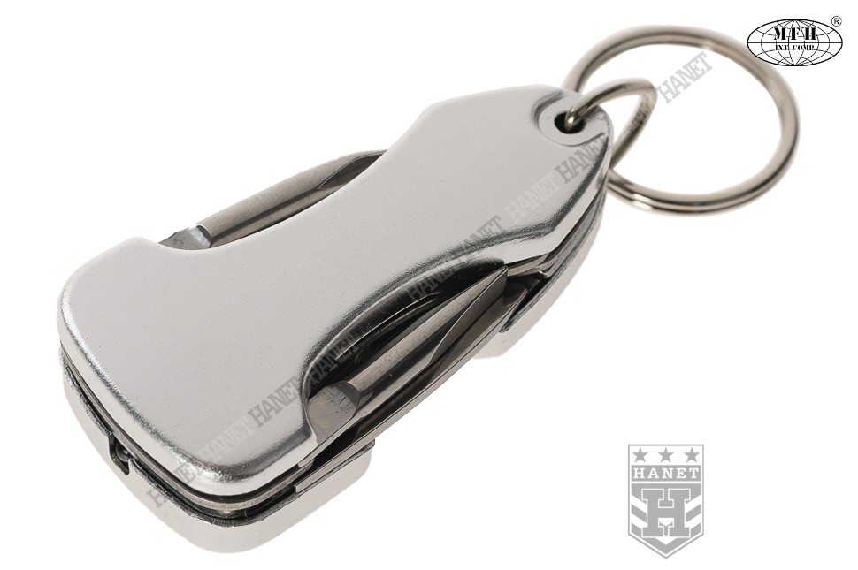 Nowoczesne narzędzie wielofunkcyjne - brelok. Produkt renomowanej niemieckiej firmy FOX® Outdoor. Wykonany z solidnych materiałów, stali nierdzewnej i aluminium. Niezwykle praktyczny, zawiera zestaw podstawowych narzędzi. Ergonomiczny kształt i designerski wygląd - doskonały jako brelok do kluczy. Wyposażony w jasną diodę LED która pomoże odnaleźć drogę lub zgubiony przedmiot w ciemności. Dioda jest energooszczędna, bateria starczy na długo. Komplet rozkładanych narzędzi: nóż z ostrym czubkiem, otwieracz do butelek, śrubokręt płaski i krzyżowy. Mocna obudowa wykonana z aluminium. Ruchoma zawieszka z oczkiem do kluczy.