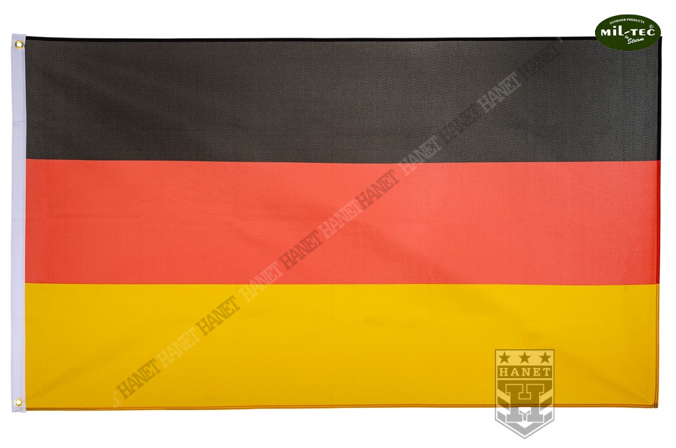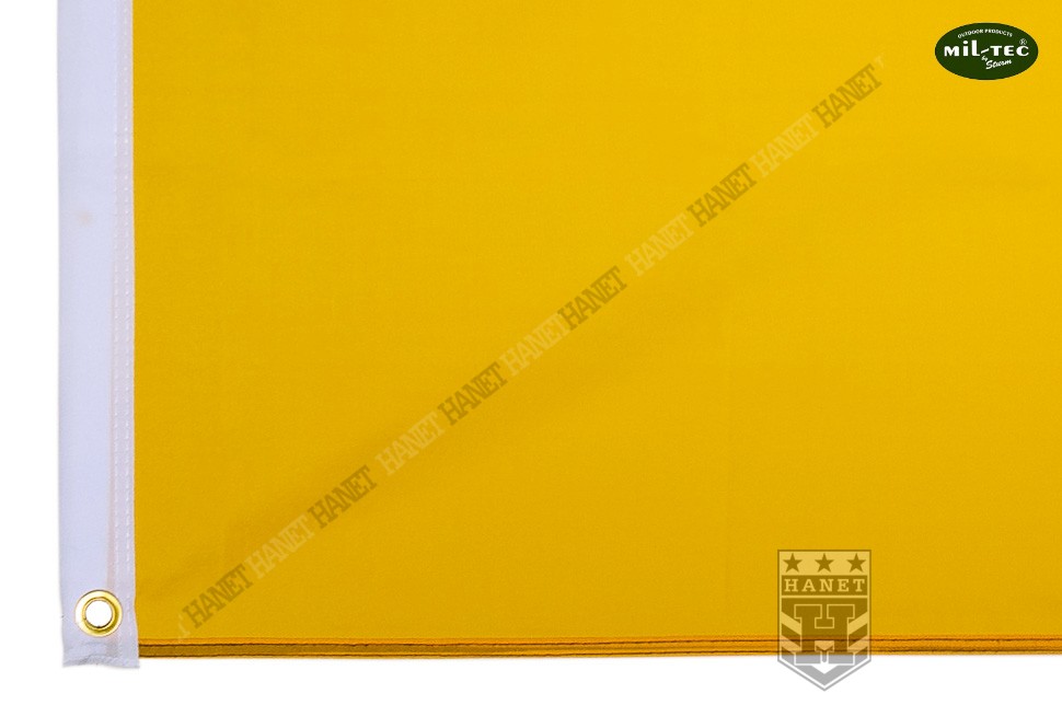 Uniwersalna flaga na maszt lub drzewiec o standardowych wymiarach 90 x 150 cm. Najwyższa, niemiecka jakość wykonania i wyselekcjonowane materiały gwarantują długowieczność użytkowania, nawet w bardzo niekorzystnych warunkach silnego wiatru, częstych opadów i destrukcyjnego działania słońca. Wytrzymały materiał poliestrowy przeznaczony specjalnie do flag. Wszystkie krawędzie boczne z potrójną zakładką i dodatkowo przeszywane podwójnymi szwami - zabezpieczone przed pruciem materiału szarpanego przez wiatr. Barwy narodowe naniesione specjalną techniką drukarską, kolory nie płowieją, flaga zachowuje pożądany wygląd. Lekkość tkaniny ułatwia łopotanie flagi na wietrze. Do poliestru nie przywiera brud i łatwo go doprać, jest szybkoschnący. Dwa nierdzewne, miedziane oczka do montażu na maszcie lub do drzewca, gwarantują solidne zaczepienie. Krawędź flagi na której przynitowane są oczka wzmocniony dwiema warstwami grubego materiału. Dwustronna, na rewersie lustrzane odbicie awersu.