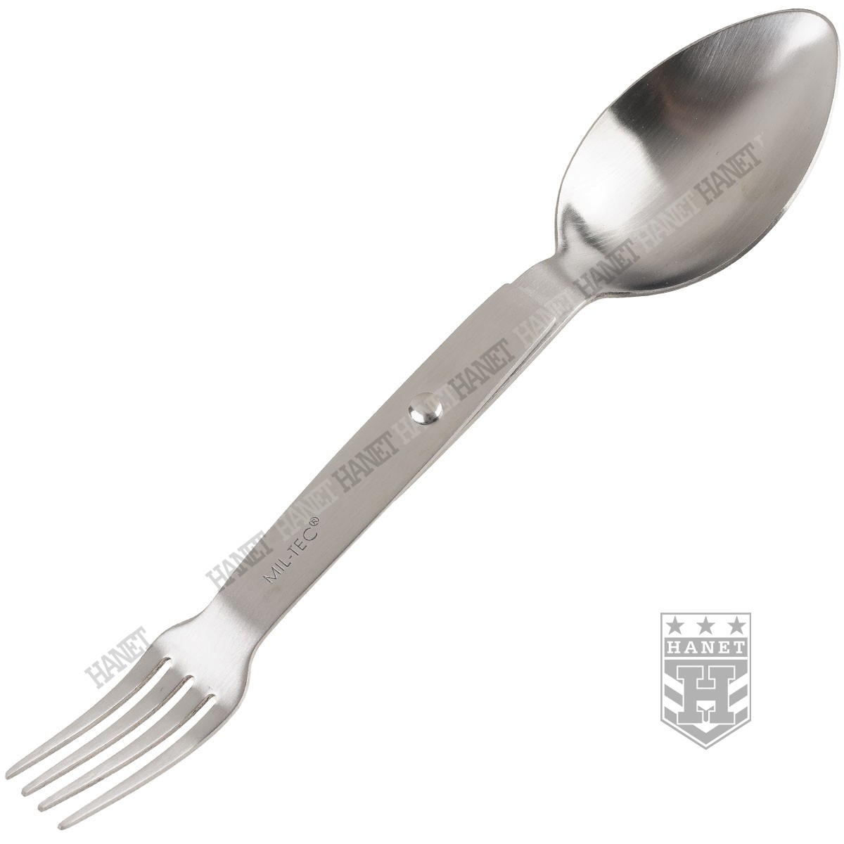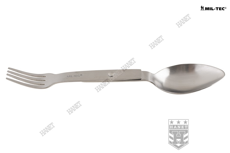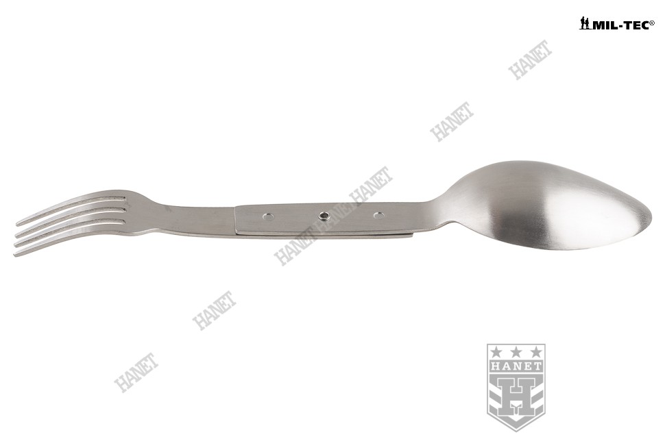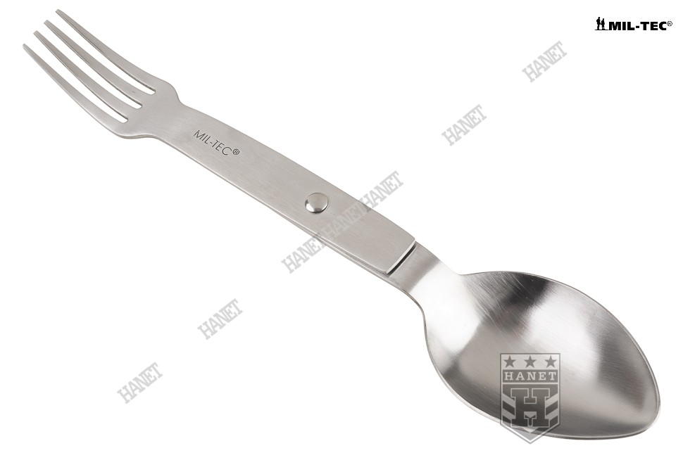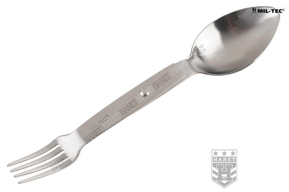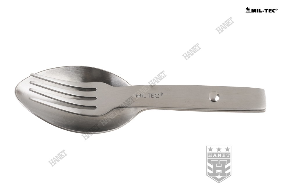 Solidny niezbędnik o specyfikacji militarnej. Produkt niemieckiej firmy Mil-Tec. W całości wykonany z gatunkowej stali nierdzewnej. Polecany miłośnikom turystyki, survivalu i osobom spędzającym aktywnie czas. Obowiązkowe wyposażenie na każdym biwaku, obozie, kempingu czy pikniku. Klasyczna konstrukcja, niezwykle wytrzymała, funkcjonalna i wygodna. Niewielkie gabaryty i masa, zmieści się w kieszeni - warto mieć go przy sobie. Niezbędnik zawiera podstawowy zestaw sztućców - łyżkę i widelec. Sztućce pełnowymiarowe. Prosty, obrotowy system rozkładania. Blokada niezbędnika w pozycji otwartej i zamkniętej. Łatwy do utrzymania w czystości, możliwość mycia w zmywarkach.
