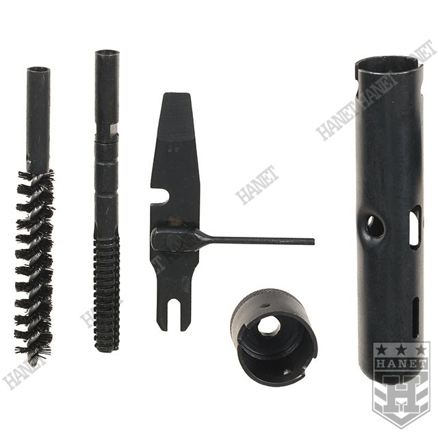 Oryginalny przybornik do karabinków z rodziny AK (AK47) / AKM. Całkowicie nowy w stanie magazynowym, zapakowany w oryginalny papier ze smarem. Instrukcja kbk AK wymaga czyszczenia ich po każdym strzelaniu, najszybciej jak to możliwe. Czyszczenie powinno się również odbywać po ćwiczeniach bez strzelania, po wartach oraz podczas dłuższego magazynowania. Przybornik zawiera narzędzia niezbędne do czyszczenia i obsługi serwisowej karabinka. Jest kompatybilny z wyciorem karabinka umieszczonym pod lufą. Wszystkie elementy zestawu mieszczą się pojemniku zamykanym nasadką. Przybornik wykonany z dobrej jakości stali pokrytej czarną oksydą dla zabezpieczenia przed korozją. Akcesoria do czyszczenia przewodu lufy ze stali o niskiej twardości dla bezpieczeństwa lufy.