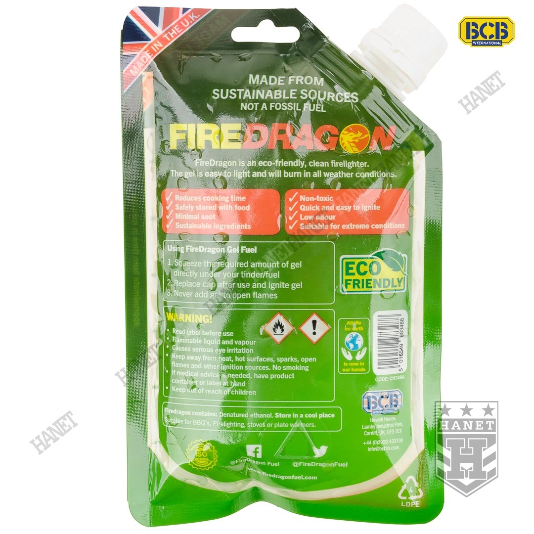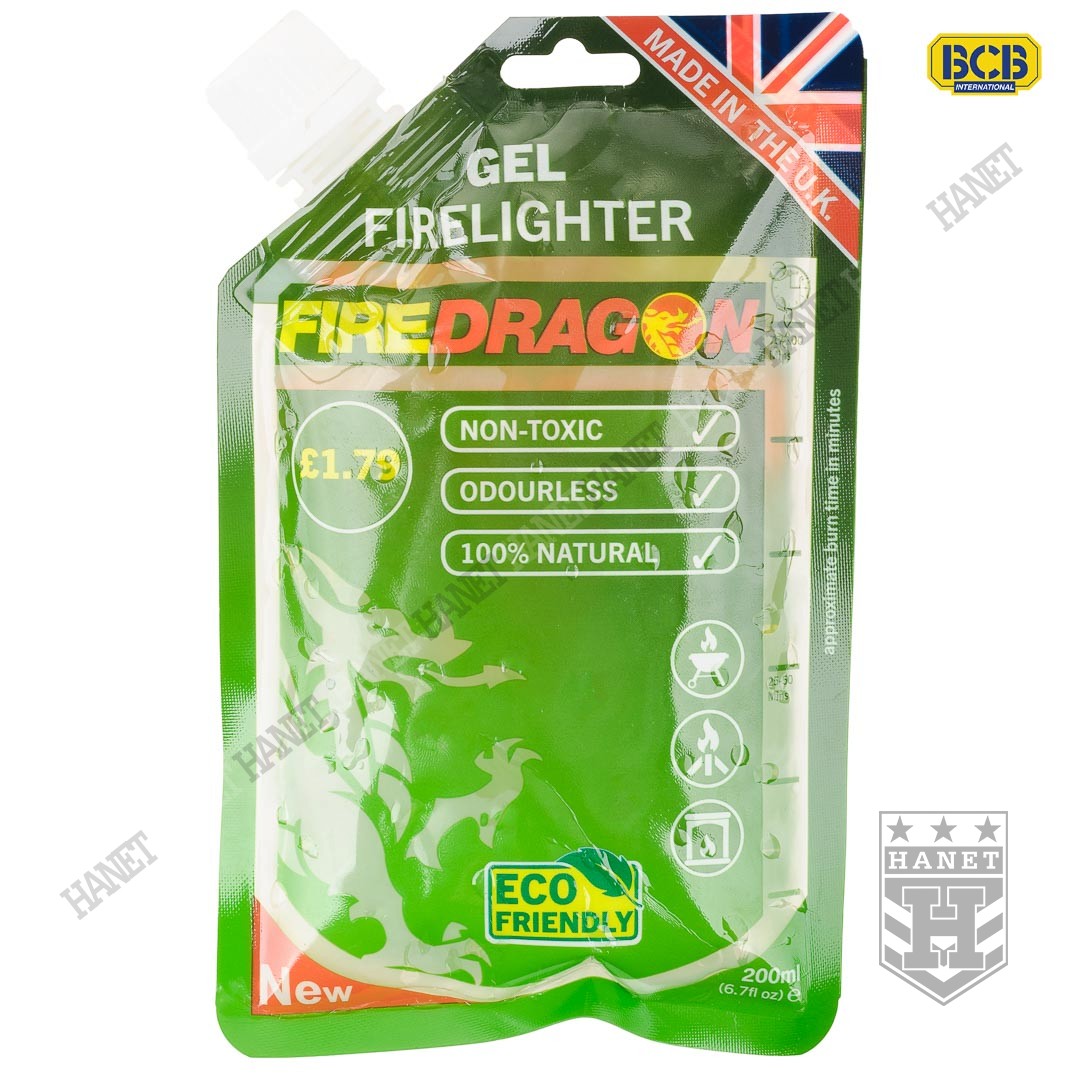 Paliwo turystyczne - piro żel do rozpalania. Armia Brytyjska zastępuje paliwo Green Fuel żelem FIRE DRAGON, które łatwiej się zapala i jest bardziej efektywne. Polecany miłośnikom survivalu, wspinaczki wysokogórskiej i turystyki. Doskonały podgrzewania posiłków w warunkach polowych. Polecany do rozpalania ognisk, nawet z mokrego drewna. Idealny do rozpalania grilla oraz kominka. Przystosowany do wykorzystywania w ekstremalnych warunkach, wiatru, mrozu i deszczu. Żel FIRE DRAGON jest bardzo kaloryczny, daje niezwykle dużo ciepła, a jednocześnie powolnie się spala. Znaczna gęstość i lepkość sprawia, że żel zostaje zawsze na właściwym miejscu - ułatwiając rozpalanie ognia.