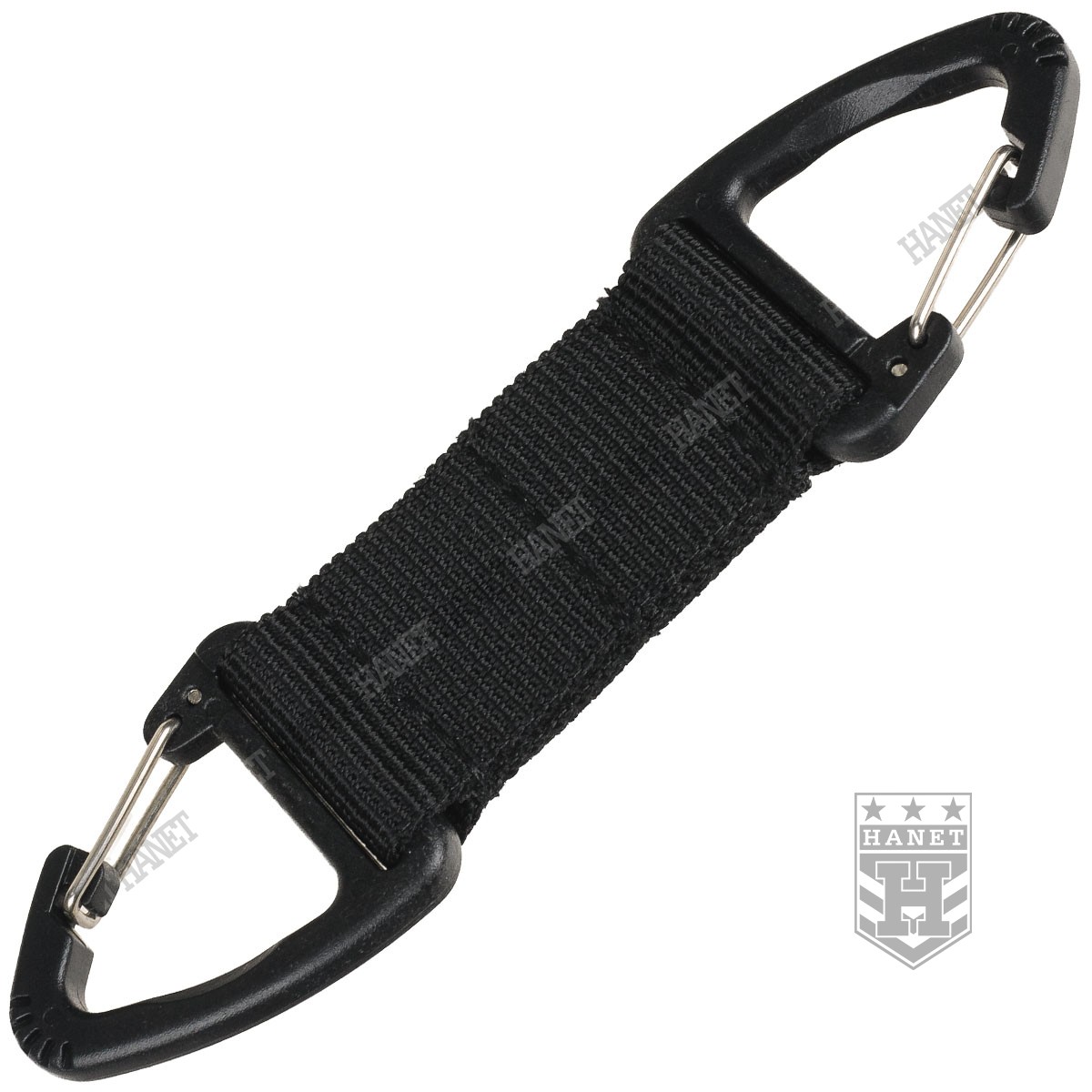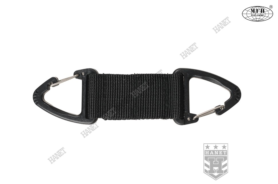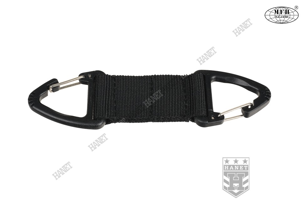 Para lekkich karabinków pomocniczych o specyfikacji militarnej. Produkt niemieckiej marki MFH® Int. Comp. Uniwersalne karabinki, których pierwowzorem są ekspresy używane we wspinaczce. Ekspresy alpinistyczne służą do asekuracji osoby wspinającej się, zauważono jednak, że po pomniejszeniu mogą mieć znacznie więcej zastosowań. Praktyczne karabinki zostały połączone taśmą parcianą. Są doskonałe do podczepiania części oporządzenia i wyposażenia lub jako smycz. Niezastąpione w życiu codziennym, na biwaku i w survivalu. Doskonałe do zaczepiania odciągów, troczenia noża, kluczy, latarek, itd. Możliwość mocowania na plecakach, kamizelkach lub wszędzie gdzie zajdzie się taka potrzeba. Karabinki są lekkie i bardzo wytrzymałe.