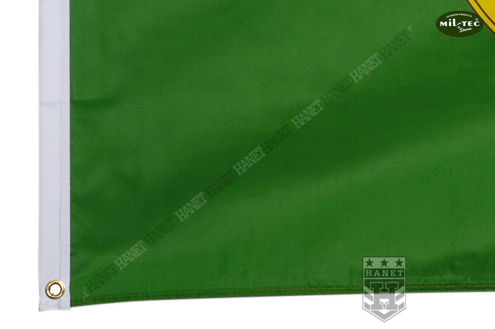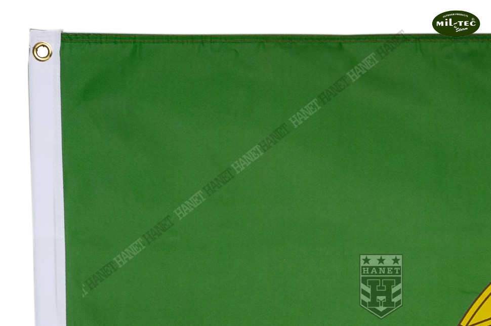Uniwersalna flaga na maszt lub drzewiec o standardowych wymiarach 90 x 150 cm. Najwyższa, niemiecka jakość wykonania i wyselekcjonowane materiały gwarantują długowieczność użytkowania, nawet w bardzo niekorzystnych warunkach silnego wiatru, częstych opadów i destrukcyjnego działania słońca. Wytrzymały materiał poliestrowy przeznaczony specjalnie do flag. Wszystkie krawędzie boczne z potrójną zakładką i dodatkowo przeszywane podwójnymi szwami - zabezpieczone przed pruciem materiału szarpanego przez wiatr. Barwy narodowe naniesione specjalną techniką drukarską, kolory nie płowieją, flaga zachowuje pożądany wygląd. Lekkość tkaniny ułatwia łopotanie flagi na wietrze. Do poliestru nie przywiera brud i łatwo go doprać, jest szybkoschnący. Dwa nierdzewne, miedziane oczka do montażu na maszcie lub do drzewca, gwarantują solidne zaczepienie. Krawędź flagi na której przynitowane są oczka wzmocniony dwiema warstwami grubego materiału. Dwustronna, na rewersie lustrzane odbicie awersu.