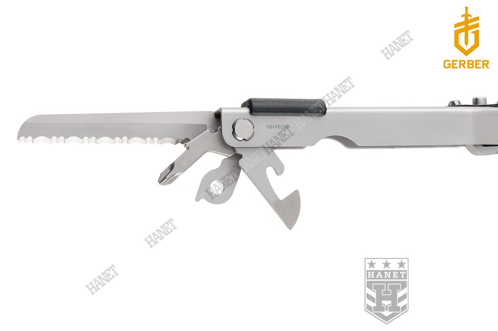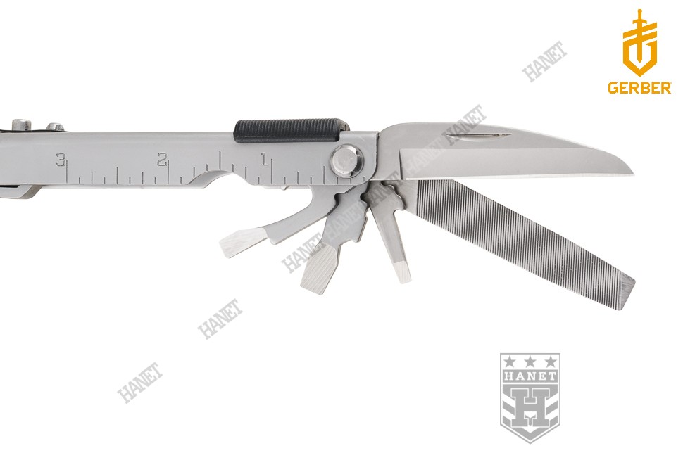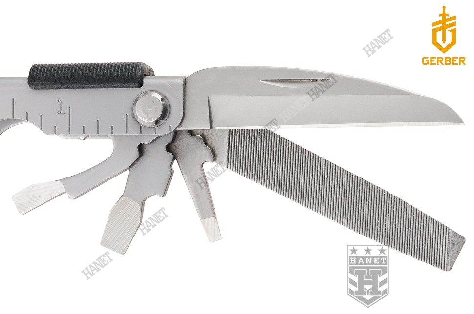 Uzupełnieniem funkcji są narzędzia chowane w szkielecie (rękojeściach). Ostry i precyzyjny nożyk z klingą Modern Sheepsfoot, ze spiczastym czubkiem i płaską krawędzią - idealny do obróbki drewna, siekania, skrobania, obierania, cięcia warzyw i owoców, folii i otwierania kartonów. Ostrze ząbkowane (SE) jest doskonałe do cięcia linek, taśm, tkanin, krojenia pieczywa i piłowania drewna. Długi pilnik z dwoma gradacjami, dobry do paznokci lub dopasowania do siebie elementów metalowych, drewnianych oraz z tworzywa. Śrubokręt krzyżakowy (PH1) z funkcją wiercenia w miękkich materiałach. Duży śrubokręt płaski (r. 3) i narzędzie do podważania i skrobania w jednym. Wąski śrubokręt płaski (r. 1) pełniący rolę szpikulca / szydła. Otwieracz do kapsli ze zintegrowanym śrubokrętem płaskim (r.2). Otwieracz do puszek i konserw. Rozkładane oczko na smycz lub pętlę nadgarstkową, które nadaje się do gięcia drutu. Na rękojeści naniesiono miarkę calową i centymetrową.