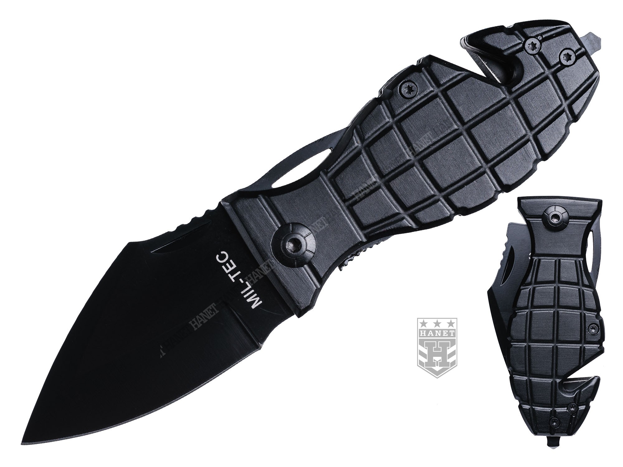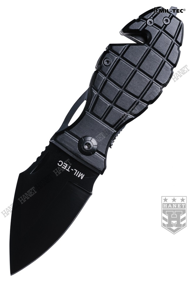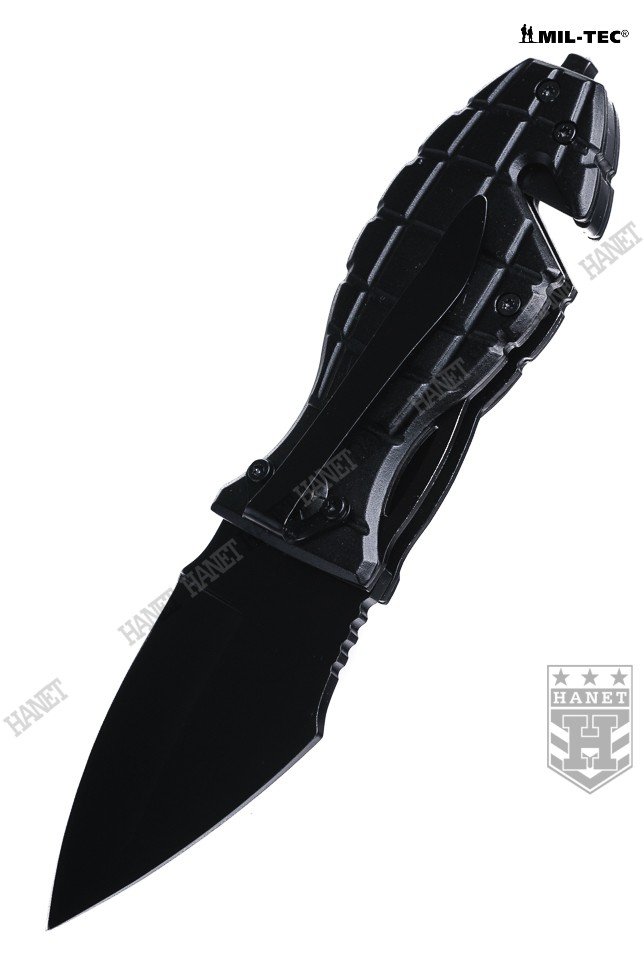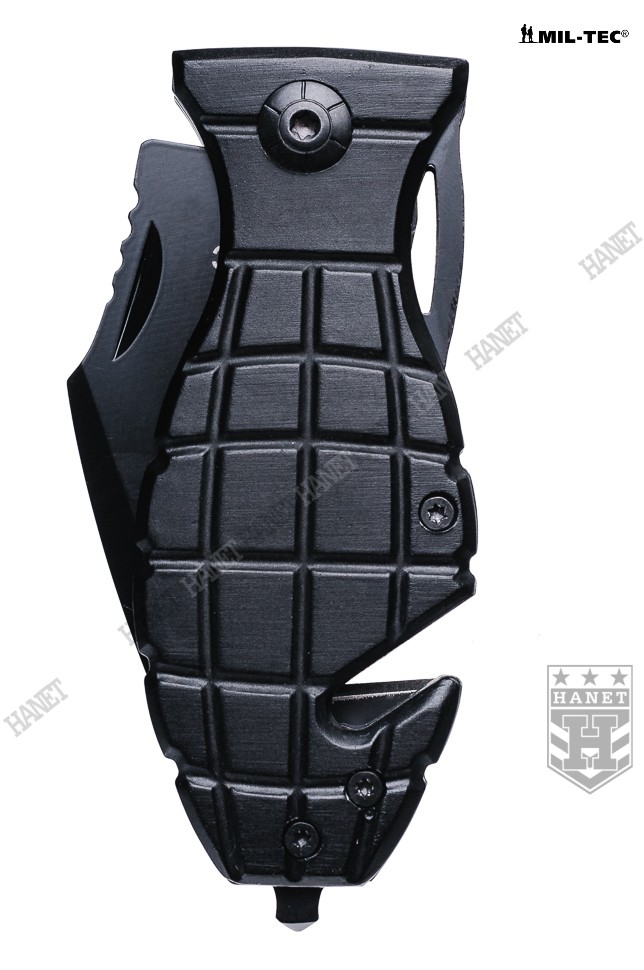 Lekki nóż kieszonkowy o specyfikacji militarnej. Unikatowy design - rękojeść nawiązująca wyglądem do granatu. Bardzo zwarta i solidna konstrukcja, wytrzymałe ostrze o ergonomicznym kształcie, ostre i precyzyjne. Doskonały w celach użytkowych lub jako ciekawy gadżet. Głownia typu SPEAR POINT wykonana ze stali nierdzewnej 440 o grubości 2,5 mm. Ostrze gładkie szlifowane pod specjalnym kątem gwarantującym ostrość przy jednoczesnej odporności na tępienie. Czarna matowa powłoka redukuje do minimum refleksy świetlne i dodatkowo zabezpiecza przed korozją. Ergonomiczna rękojeść na stalowym szkielecie wykończona okładkami z aluminium lotniczego. Profil i liczne nacięcia rękojeści zapewniają dobrą przyczepność dłoni, pewny chwyt i wysoki komfort pracy. Zakończenie rękojeści uzbrojone w zbijak do szyb i ostry nóż do szybkiego cięcia pasów bezpieczeństwa, kabli oraz linek. Sprawdzona blokada LINER LOCK zabezpiecza głownie przed mimowolnym złożeniem lub rozłożeniem, chodzi gładko i trzyma pewnie. Solidny klips mocujący do pasa o długości 61 mm z możliwością odkręcenia. Wcięcie na głowni ułatwiające rozkładanie noża. Grzbiet głowni ze szlifem antypoślizgowym pod kciuk. Nóż skręcany za pomocą śrub gwiazdkowych, możliwość rozłożenia w celu wyczyszczenia, możliwość regulacji oporu otwierania. W komplecie oryginalne pudełko.