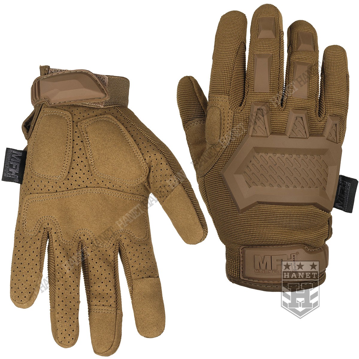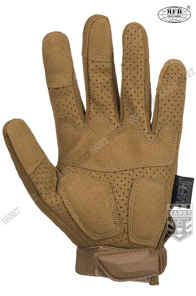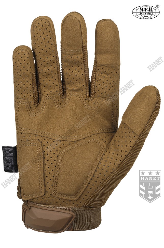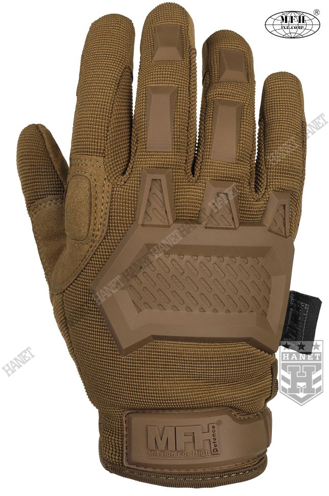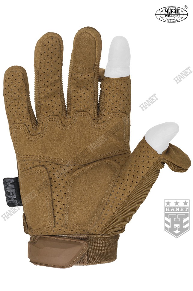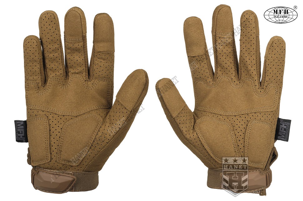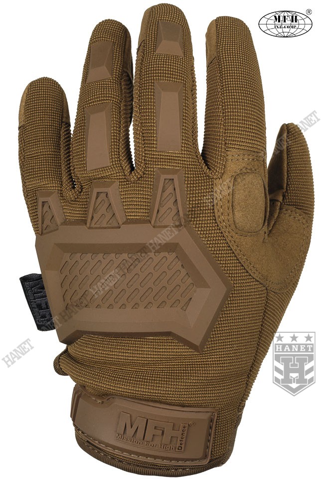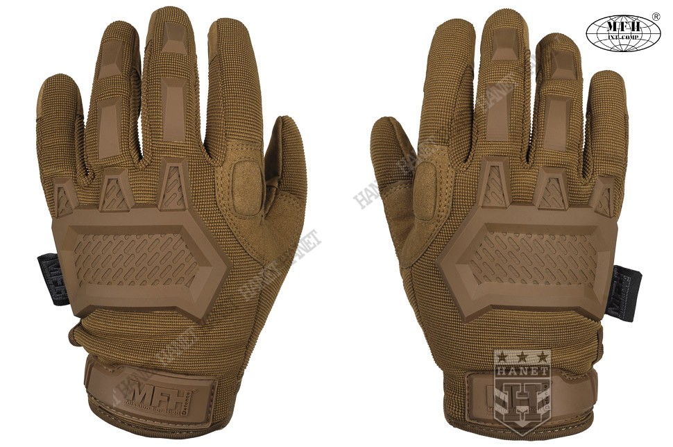 Zaawansowane rękawice taktyczne III generacji. Produkt niemieckiej marki MFH®. Specyfikacja militarna gwarantuje bezkompromisowe rozwiązania. Nowoczesna konstrukcja przystosowania do walki wręcz, działań bojowych, do taktyki czarnej i zielonej. Rękawice wykonane z solidnych, nowoczesnych materiałów jak nylon, poliamid, poliuretan i szlachetna skóra syntetyczna. Zapewniają dobry chwyt i ochronę dłoni, przy jednoczesnym wysokim komforcie. Posiadają otwierany kciuki i palec na spust dla ułatwienia obsługi elektroniki, osłonę kostek, ochronę paliczków i wzmocnienia chwytu. Rękawice są przeznaczone do używania w wysokich i umiarkowanych temperaturach.