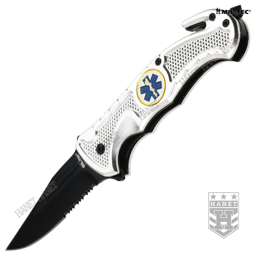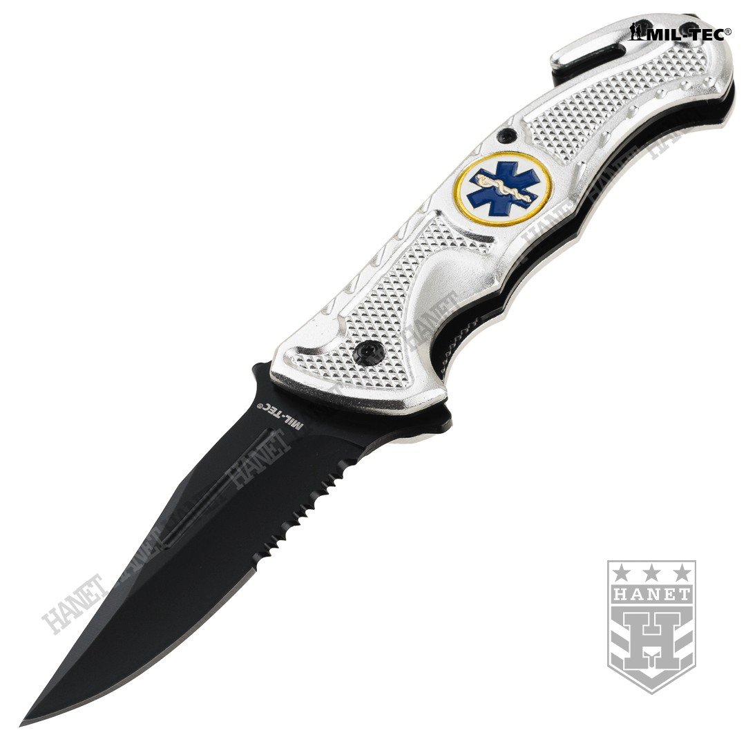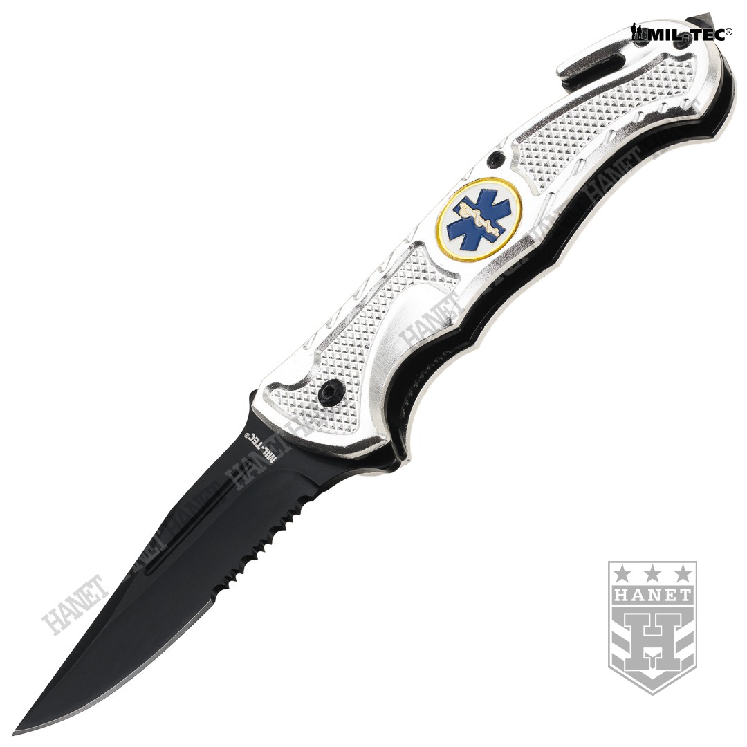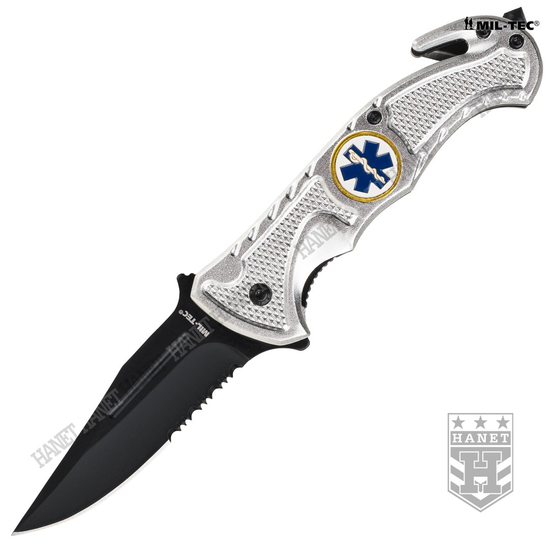 Kompaktowy nóż ratowniczy ze sprężynowym systemem otwarcia. Nowoczesna i zwarta konstrukcja, precyzyjne wykonanie niemieckiej firmy Mil-Tec®. Model zaprojektowany zgodnie ze specyfikacją pracy ratowników medycznych. Niezbędne wyposażenie nowoczesnego ratownika. Kompaktowe wymiary, niska waga i praktyczny klips mocując ułatwiają transport. Zakończenie rękojeści uzbrojone w zbijak do szyb i ostry nóż do szybkiego cięcia pasów bezpieczeństwa, kabli oraz linek. Innowacyjny system szybkiego otwarcia wykorzystujący sprężynę - pozwala na bardzo sprawne i instynktowne rozłożenie noża jedną ręką. Wyzwolenie sprężyny następuje w wyniku działania minimalnej siły. Cypel na grzbiecie pozwala na rozłożenie noża jednym palcem, trąc nim o ubranie lub zahaczając o jakiś przedmiot.