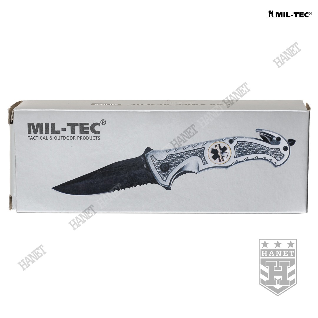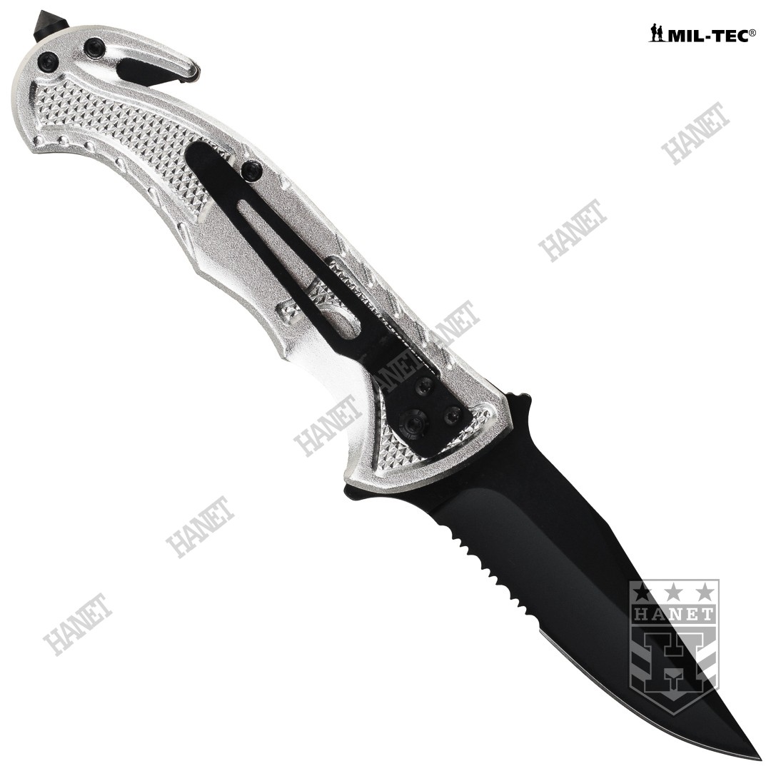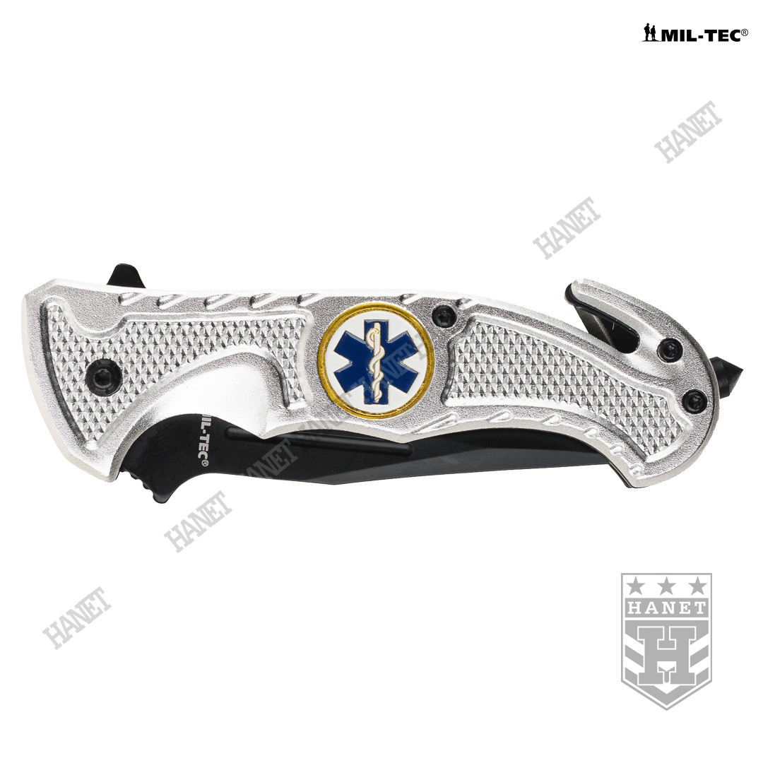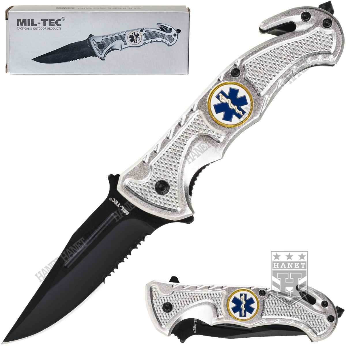 Kompaktowy nóż ratowniczy ze sprężynowym systemem otwarcia. Nowoczesna i zwarta konstrukcja, precyzyjne wykonanie niemieckiej firmy Mil-Tec®. Model zaprojektowany zgodnie ze specyfikacją pracy ratowników medycznych. Niezbędne wyposażenie nowoczesnego ratownika. Kompaktowe wymiary, niska waga i praktyczny klips mocując ułatwiają transport. Zakończenie rękojeści uzbrojone w zbijak do szyb i ostry nóż do szybkiego cięcia pasów bezpieczeństwa, kabli oraz linek. Innowacyjny system szybkiego otwarcia wykorzystujący sprężynę - pozwala na bardzo sprawne i instynktowne rozłożenie noża jedną ręką. Wyzwolenie sprężyny następuje w wyniku działania minimalnej siły. Cypel na grzbiecie pozwala na rozłożenie noża jednym palcem, trąc nim o ubranie lub zahaczając o jakiś przedmiot.
