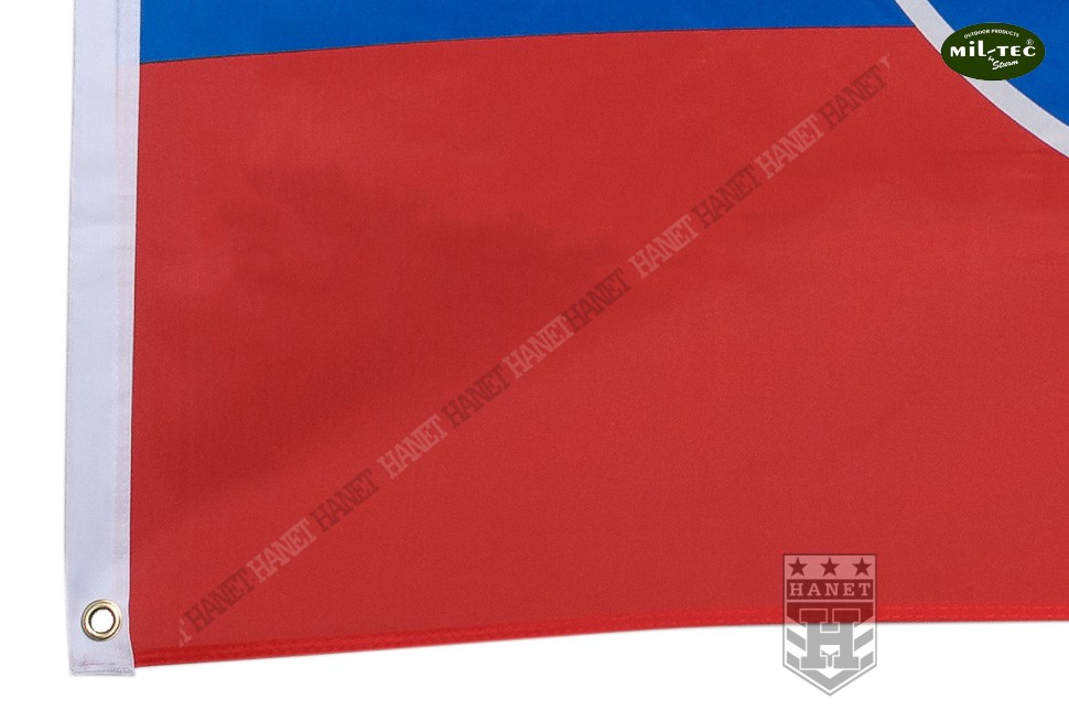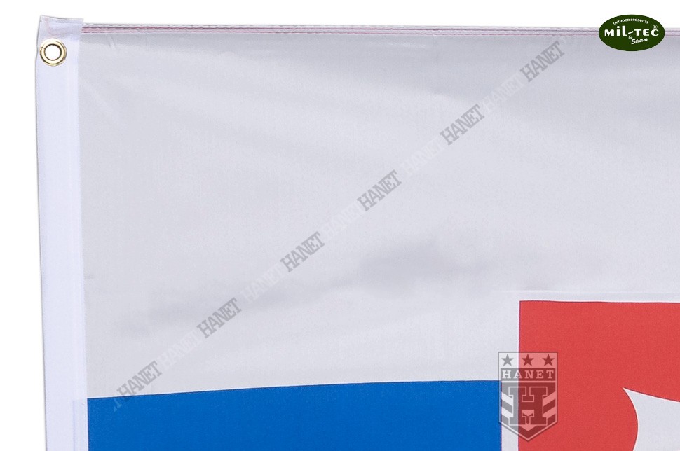 Uniwersalna flaga na maszt lub drzewiec o standardowych wymiarach 90 x 150 cm. Najwyższa, niemiecka jakość wykonania i wyselekcjonowane materiały gwarantują długowieczność użytkowania, nawet w bardzo niekorzystnych warunkach silnego wiatru, częstych opadów i destrukcyjnego działania słońca. Wytrzymały materiał poliestrowy przeznaczony specjalnie do flag. Wszystkie krawędzie boczne z potrójną zakładką i dodatkowo przeszywane podwójnymi szwami - zabezpieczone przed pruciem materiału szarpanego przez wiatr. Barwy narodowe naniesione specjalną techniką drukarską, kolory nie płowieją, flaga zachowuje pożądany wygląd. Lekkość tkaniny ułatwia łopotanie flagi na wietrze. Do poliestru nie przywiera brud i łatwo go doprać, jest szybkoschnący. Dwa nierdzewne, miedziane oczka do montażu na maszcie lub do drzewca, gwarantują solidne zaczepienie. Krawędź flagi na której przynitowane są oczka wzmocniony dwiema warstwami grubego materiału. Dwustronna, na rewersie lustrzane odbicie awersu.