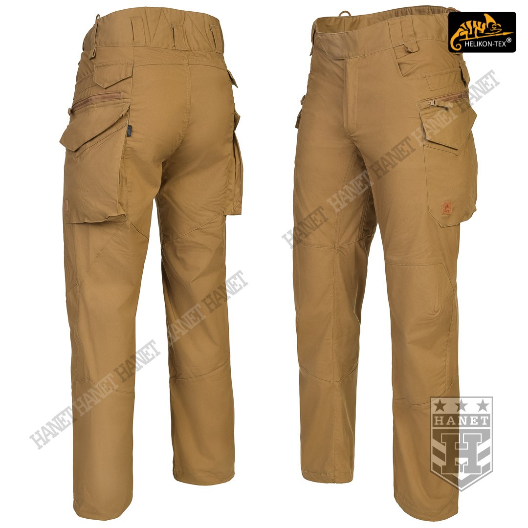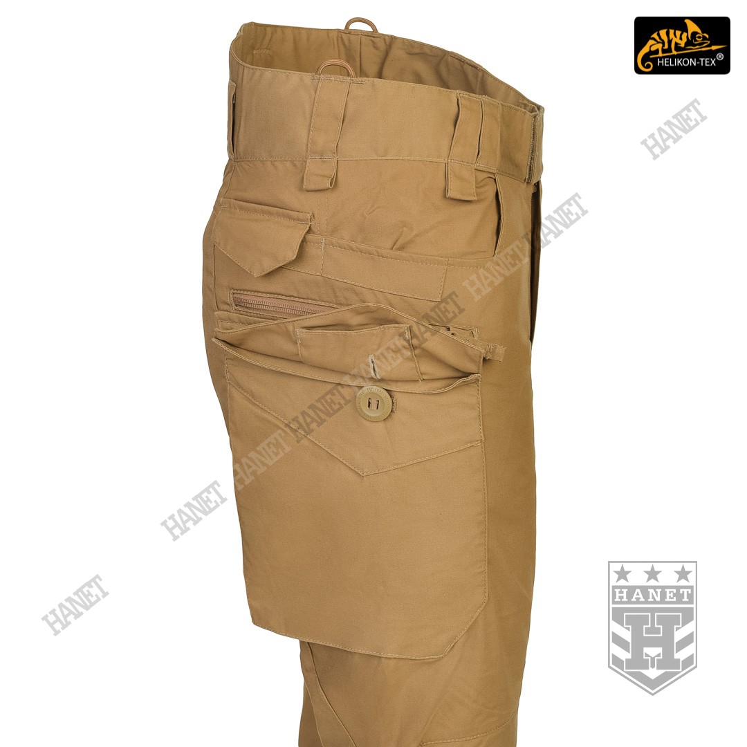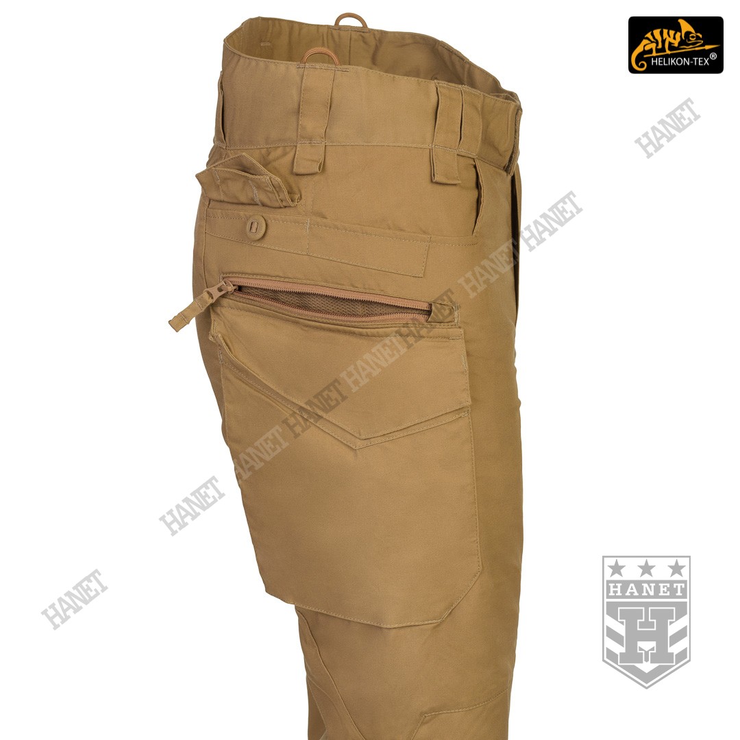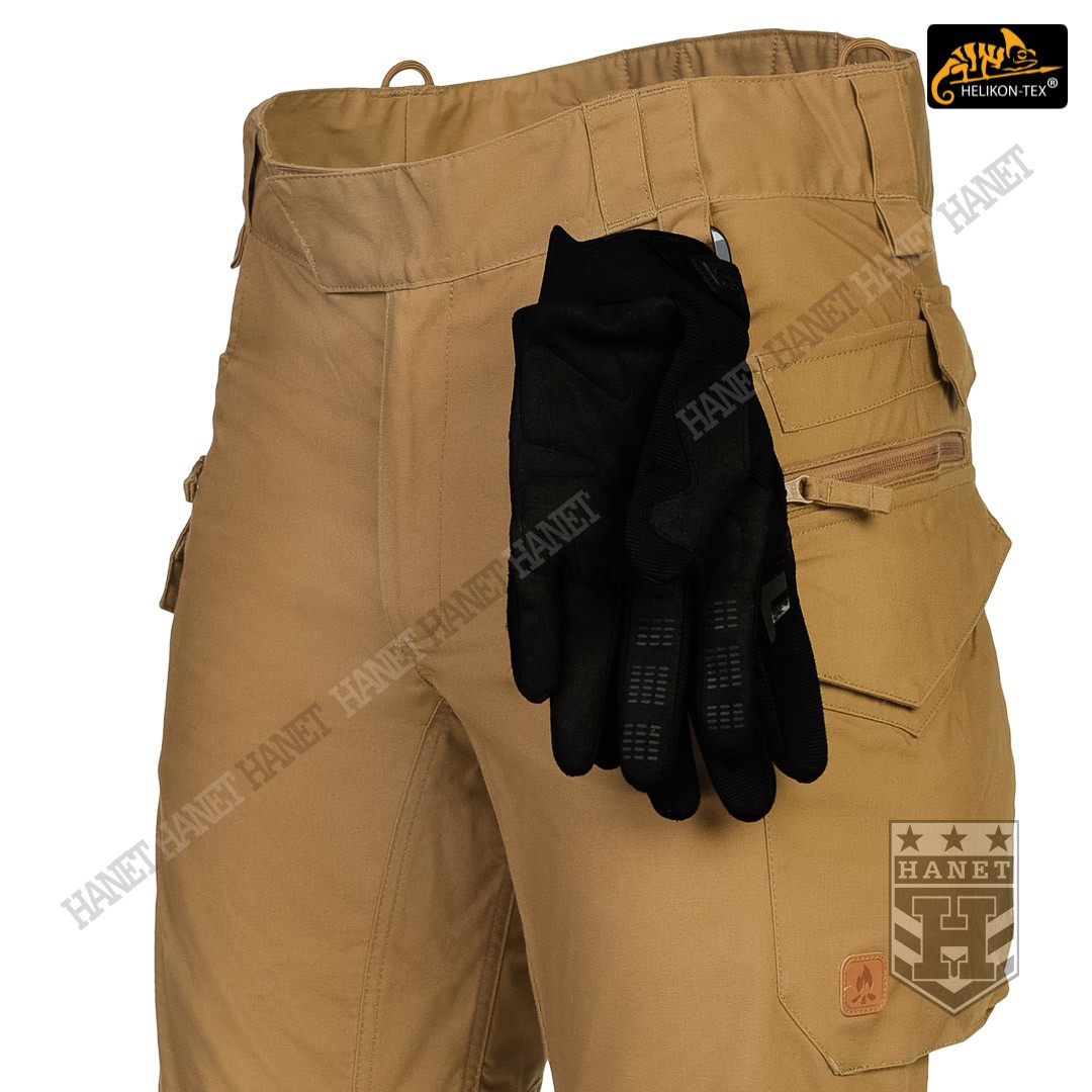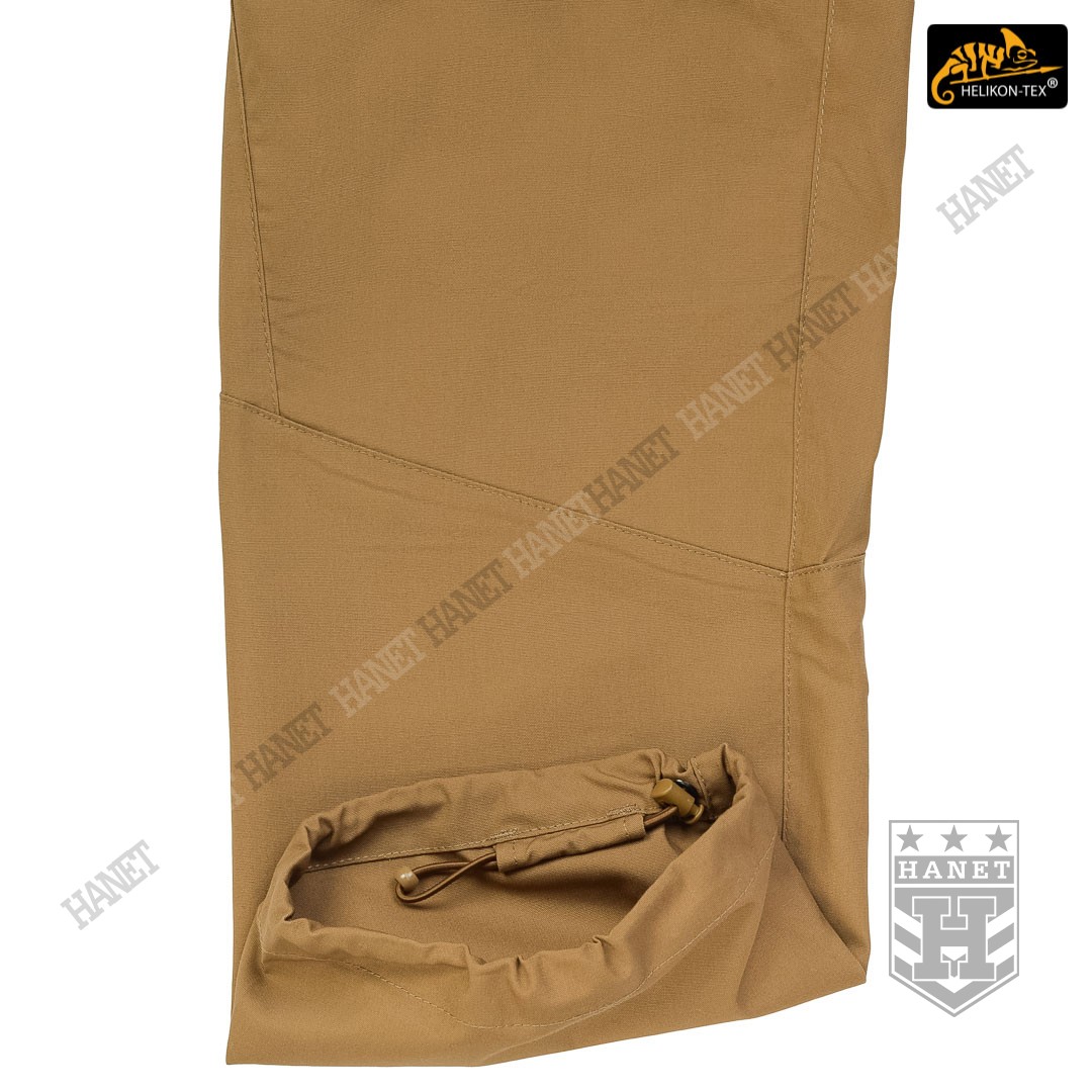 Uniwersalny krój gwarantuje praktyczność, komfort i dobry wygląd. Proste nogawki i płaskie kieszenie nie kojarzą się z typowymi bojówkami, dzięki czemu spodnie są doskonałe do noszenia na co dzień. Długi rozporek na zamek YKK®, kryty patką. Zapinane w pasie na patkę z rzepem, która umożliwia dostosowanie obwodu do anatomii użytkownika lub podczas noszenia bielizny ocieplającej pod spodniami. Pas i szlufki zostały uszyte z podwójnej warstwy materiału dla wzmocnienia. Spodnie posiadają przedłużenie z tyłu chroniące okolice krzyża i nerek podczas schylania oraz siedzenia. W przedłużonej części na plecach wszyto miękkie wypełnienie z oddychającej siatki dystansowej MESH 3D, która pozwala zachować komfort termiczny i komfort użytkowania wraz ze sztywnymi pasami. Gęsto rozmieszczone szlufki na pas o szerokości 50mm. Pod szlufkami bocznymi i przednimi doszyto pętle do troczenia podręcznych przedmiotów za pomocą linki lub karabinków (np. grimlock). Klin wszyty w kroku gwarantuje swobodę ruchów podczas wysokiego podnoszenia nóg. Pętle z linki Paracord wszyte na bokach służą do mocowania szelek (Helikon Forester Suspenders). U dołu nogawek znajdują się ściągacze pozwalające na zaciśnięcie nogawki na bucie. Ściągacze wykonane z elastycznej gumy typu Shock Cord, wyposażone w stoper do szybkiej regulacji oraz specjalny tunel zabezpieczający wolny końca ściągacza przed wystawaniem z nogawki.