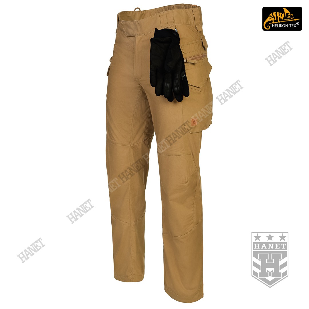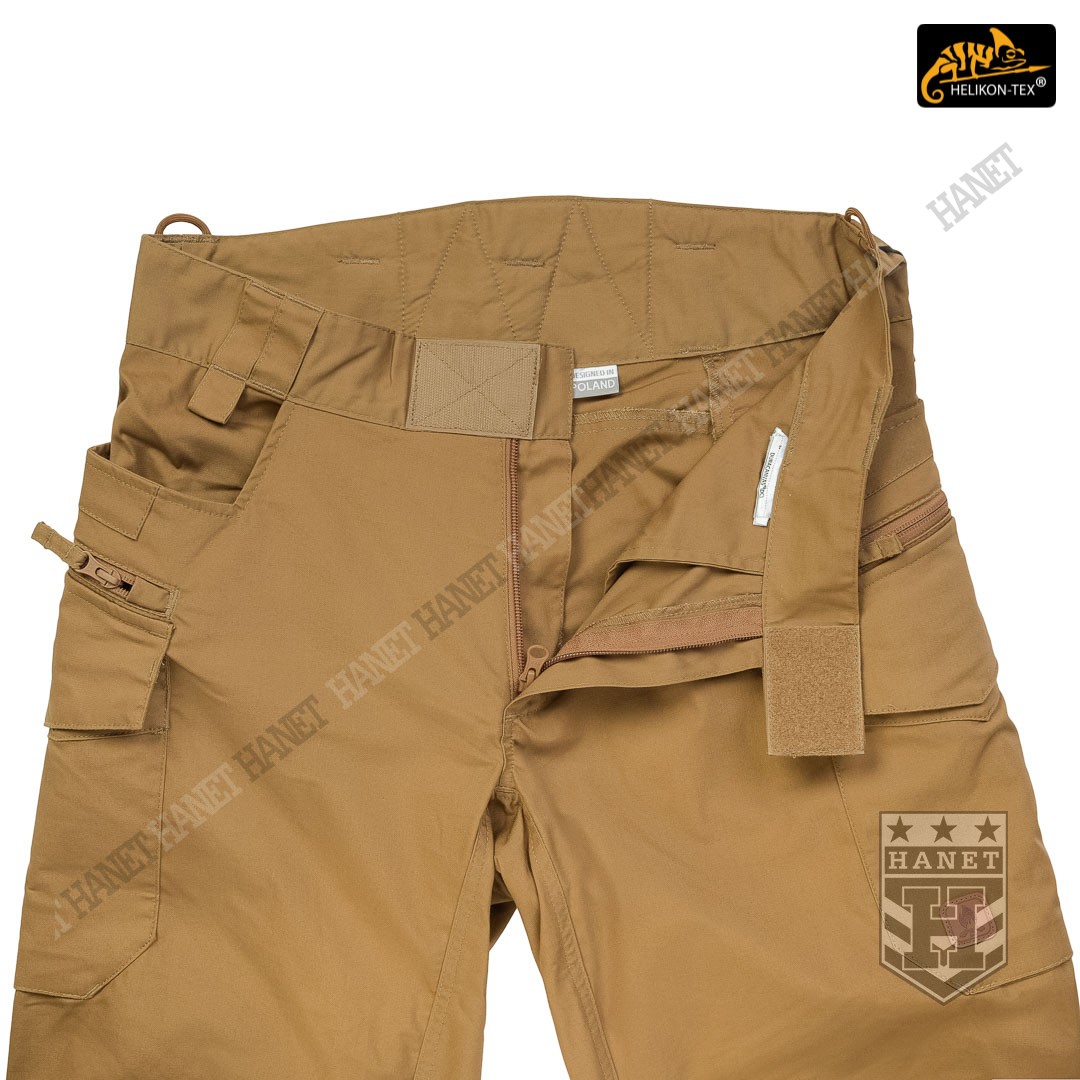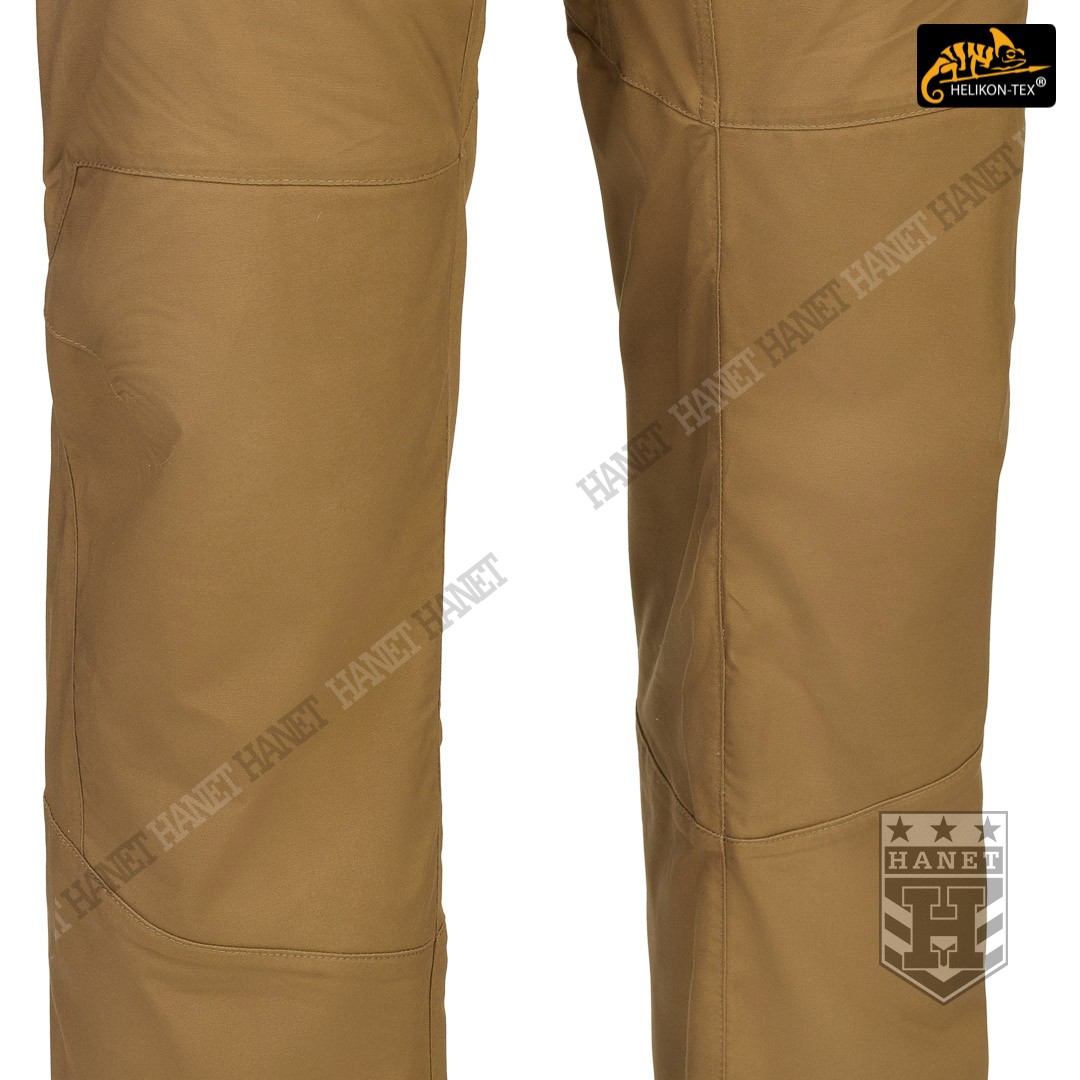 Spodnie w miejscach najbardziej narażonym na zużycie (siedzenie i kolana) zostały wzmocnione dodatkową warstwą materiału. Obszycia kolan są wyposażone w anatomiczne zaszewki, które dają dodatkową wygodę oraz chronią przed wypychaniem materiału. Wewnętrzne kieszenie na wkłady piankowe (Helikon Low Profile Pad) - ochraniacze kolan. Rozporek i kieszenie boczne zapinane na mocne zamki japońskiej marki YKK®. Suwaki kieszeni bocznych zostały wyposażone w tasiemki upraszczające ich obsługę. Solidne szwy, wielokrotne w newralgicznych miejscach. Krawędzie materiału zabezpieczone ściegiem owerlok. Wewnętrzne wzmocnienia z taśmy nylonowej w punktach najbardziej narażonych na rozerwanie.