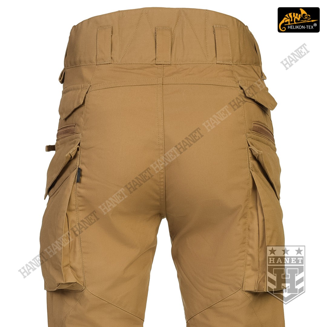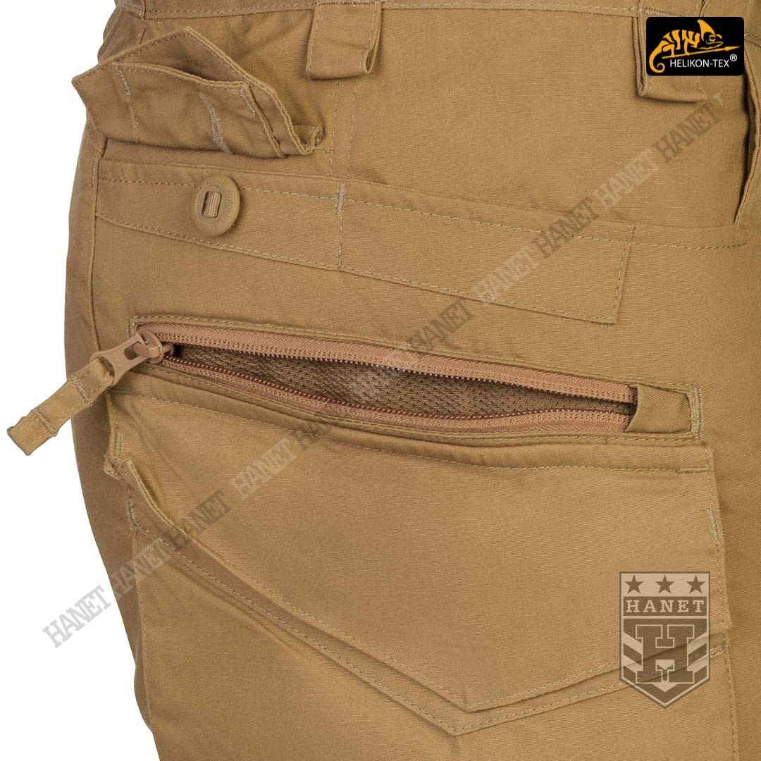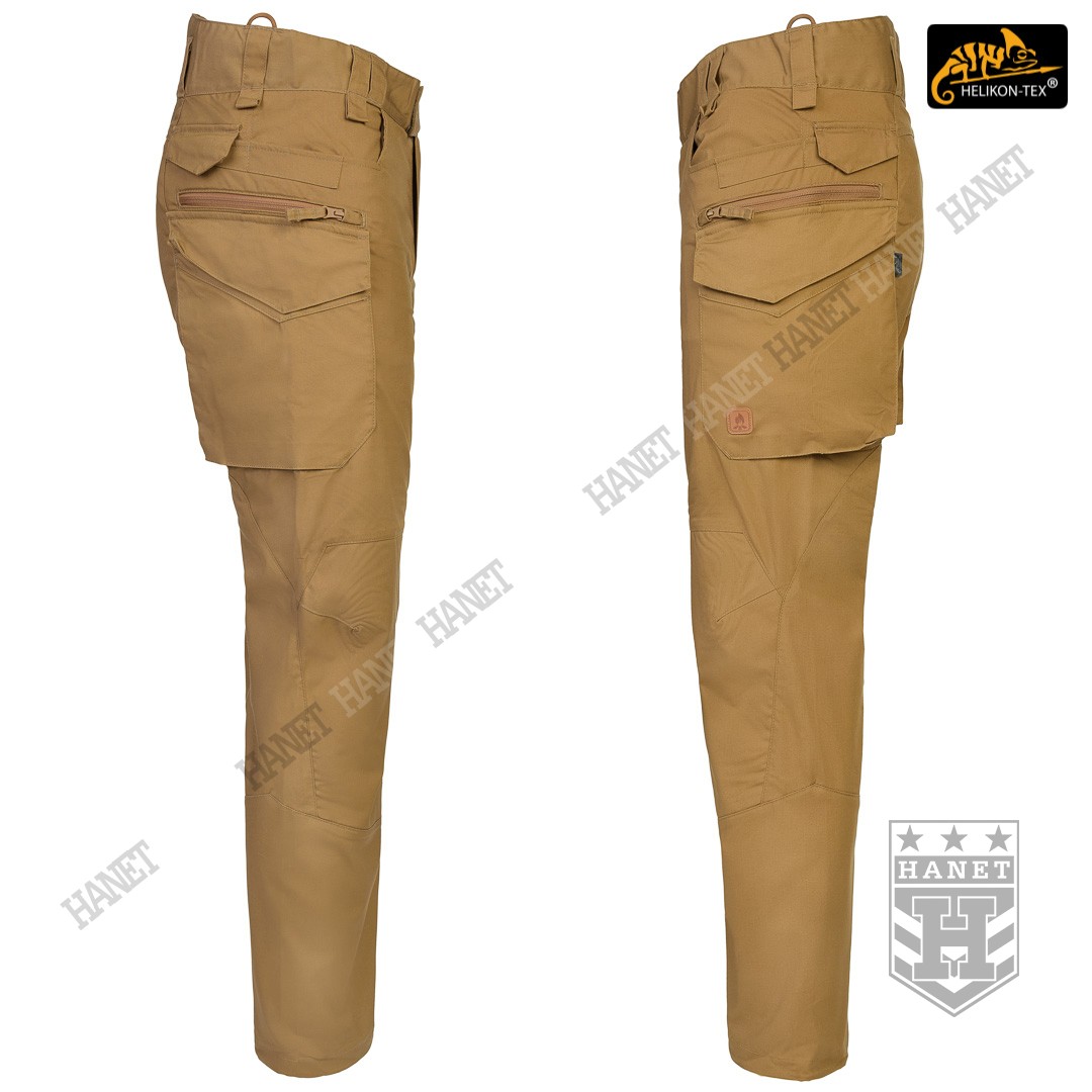 Spodnie w miejscach najbardziej narażonym na zużycie (siedzenie i kolana) zostały wzmocnione dodatkową warstwą materiału. Obszycia kolan są wyposażone w anatomiczne zaszewki, które dają dodatkową wygodę oraz chronią przed wypychaniem materiału. Wewnętrzne kieszenie na wkłady piankowe (Helikon Low Profile Pad) - ochraniacze kolan. Rozporek i kieszenie boczne zapinane na mocne zamki japońskiej marki YKK®. Suwaki kieszeni bocznych zostały wyposażone w tasiemki upraszczające ich obsługę. Solidne szwy, wielokrotne w newralgicznych miejscach. Krawędzie materiału zabezpieczone ściegiem owerlok. Wewnętrzne wzmocnienia z taśmy nylonowej w punktach najbardziej narażonych na rozerwanie.