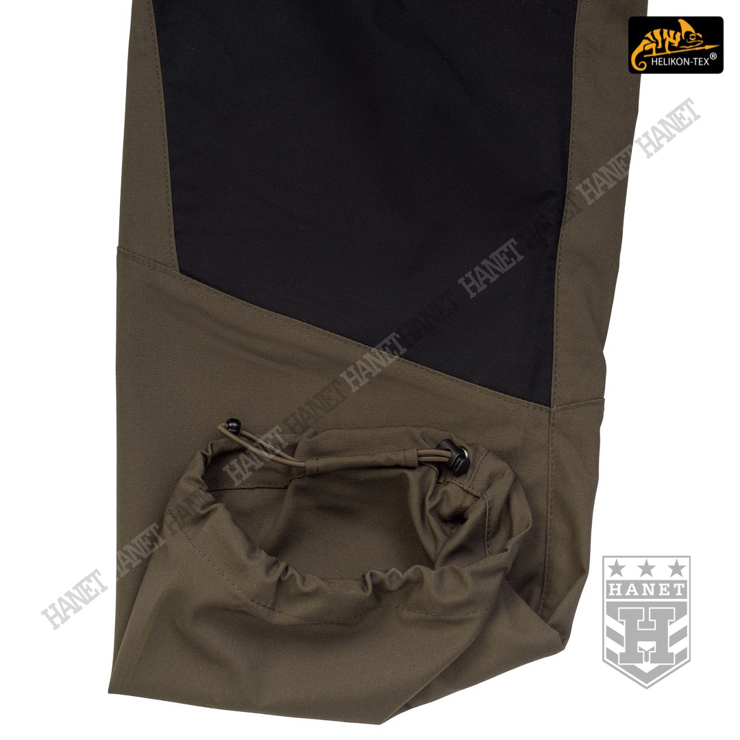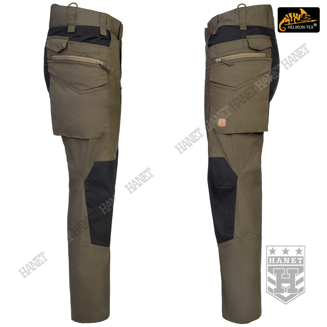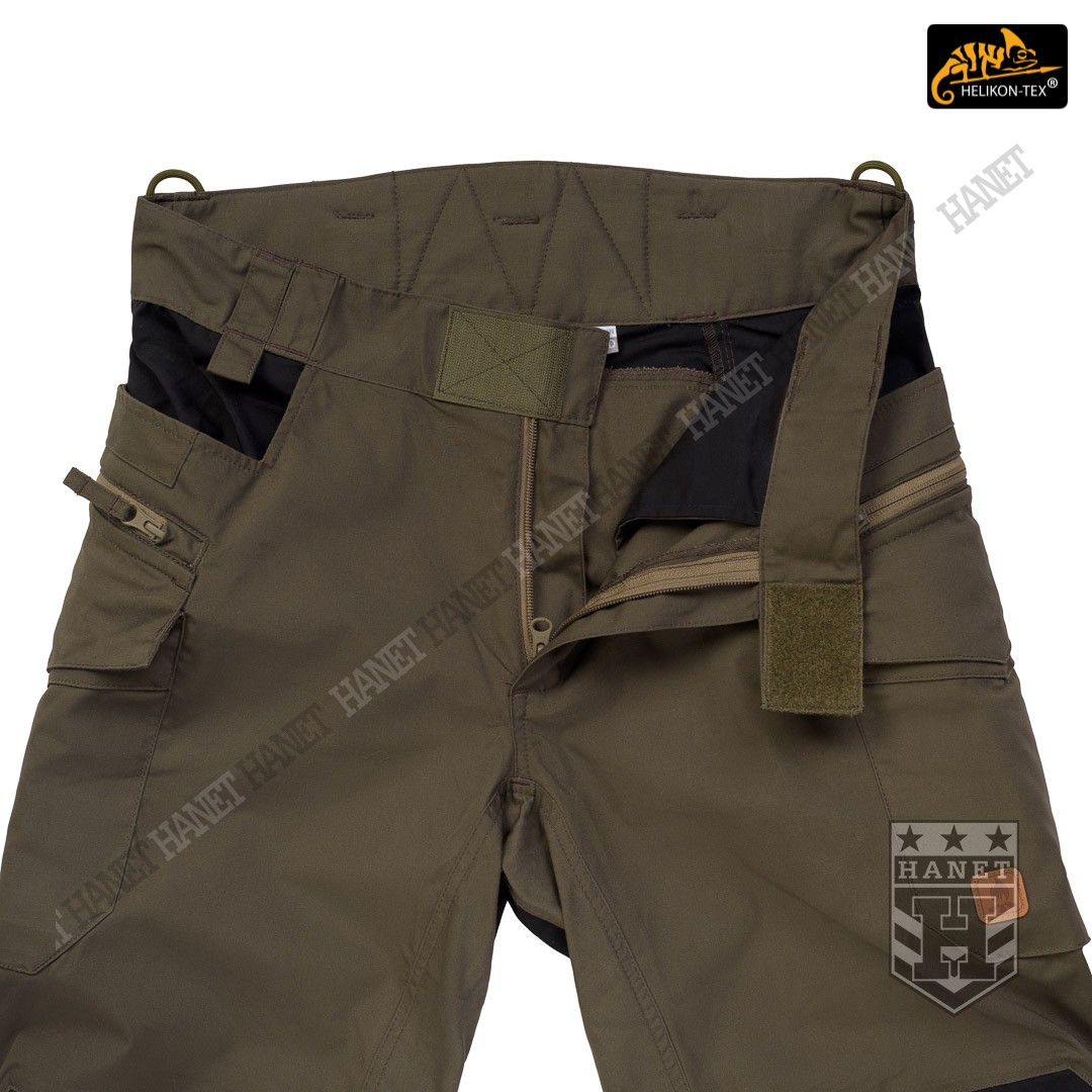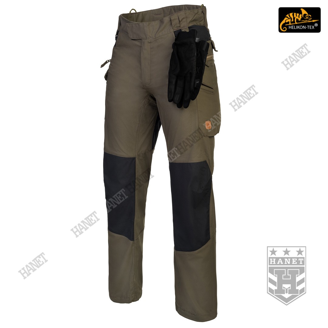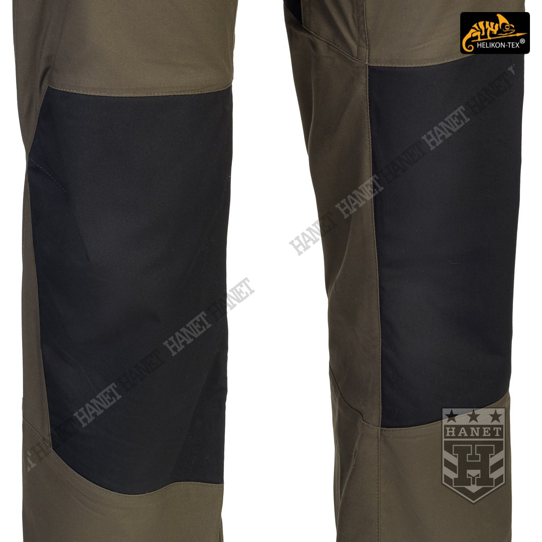 Spodnie w miejscach najbardziej narażonym na zużycie (siedzenie i kolana) zostały wzmocnione dodatkową warstwą materiału w ciemniejszym kolorze, który dodatkowo maskuje zabrudzenia. Obszycia kolan są wyposażone w anatomiczne zaszewki, które dają dodatkową wygodę oraz chronią przed wypychaniem materiału. Wewnętrzne kieszenie na wkłady piankowe (Helikon Low Profile Pad) - ochraniacze kolan. Rozporek i kieszenie boczne zapinane na mocne zamki japońskiej marki YKK®. Suwaki kieszeni bocznych zostały wyposażone w tasiemki upraszczające ich obsługę. Solidne szwy, wielokrotne w newralgicznych miejscach. Krawędzie materiału zabezpieczone ściegiem owerlok. Wewnętrzne wzmocnienia z taśmy nylonowej w punktach najbardziej narażonych na rozerwanie.
