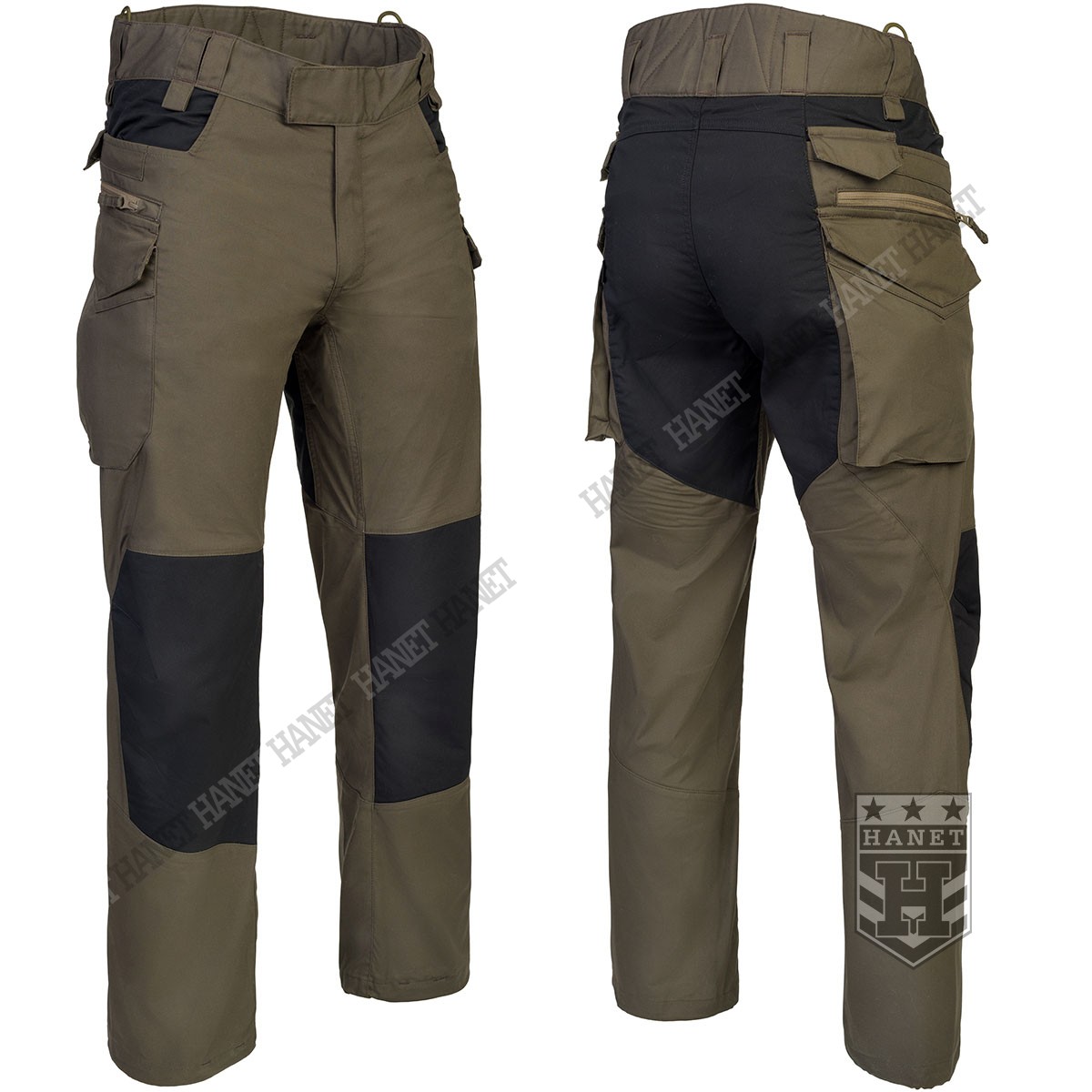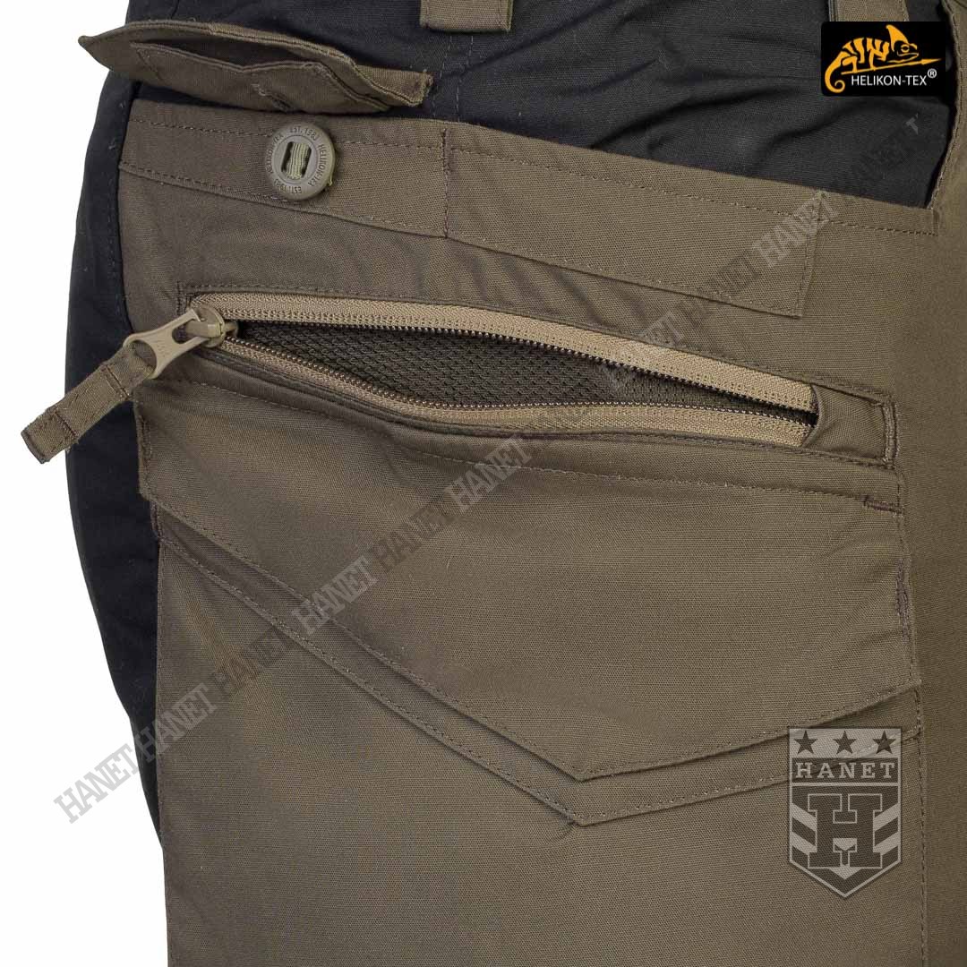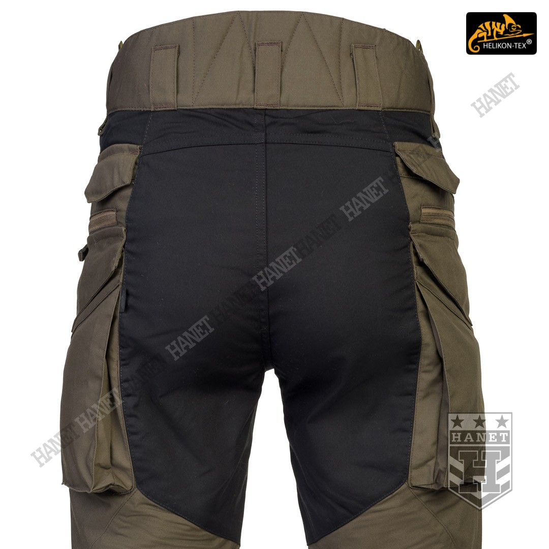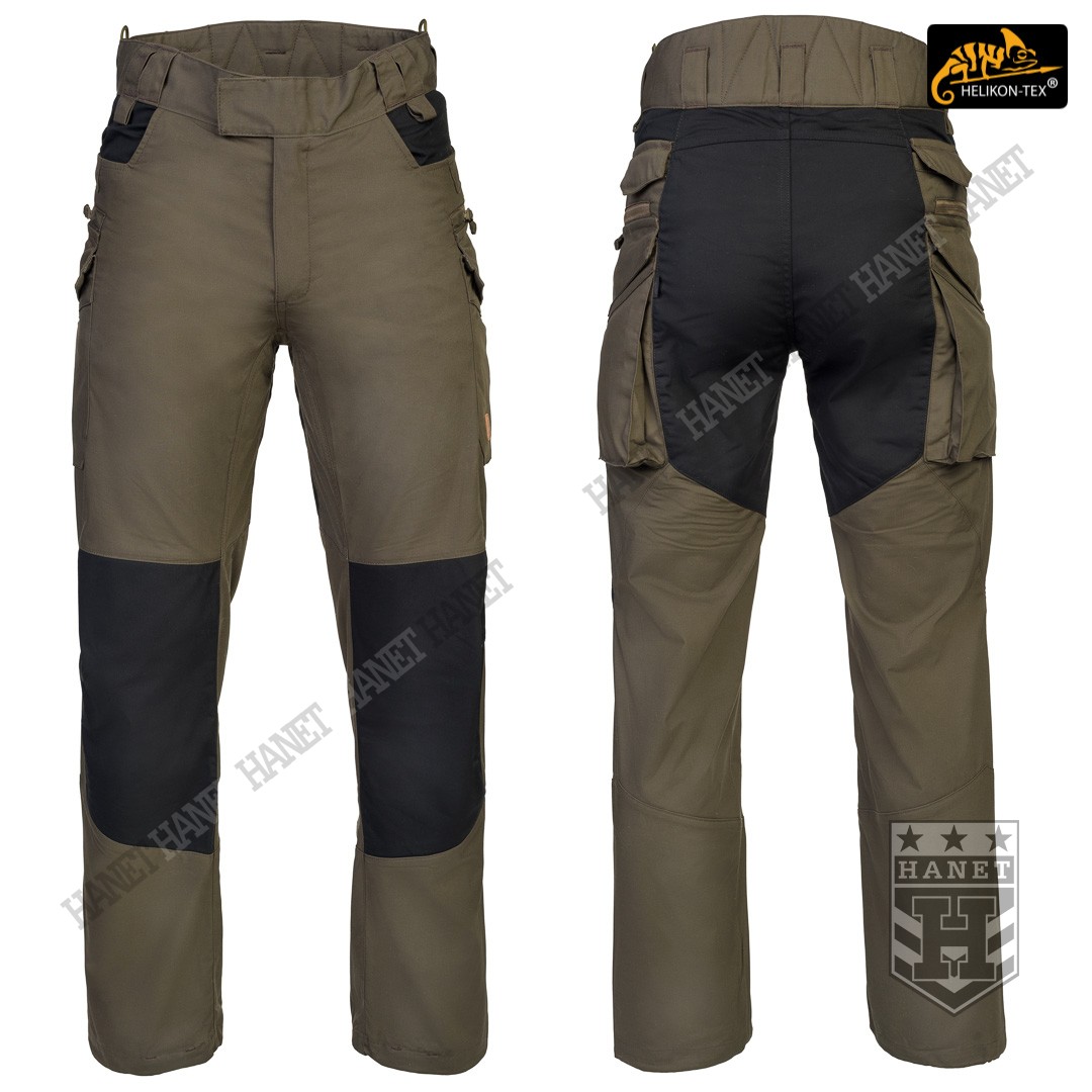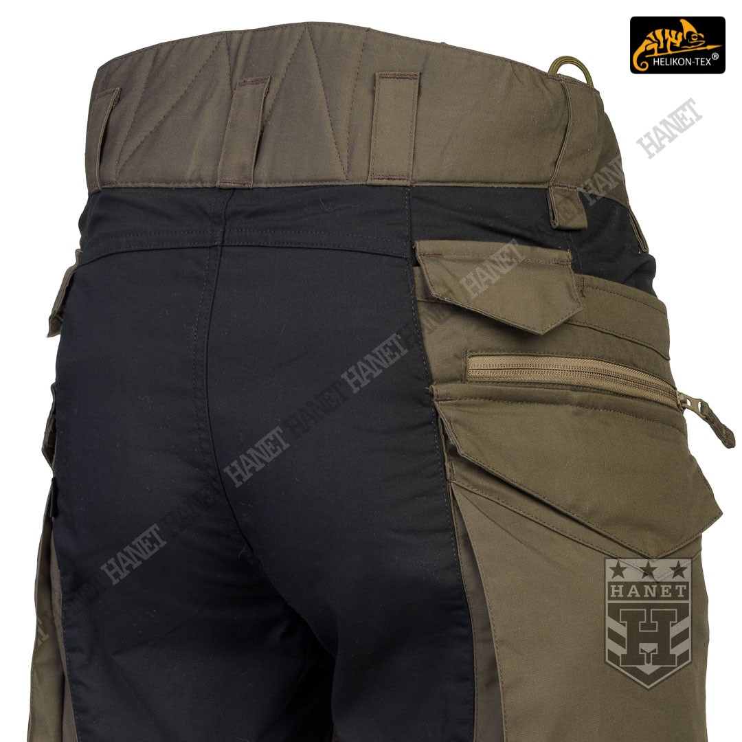 Spodnie w miejscach najbardziej narażonym na zużycie (siedzenie i kolana) zostały wzmocnione dodatkową warstwą materiału w ciemniejszym kolorze, który dodatkowo maskuje zabrudzenia. Obszycia kolan są wyposażone w anatomiczne zaszewki, które dają dodatkową wygodę oraz chronią przed wypychaniem materiału. Wewnętrzne kieszenie na wkłady piankowe (Helikon Low Profile Pad) - ochraniacze kolan. Rozporek i kieszenie boczne zapinane na mocne zamki japońskiej marki YKK®. Suwaki kieszeni bocznych zostały wyposażone w tasiemki upraszczające ich obsługę. Solidne szwy, wielokrotne w newralgicznych miejscach. Krawędzie materiału zabezpieczone ściegiem owerlok. Wewnętrzne wzmocnienia z taśmy nylonowej w punktach najbardziej narażonych na rozerwanie.