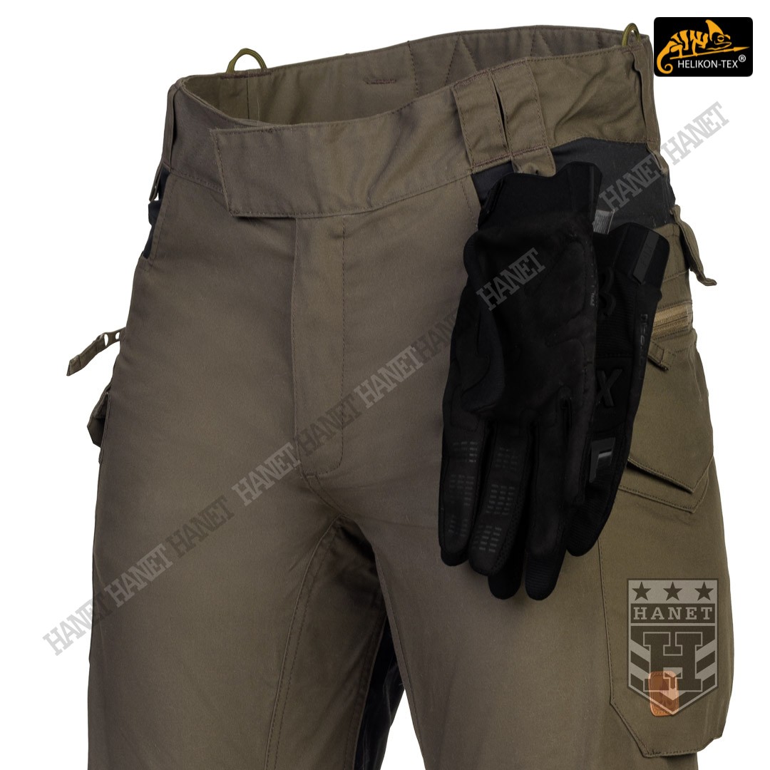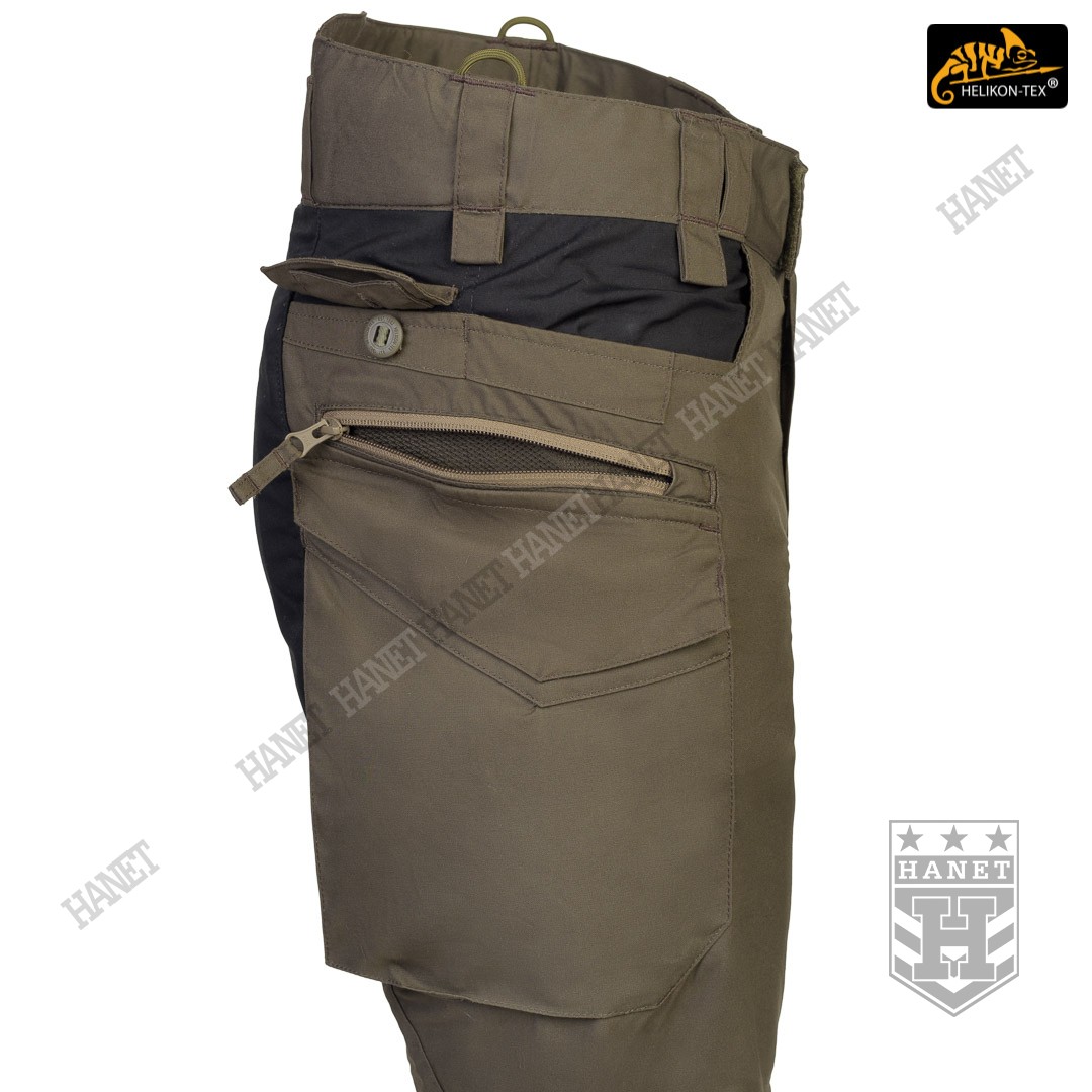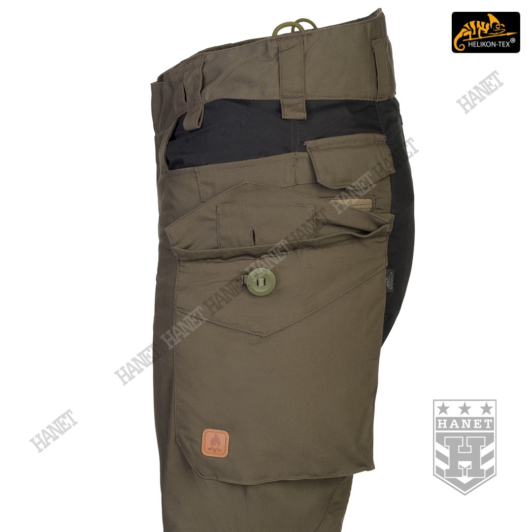 Uniwersalny krój gwarantuje praktyczność, komfort i dobry wygląd. Proste nogawki i płaskie kieszenie nie kojarzą się z typowymi bojówkami, dzięki czemu spodnie są doskonałe do noszenia na co dzień. Długi rozporek na zamek YKK®, kryty patką. Zapinane w pasie na patkę z rzepem, która umożliwia dostosowanie obwodu do anatomii użytkownika lub podczas noszenia bielizny ocieplającej pod spodniami. Pas i szlufki zostały uszyte z podwójnej warstwy materiału dla wzmocnienia. Spodnie posiadają przedłużenie z tyłu chroniące okolice krzyża i nerek podczas schylania oraz siedzenia. W przedłużonej części na plecach wszyto miękkie wypełnienie z oddychającej siatki dystansowej MESH 3D, która pozwala zachować komfort termiczny i komfort użytkowania wraz ze sztywnymi pasami. Gęsto rozmieszczone szlufki na pas o szerokości 50mm. Pod szlufkami bocznymi i przednimi doszyto pętle do troczenia podręcznych przedmiotów za pomocą linki lub karabinków (np. grimlock). Klin wszyty w kroku gwarantuje swobodę ruchów podczas wysokiego podnoszenia nóg. Pętle z linki Paracord wszyte na bokach służą do mocowania szelek (Helikon Forester Suspenders). U dołu nogawek znajdują się ściągacze pozwalające na zaciśnięcie nogawki na bucie. Ściągacze wykonane z elastycznej gumy typu Shock Cord, wyposażone w stoper do szybkiej regulacji oraz specjalny tunel zabezpieczający wolny końca ściągacza przed wystawaniem z nogawki.