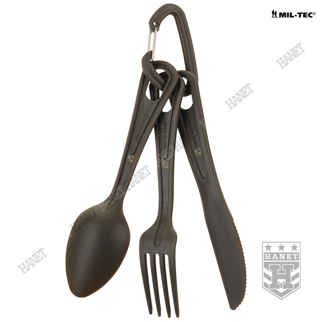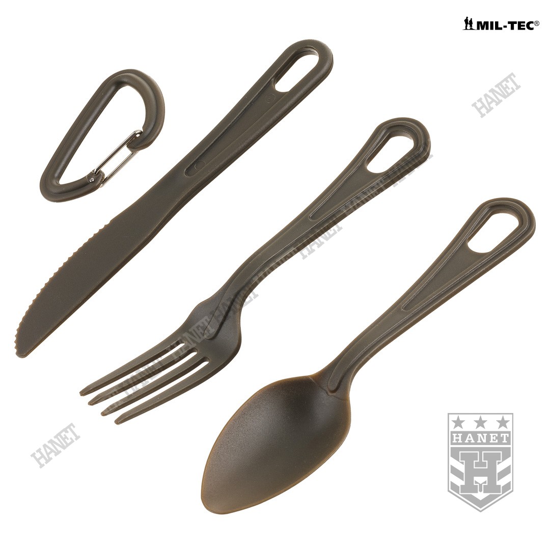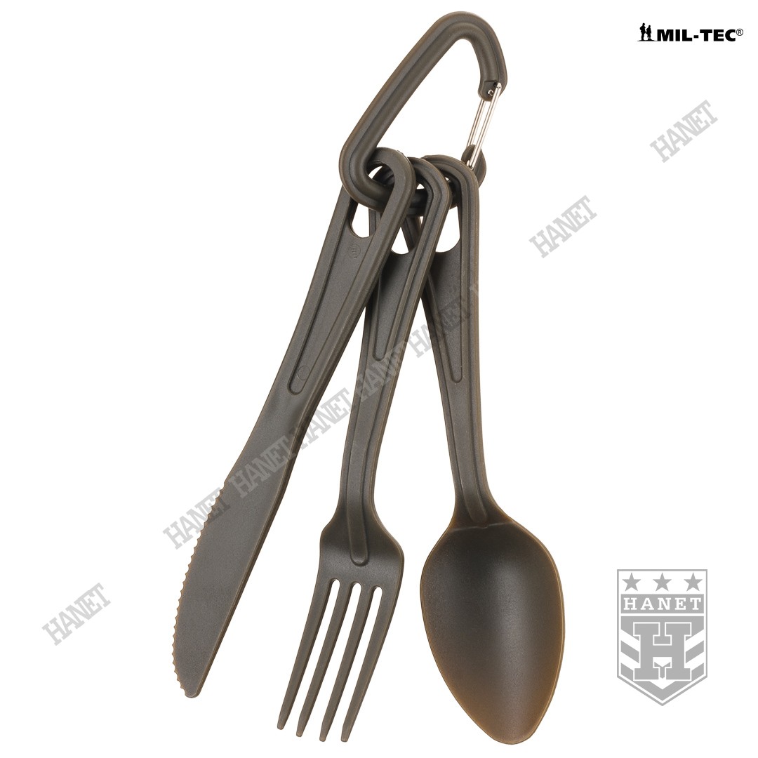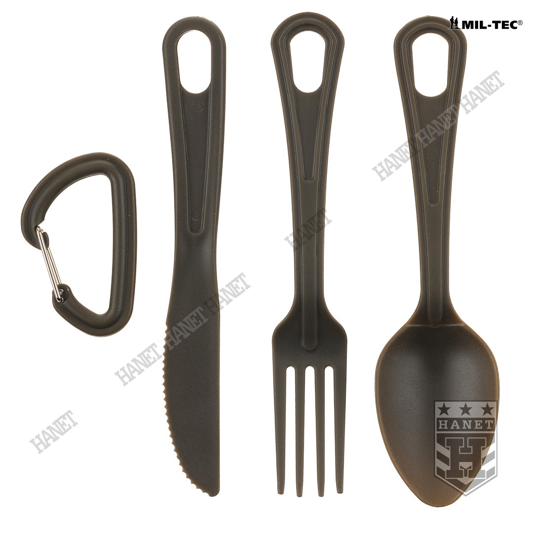 Trzyczęściowy niezwykle praktyczny niezbędnik US Army. Wykonany z plastycznego tworzywa odpornego na skrajne temperatury. Bardzo lekki, wytrzymały i łatwy do utrzymania w czystości, znajdzie szerokie zastosowanie w turystyce, survivalu, na kempingu lub biwaku. Standardowy zestaw sztućców wzbogacony o mały karabinek (karabińczyk). Aluminiowy karabinek w kolorze maskującym nie tylko zabezpiecza przed zgubieniem pojedynczych elementów ale także pozwala na przypięcie niezbędnika do plecaka lub menażki.