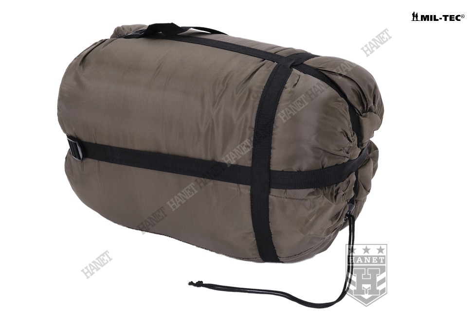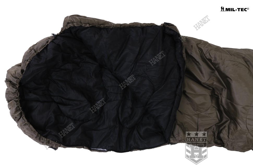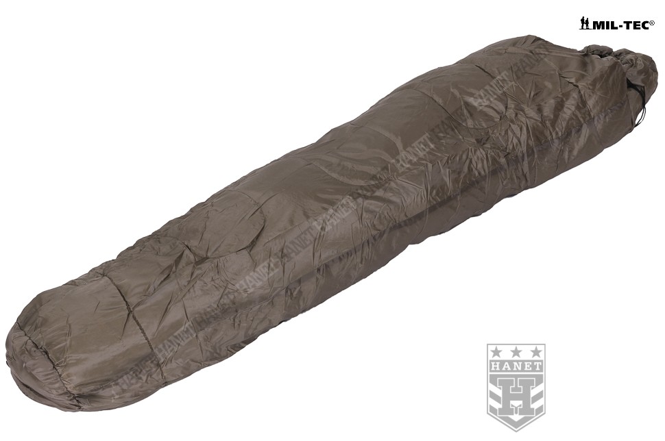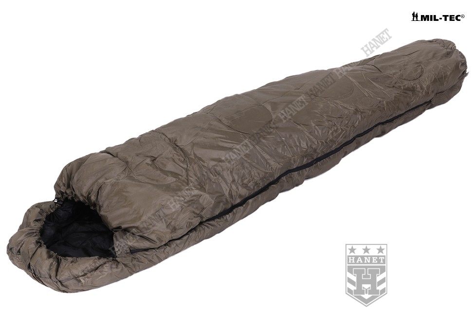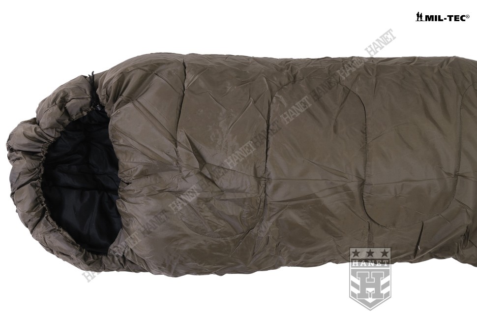 Śpiwór o specyfikacji militarnej gwarantuje bezkompromisową jakość i nowoczesne rozwiązania. Produkt niemieckiej firmy Mil-Tec. Linia przystosowana do niskich temperatur, oferuje komfort nawet przy ujemnych temperaturach. Wykonany z materiałów wysokiej jakości według sprawdzonej technologii. Długoletnie doświadczenia wojska pozwoliły opracować praktyczne rozwiązania konstrukcyjne, zapewniające ciepło i komfort przy niewielkich gabarytach i masie. Typ mumia z kapturem, budowa kanapkowa (dwuwarstwowa). Materiał zewnętrzny 100% 190T poliester - wytrzymały i odporny na zabrudzenia. Powłoka zewnętrzna wykazuje właściwości paroprzepuszczalne a jednocześnie chroni przed wilgocią i wiatrem. Od wewnątrz obszyty wytrzymałym a zarazem miękkim materiałem 65% poliester i 35% bawełna. Izolację termiczną stanowią gęste i cienkie włókna Hollow Fibre, bardzo duża gramatura 500 g / m zapewnia wysoki komfort termiczny w ekstremalnych warunkach. Wypełnienie, stanowi nieprzepuszczalną blokadę dla zimna więżąc ogrzane cząsteczki powietrza. Włókna zabezpieczone przez przemieszczaniem (pikowanie), brak efektu nierównomiernego rozmieszczenia ociepliny. Obszerny kaptur wyposażony w ściągacz wokół twarzy umożliwi zmniejszenie otworu i zaoszczędzenie ciepła. Solidny, dwukierunkowy zamek z metalowym suwakiem daje możliwość otwarcia od wewnątrz i zewnątrz oraz częściowego rozpięcia. Wypełniana listwa termiczna (uszczelniająca) zabezpiecza przed utratami ciepła. Zabezpieczenie przed samoczynnym otwarciem zamka wykonane z taśmy i rzepu. W komplecie worek kompresyjny, jego gabaryty pozwalają na szybkie wepchnięcia śpiwora (bez konieczności zwijania). Worek wykonany z grubego i solidnego materiału. Długie troki kompresyjne pozwolą zmniejszyć objętość śpiwora do kompaktowych wymiarów. Możliwość prania, wyposażony w uszy do zawieszania ułatwiające suszenie.
